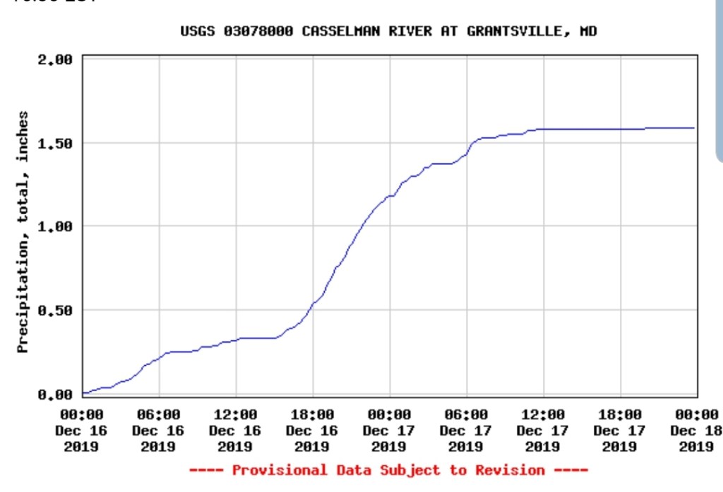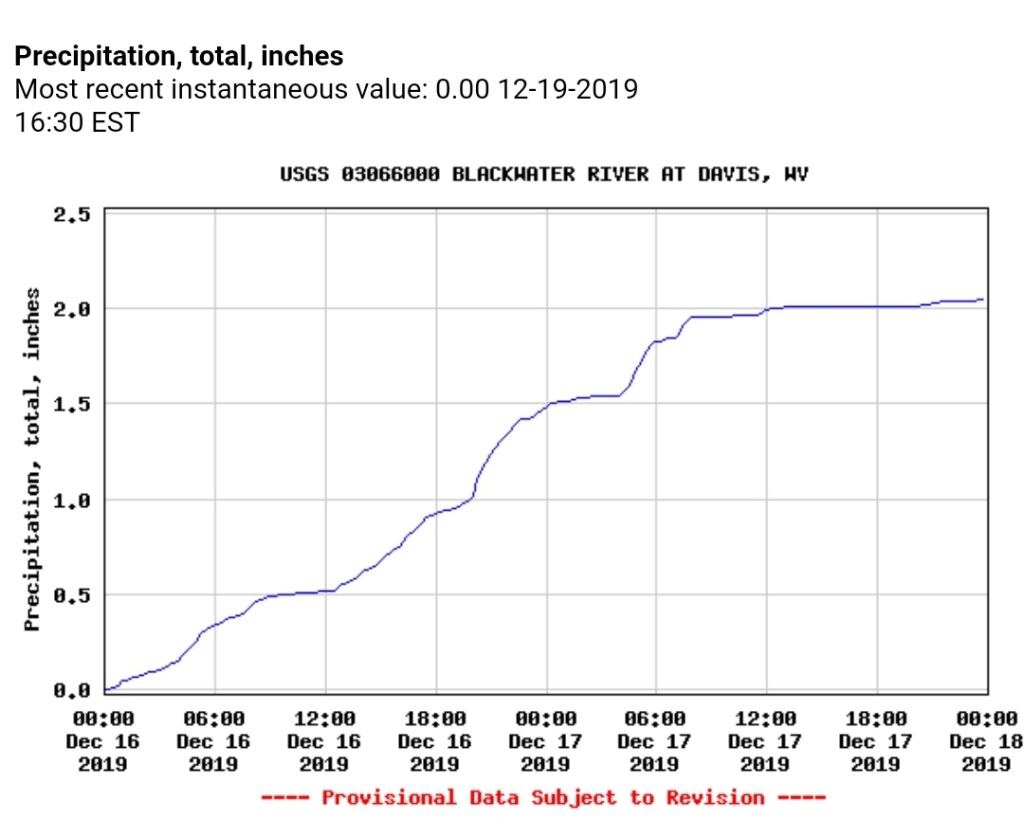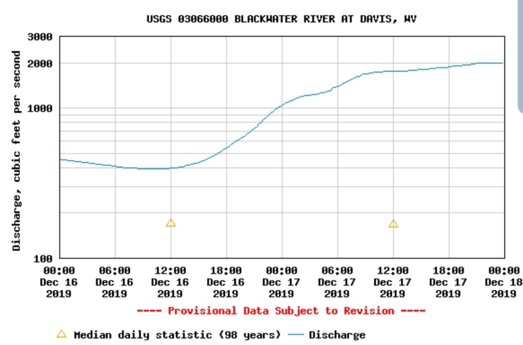 1-2″+ of rain sent area water ways well above typical flow. This occurred even in the ice zones as well, however some of that was limited with a lot of ice remaining on the trees. In other areas, such as Blackwater, flow surged to 2000cfs prior to midnight.