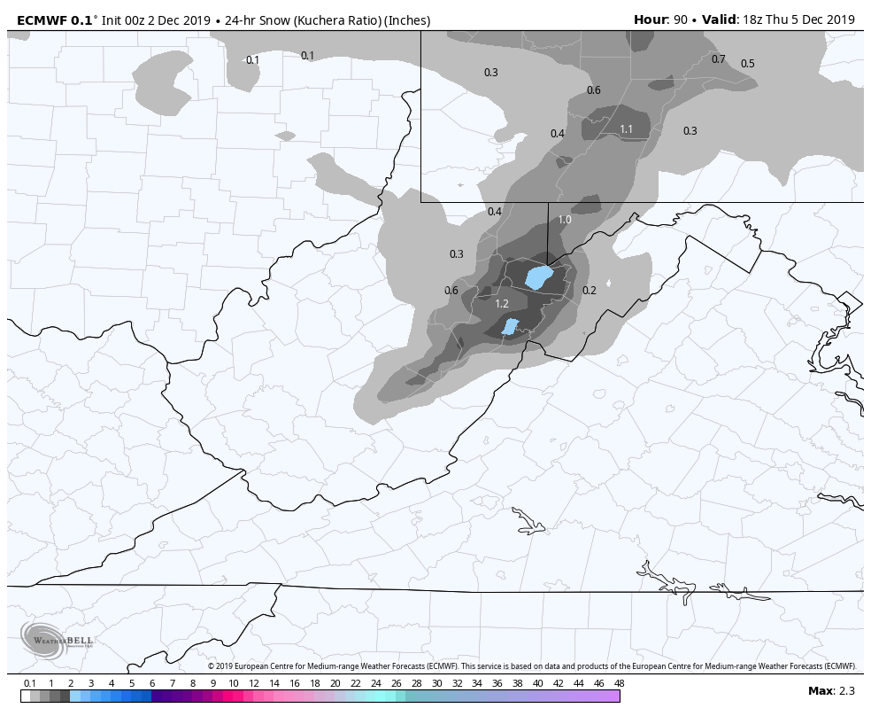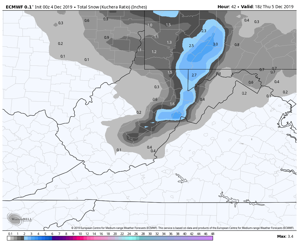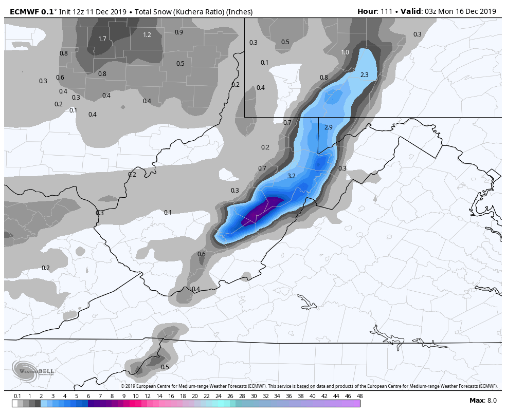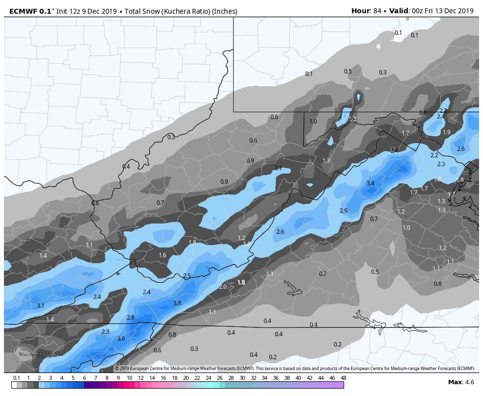 Snowfall amounts Saturday night into Sunday off the 12z ECMWF and 18z GFS
