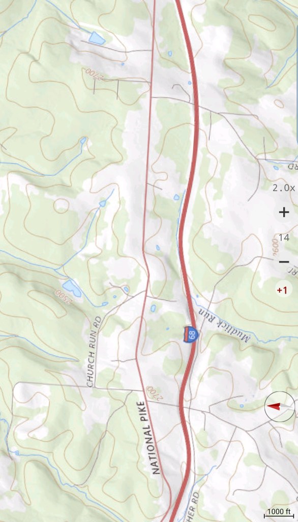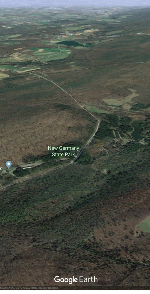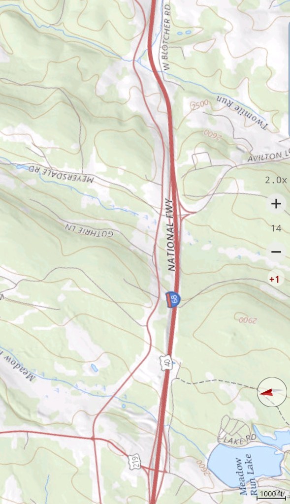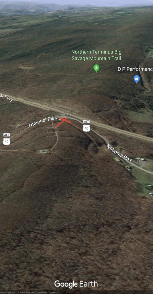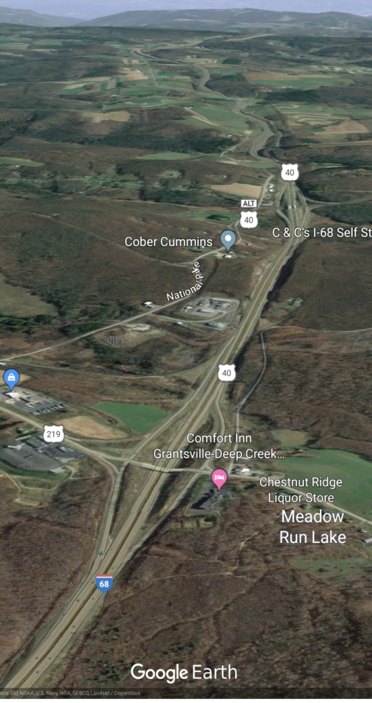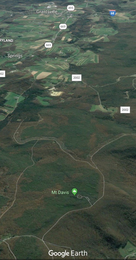 Meadow Mt north on New Germany, then to Rt 40 east of Grantsville via Chestnut Ridge