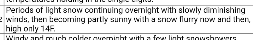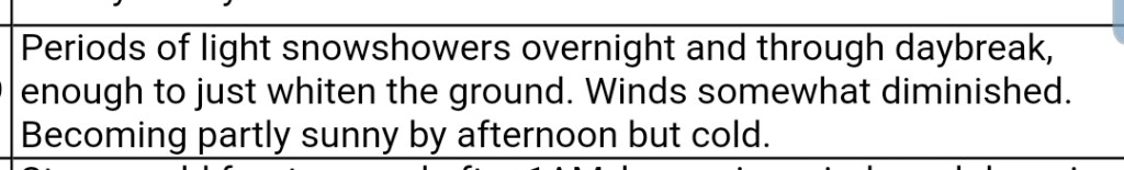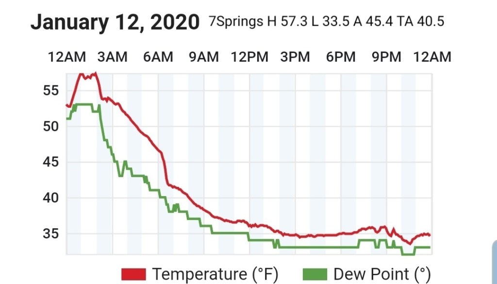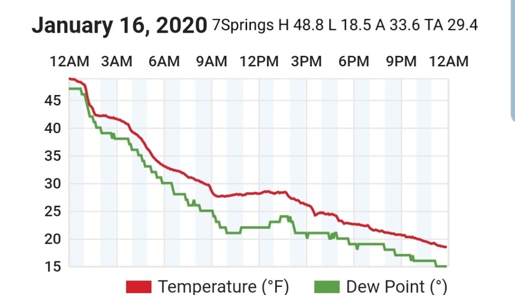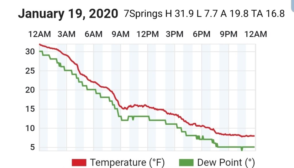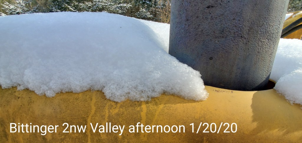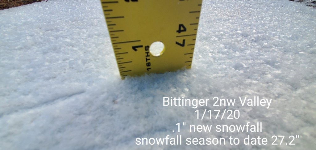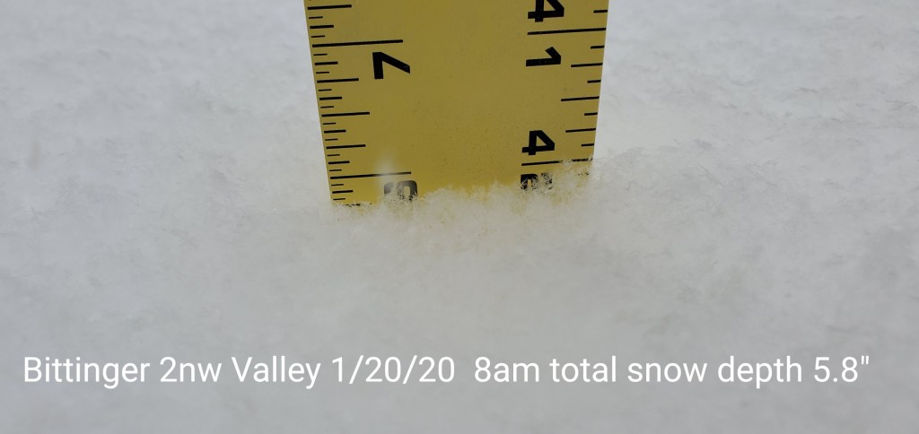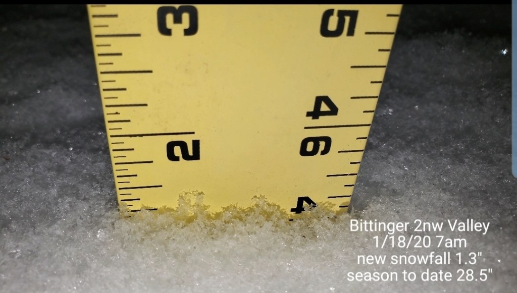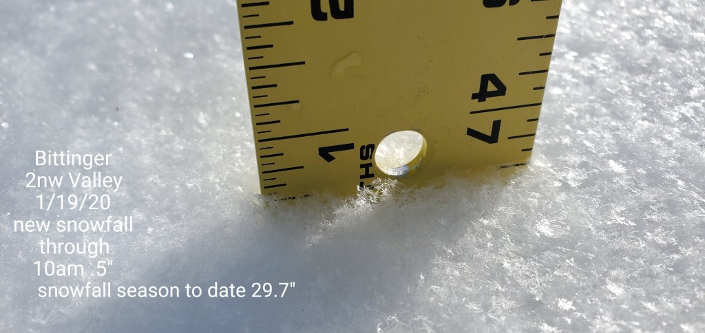 To note- some areas got into the steady fluff and held it all night, some areas did not. This fluff ran 30 to 40 to 1, depending on your location. Ex- if you record in a calm, non wind impacted area, your ratio will be greater as no settling occurs, the flakes just stack up. On a hill, and throw in the slightest wind, your measurement will be lower as this stuff is very easy to break down. It’s mostly air. So an example and this is one of the imperfections in snow measuring. I had 4.2, neighbor on hill 3.0. We got the same amount of snow, no measurement is wrong. It’s simply the fluff nature where its disturbed vs non disturbed. That’s it.