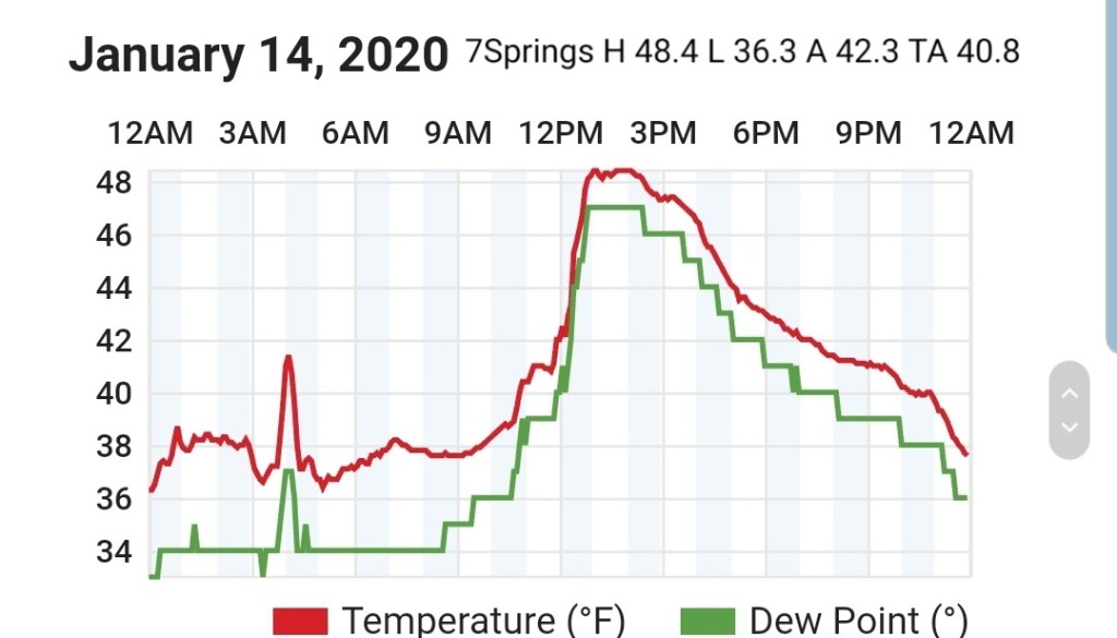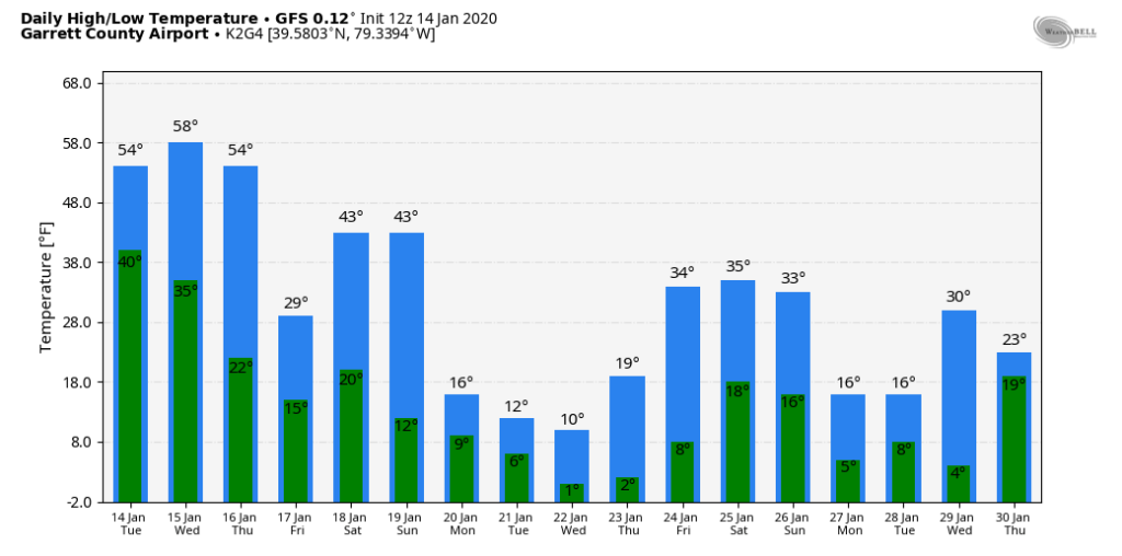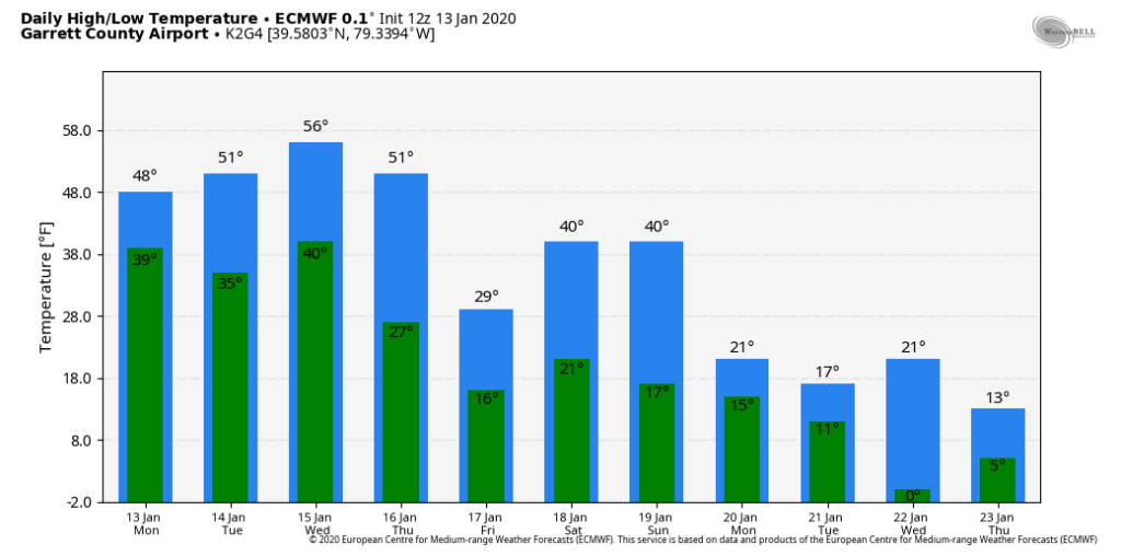 Thursdays highs are predawn, that Saturday-Sunday 40°, if that occurs, that’s a 4-8 hour window and the model sees it occurring near midnight, that’s why you see the double 40° for the weekend in what overall looks like a cold weekend ahead……but check out the temps next week. By then, ski resorts will be needing that in a big way.