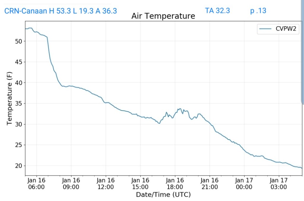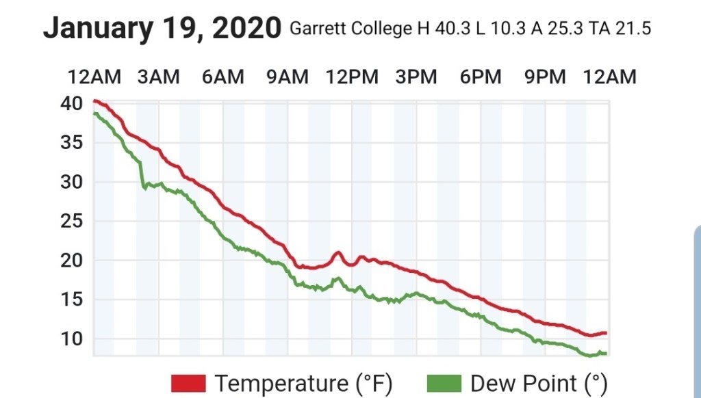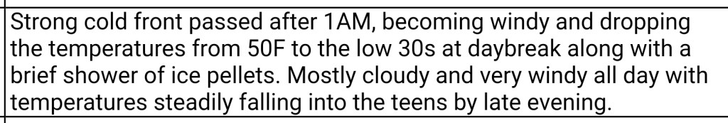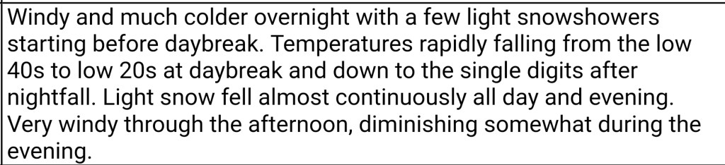 Temps began falling overnight. Strong gusty winds melted yesterdays accumulation in some areas, I retained 1.3″. Which was primarily sleet. A period of snow early morning, a brief break around 10, then that was followed by a continuous fluffy snow through nightfall.