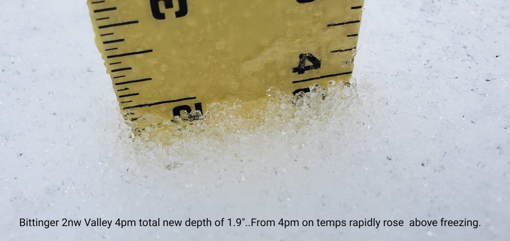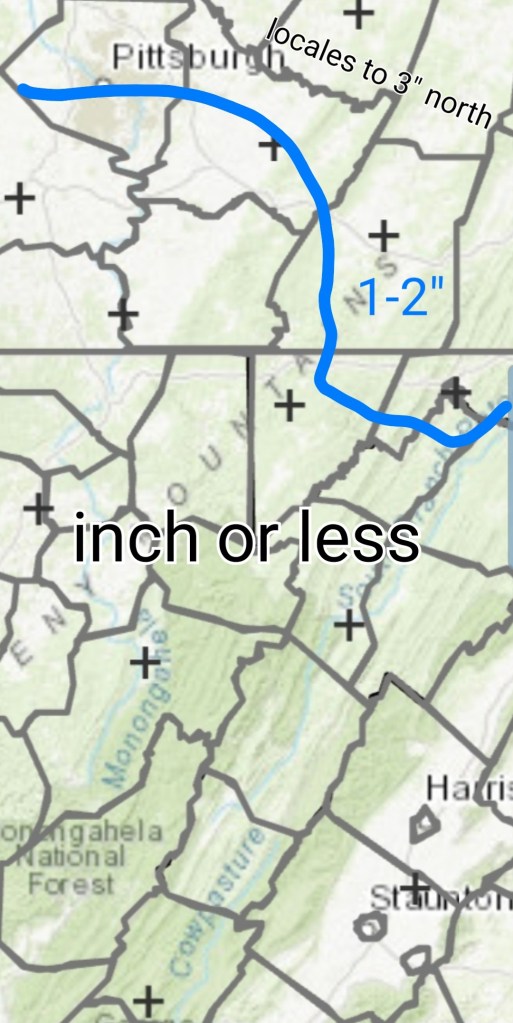 notice 1-2″ at the Somerset/Garrett border where Pitt has 3″+. This includes some into Sunday mornings upslope even and it’s still less.