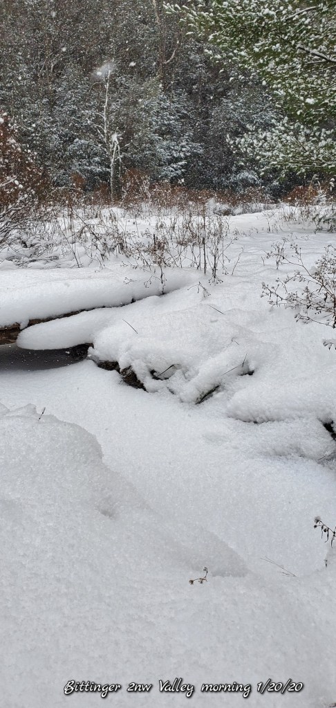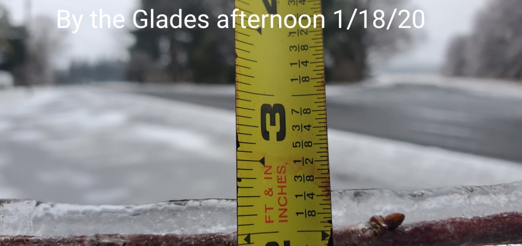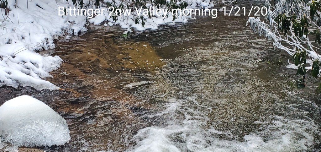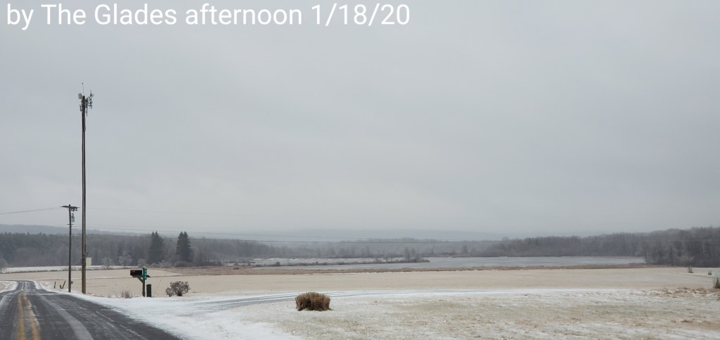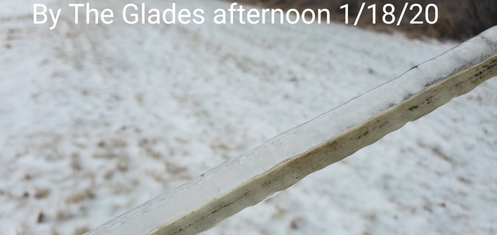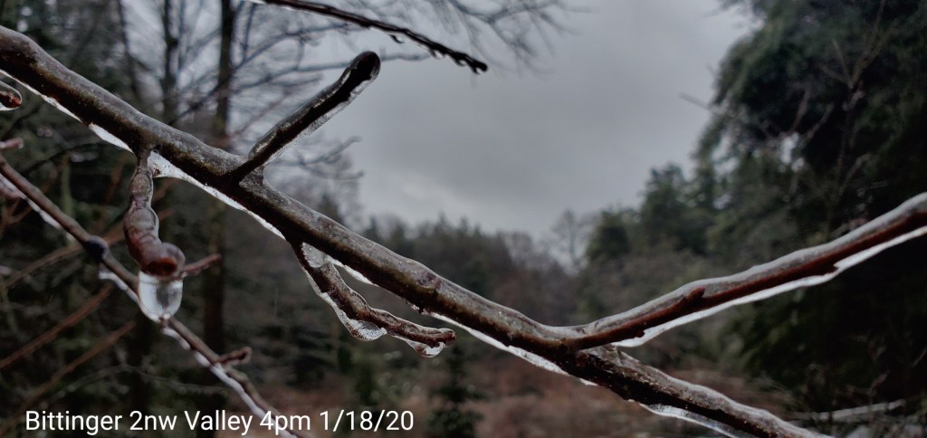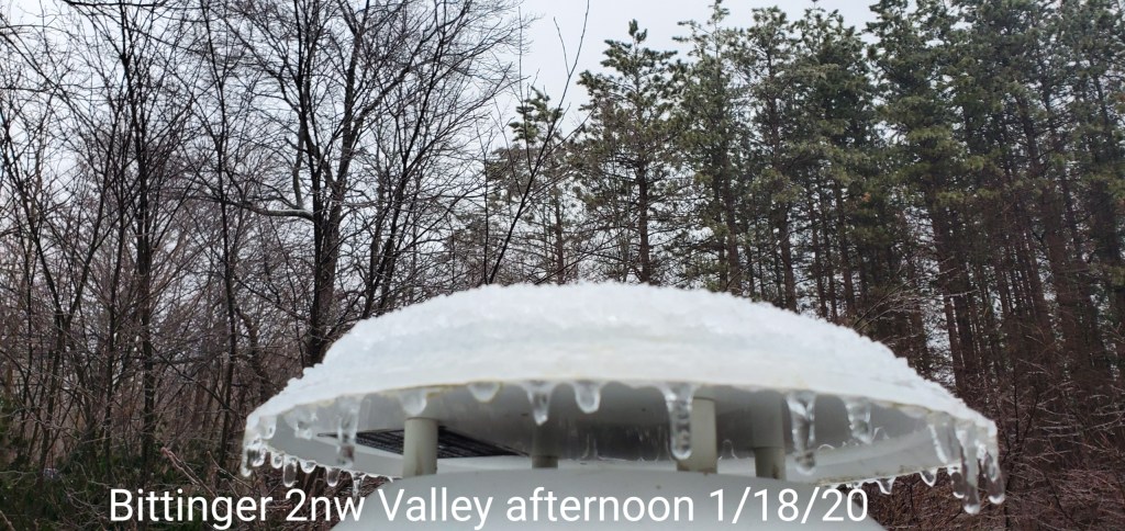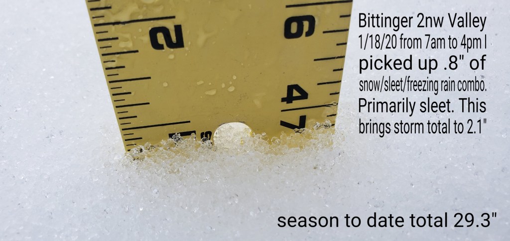Snowfall total new through 4pm at the time temps rapidly rose. If you didnt record at this time, amounts were lost between 4pm and 1 am with the mild temps and very strong wind. Totals- this INCLUDES sleet, freezing rain combo. 2.1″. The morning consisted of a duration of sleet while nearby areas, ex-McHenry was mainly freezing rain, even the Glades more ice vs this spot and less sleet…. 1.3″ occured with the predawn snow, .8 occured through the day with the snow/sleet/freezing rain combo. To show examples of how much sleet, it floats, and floated along the tops of the small creeks