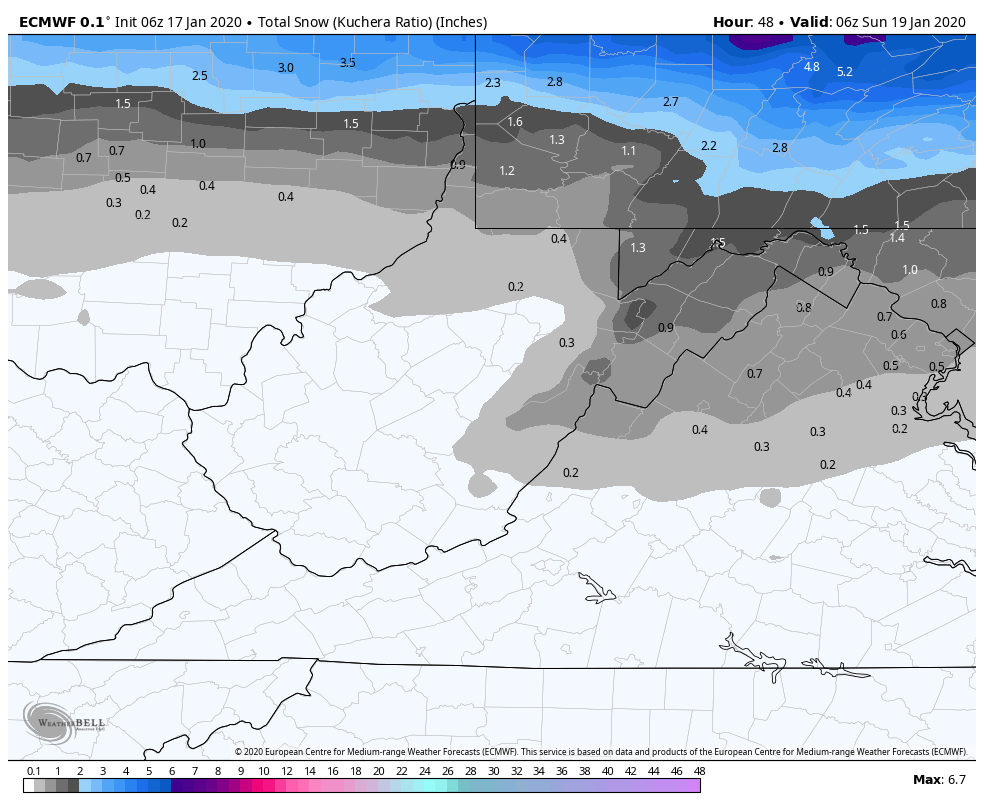 6z ECMWF through midnight tomorrow. Around .3 to .6 of this in areas is wintry precip of some sort before plain rain. Beyond this time period we transition to upslope snow.