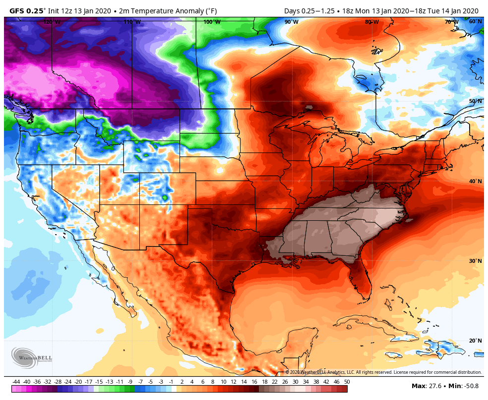 Today’s departures, well above east, with a very cold push into the NW U.S and some of those remaining spots that way that have above anomalies, will be disappearing and turning blue. By Friday the 10-14 day mean will look a lot like some of those mild Januarys used as examples(37 etc)