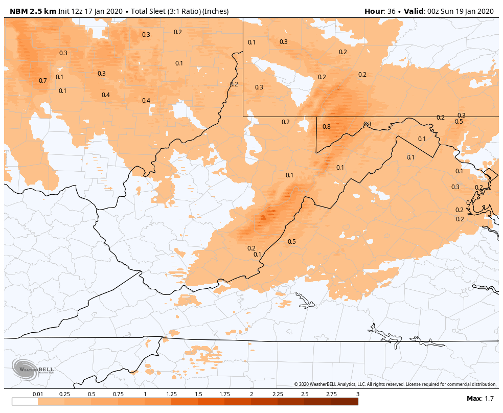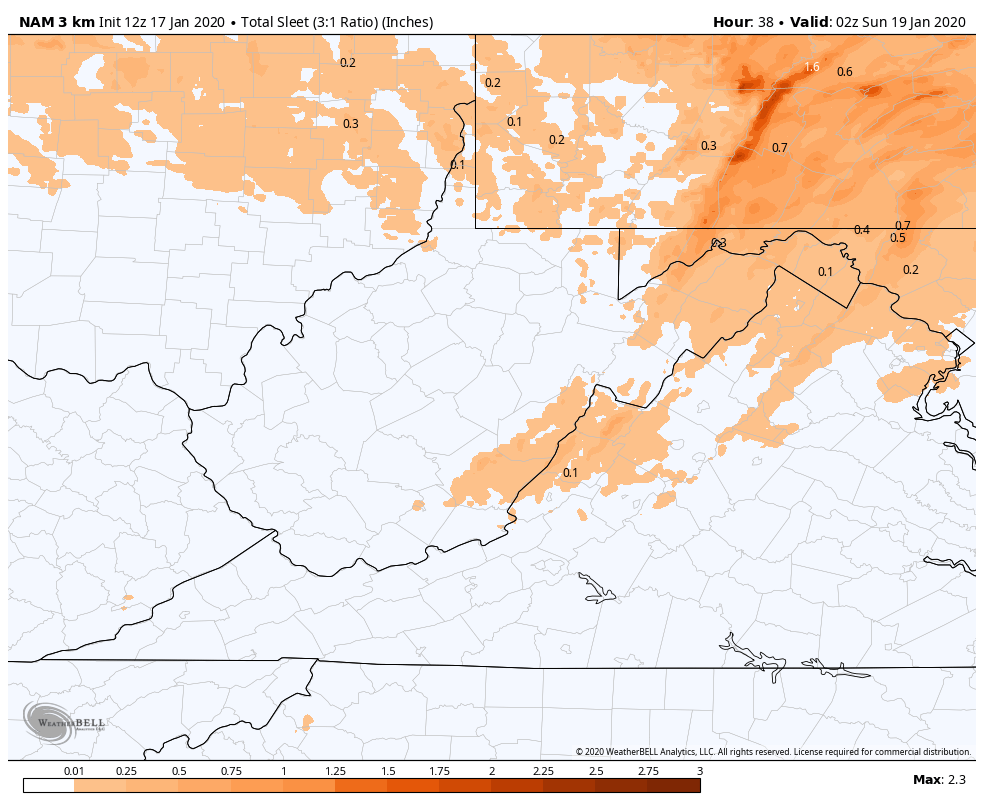 My thoughts… I like what the GFS shows. .3 to .6 sleet in areas with longest duration. Remember sleet does not accrete to objects, its frozen droplets that bounce.