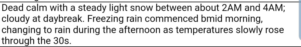 After a brief hit of snow predawn, the day began with a lull. Then after 8, some snow began, that rapidly changed to sleet, then freezing rain and location played a role of when and how much. That went to plain rain late day, with the exception of the deeper valleys east.