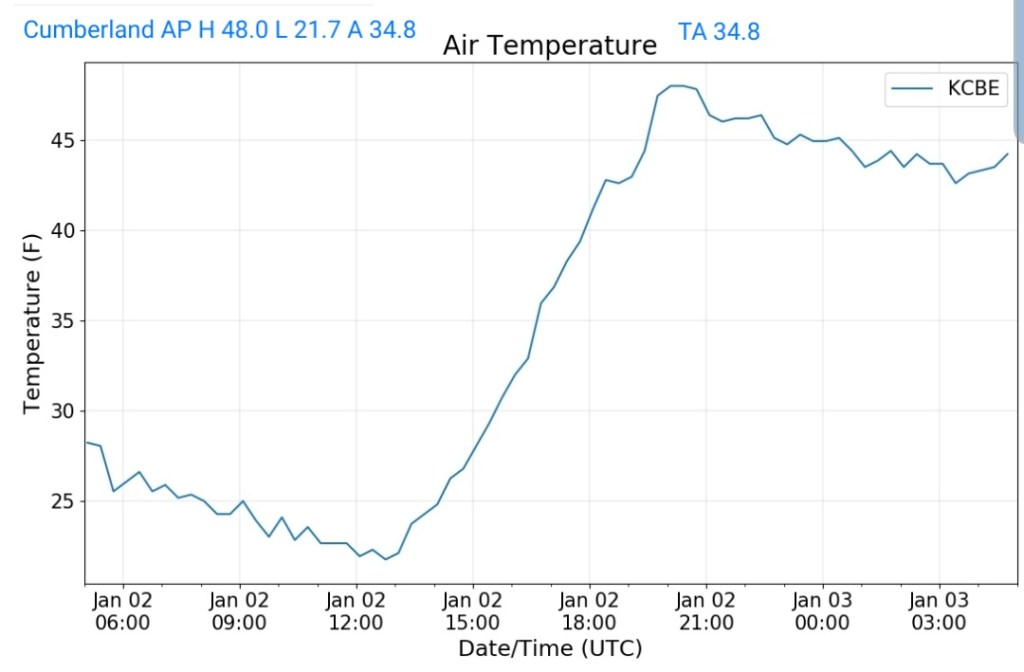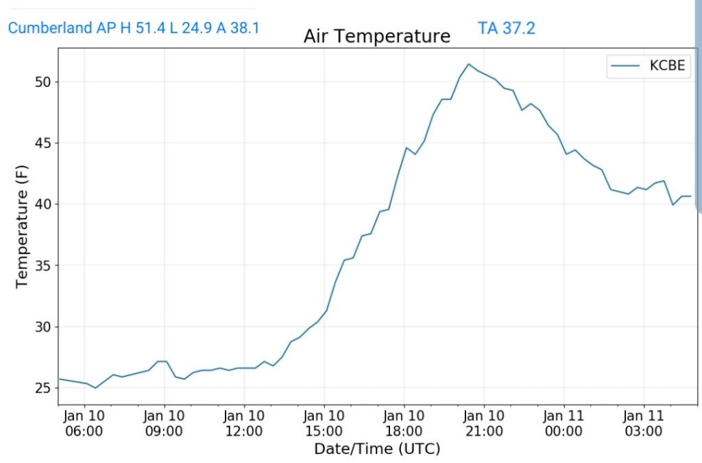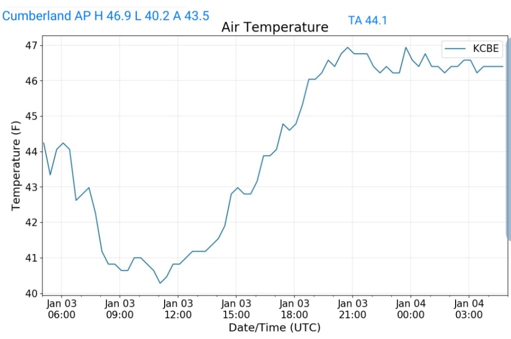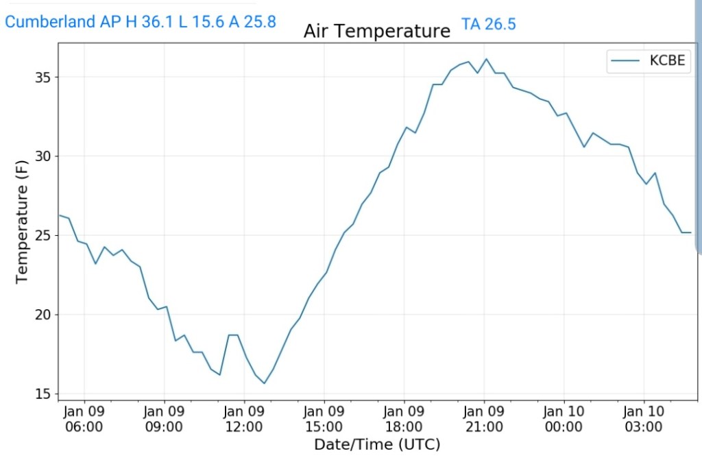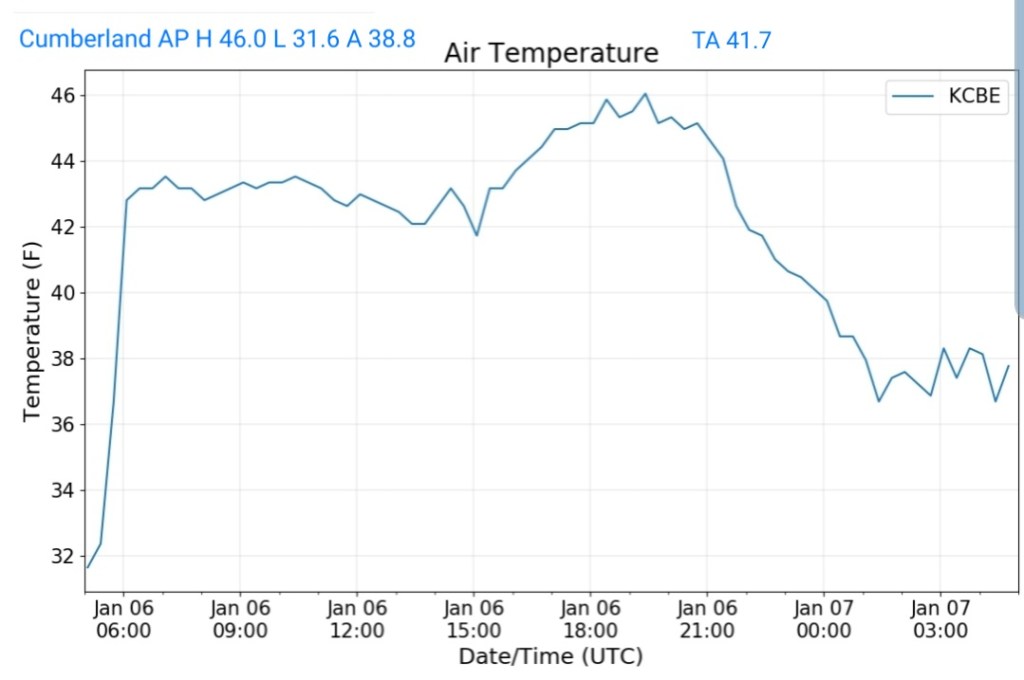 Milder air mass pushing across the area. Some holdouts in the deeper valleys from Savage River, Lonacoaning, Lavale , Cumberland clinging to slightly chillier air from the departing air mass. A few scattered showers in the area this afternoon, mainly western areas.