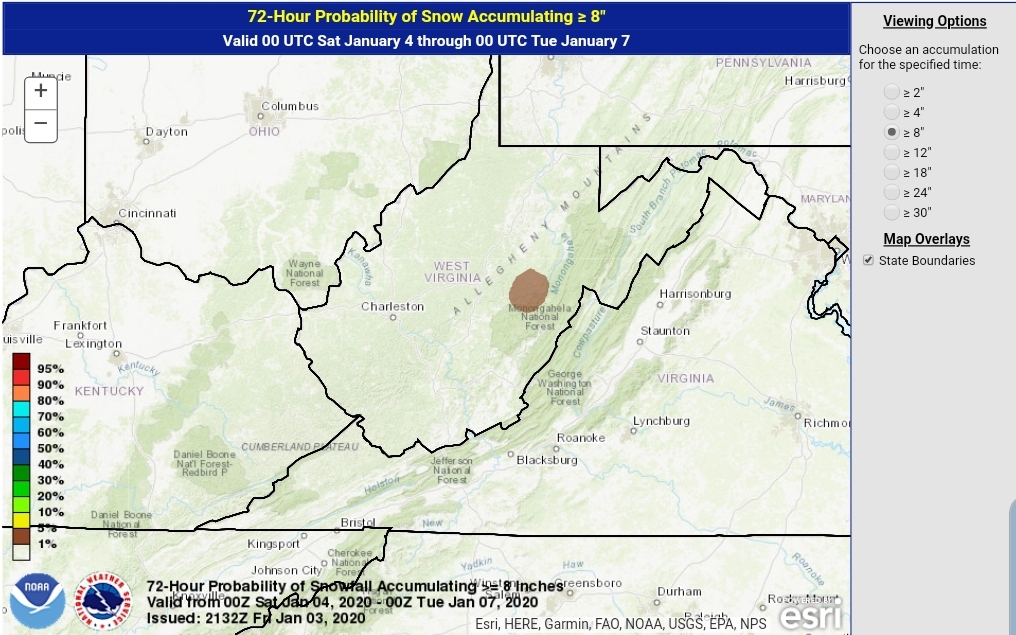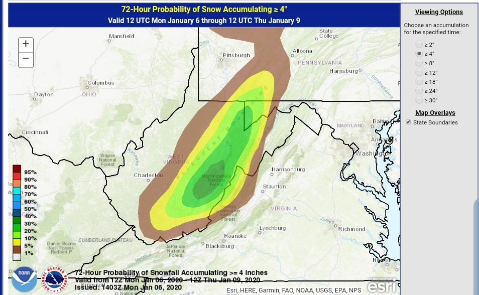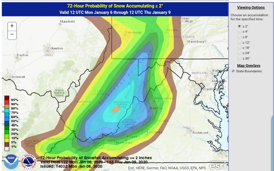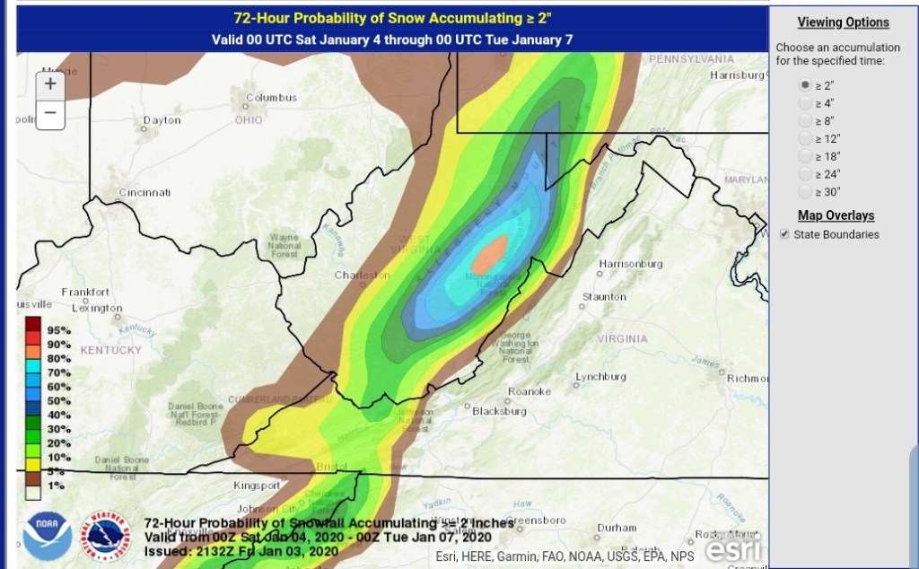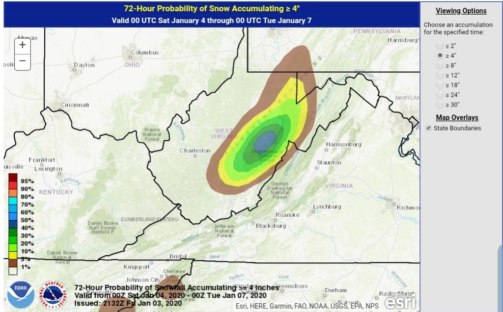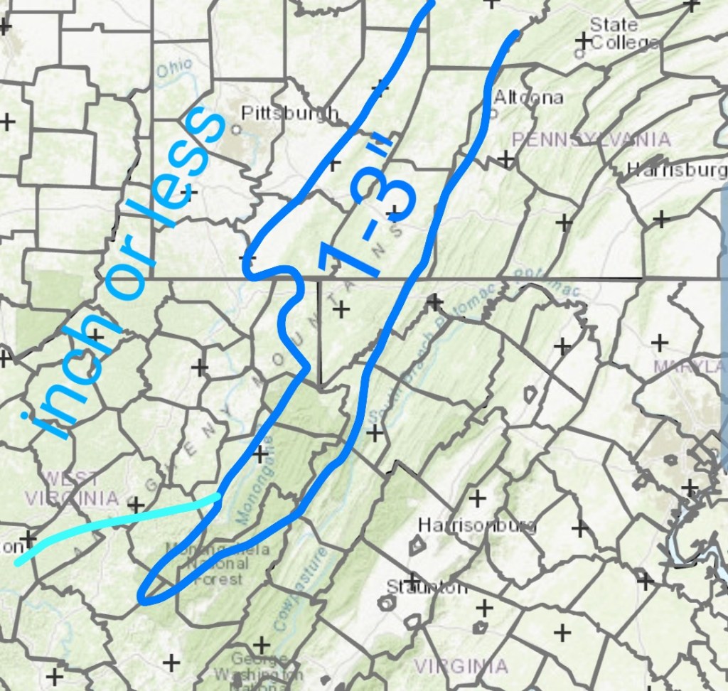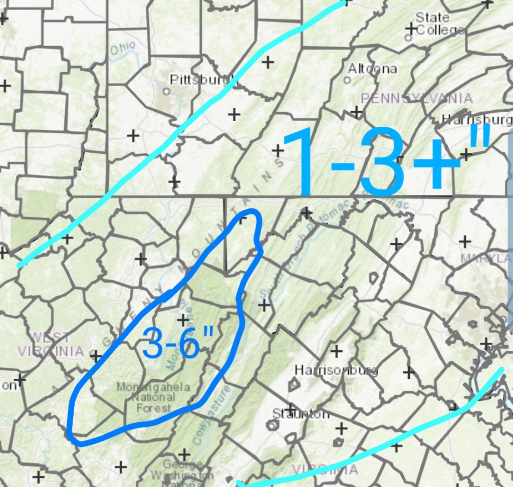 After a lull today, tonight, snow returns to the area tomorrow with a system from the SW, pressing through with a bullseye 3-6″ zone. (As always lean low to mid range, a good performance gives the top range) across the Wv mts, with 1-3″ outside that bullseye zone. There is some variance on the northern edge of the system.