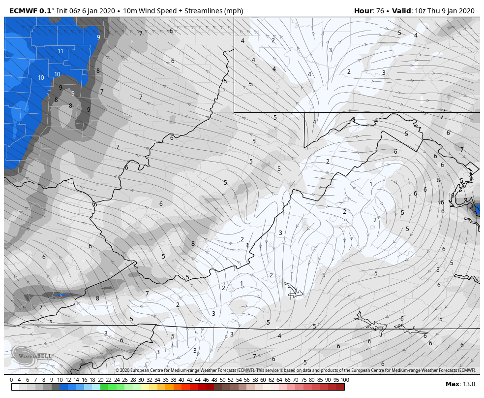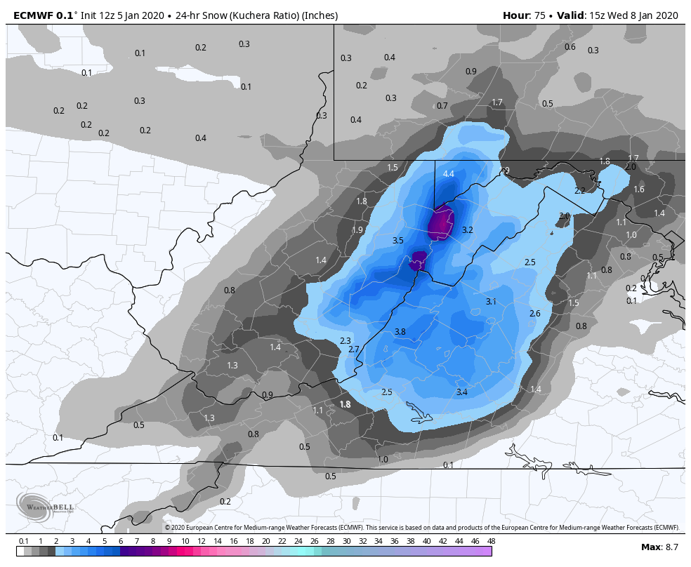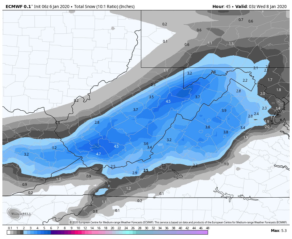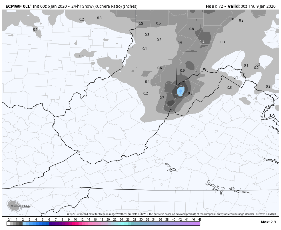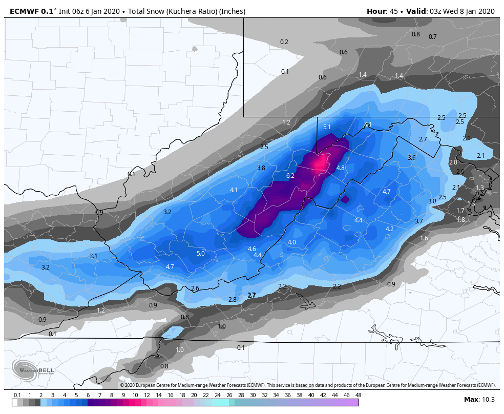 6z ECMWF 10 to 1, through 10pm Tuesday. This is likely a little over 10 to 1 across the high ground. I elected not to use Kuchera parameter as I believe Weatherbell needs to make another adjustment to that parameter.