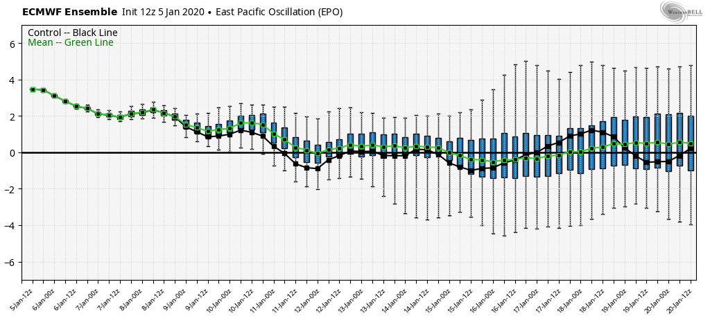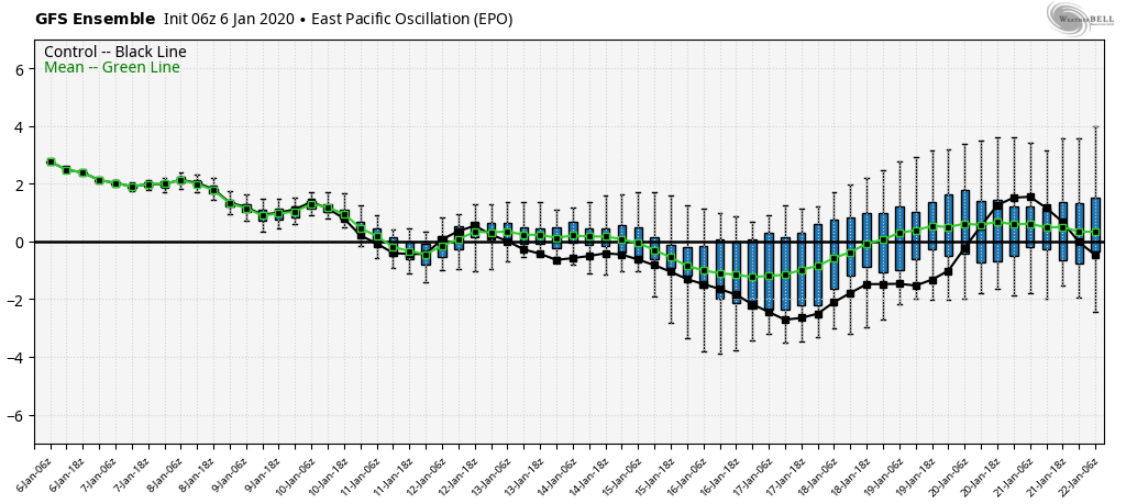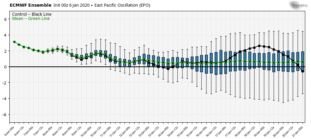 the lone help next week may come from the EPO. The ECMWF holds it neutral to positive, but the GFS takes it negative. That allows cold to push some…lots of resistance though in that SE ridge. Any coming cold over the next few weeks looks very brief and in and out rapidly.