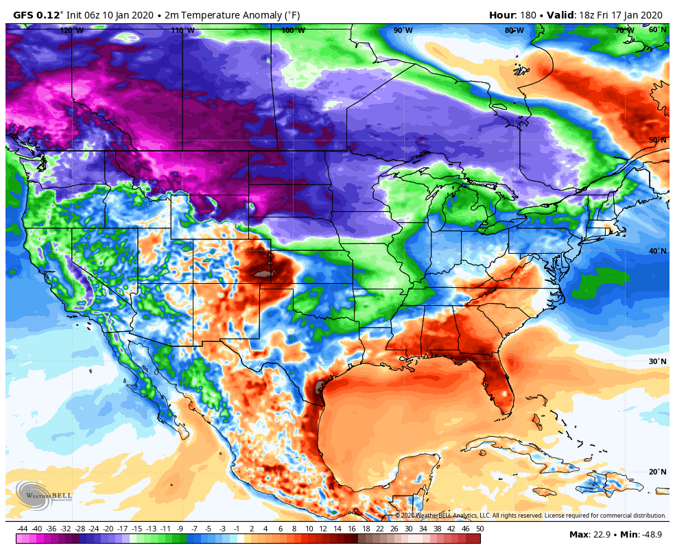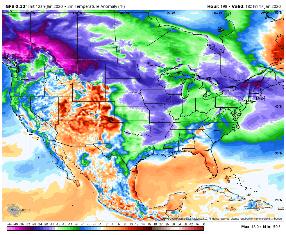 With the 5th through 9th winter window in the books that produced 2 of the better snowfalls on the season in parts of the area, now we go into a lengthy stretch of much above normal temperatures. This looks to run for the next week. Modeling hints at a return to cold weather late next week. To what extent, remains unknown. Initial shot looks brief, and weaker vs what it did appear like on the GFS. The GFS was going crazy with the cold on yesterdays runs and lots of sites were screaming wait until late week, bitter cold! For good reason by going off the one model. This was the GFS yesterday mornings run showing for next Friday morning temp anomalies