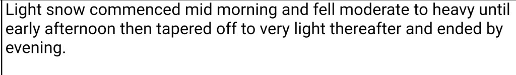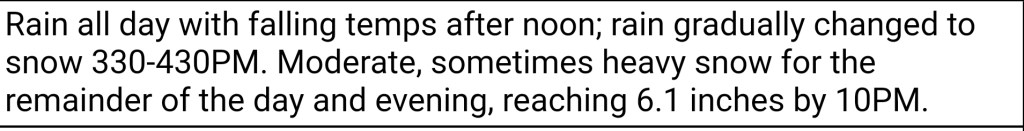 Cloudy start with snow rolling in around 9am rapidly covering things. The main accumulation occured from 9am to 1pm, with some additional through 4pm. Calm during the snow, winds increasing after nightfall.