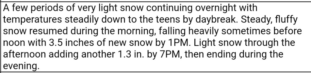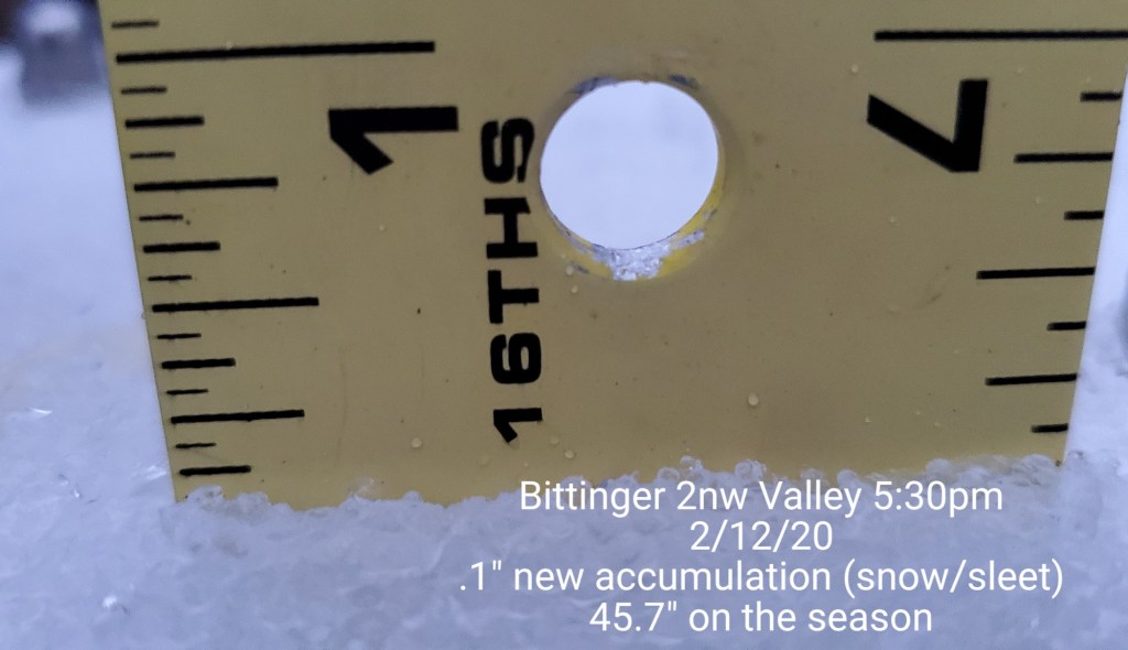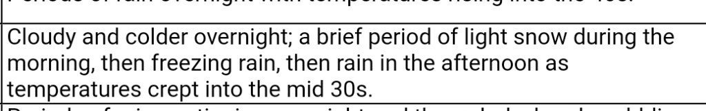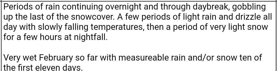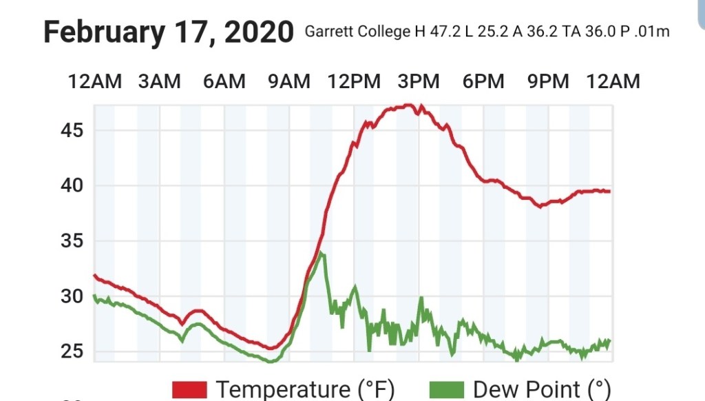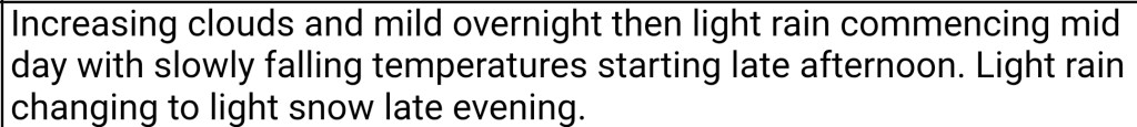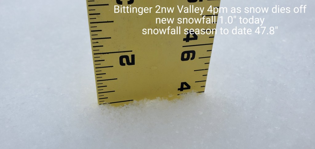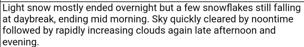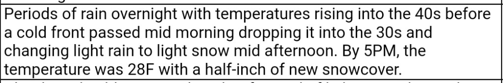 A dry start with some rain pushing in. The air mass remained dry enough that the light coating of snow from yesterday morning remained into the morning hours in a few spots. A rainy afternoon but nothing heavy.