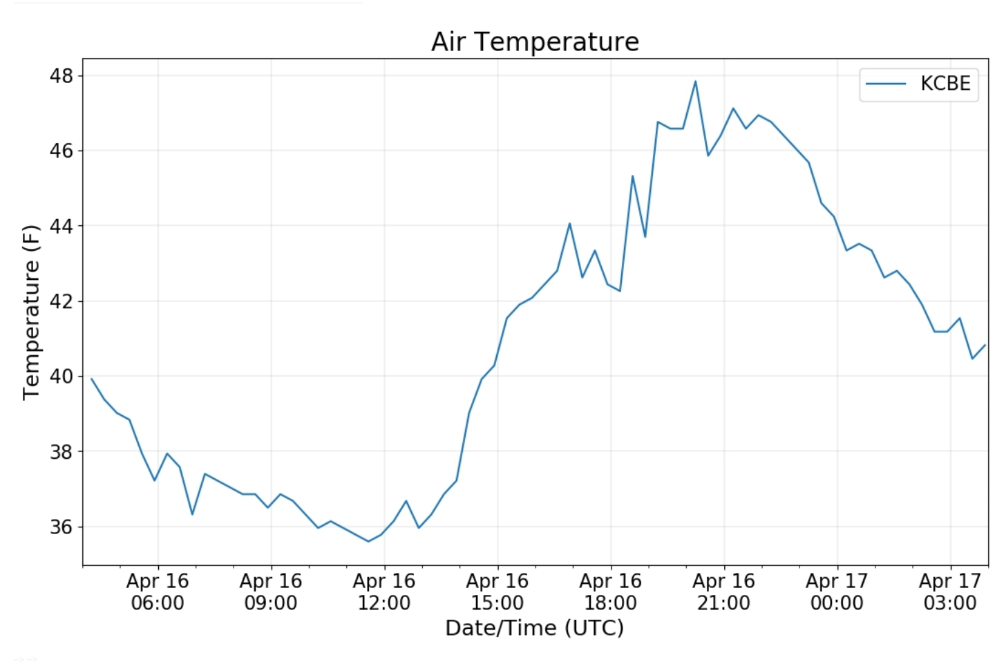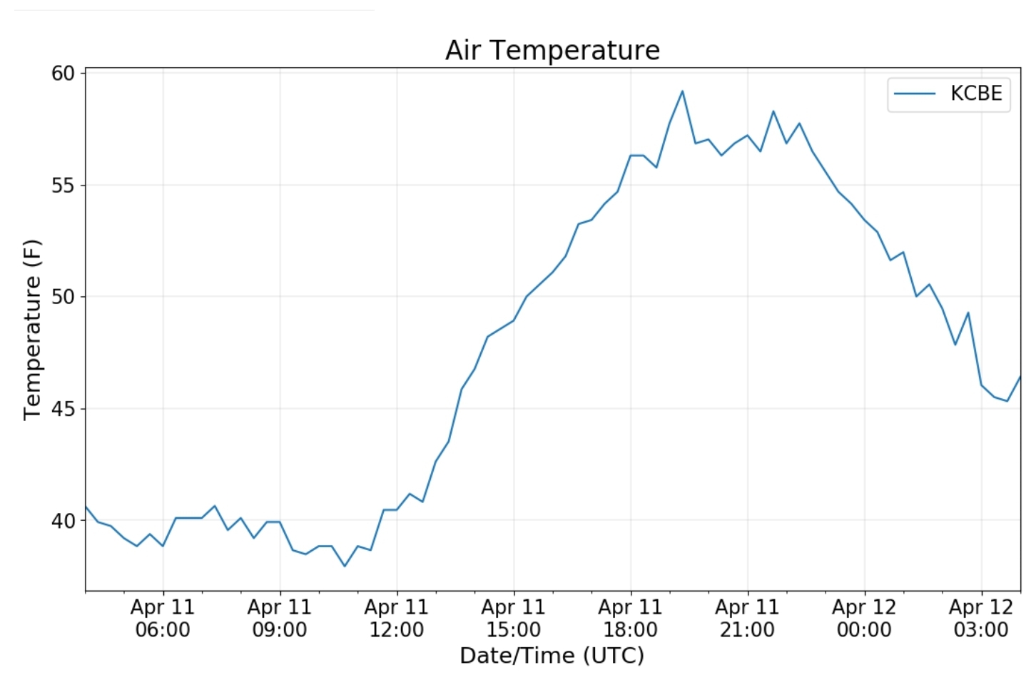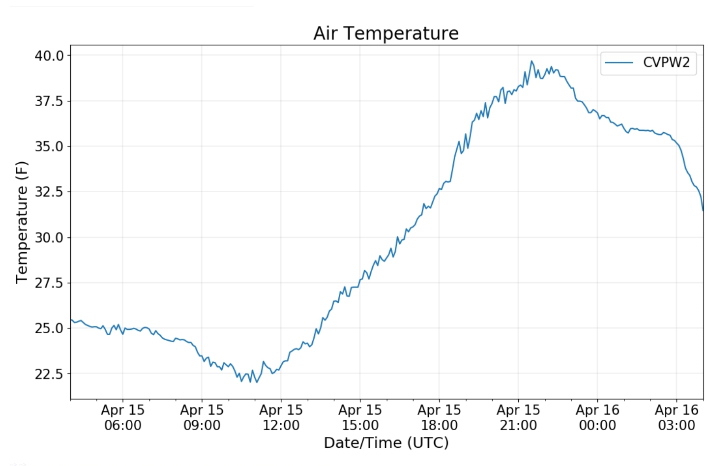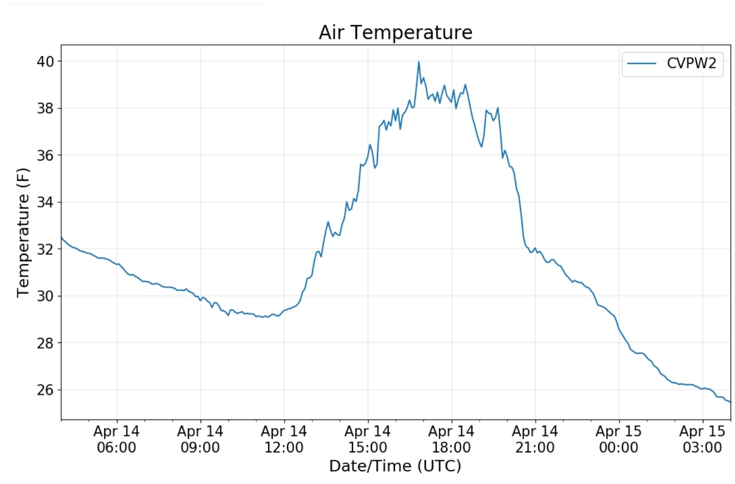 Mostly cloudy, cold, dry air in place, snow began early afternoon despite temps near 40°. Ground covered by evening .