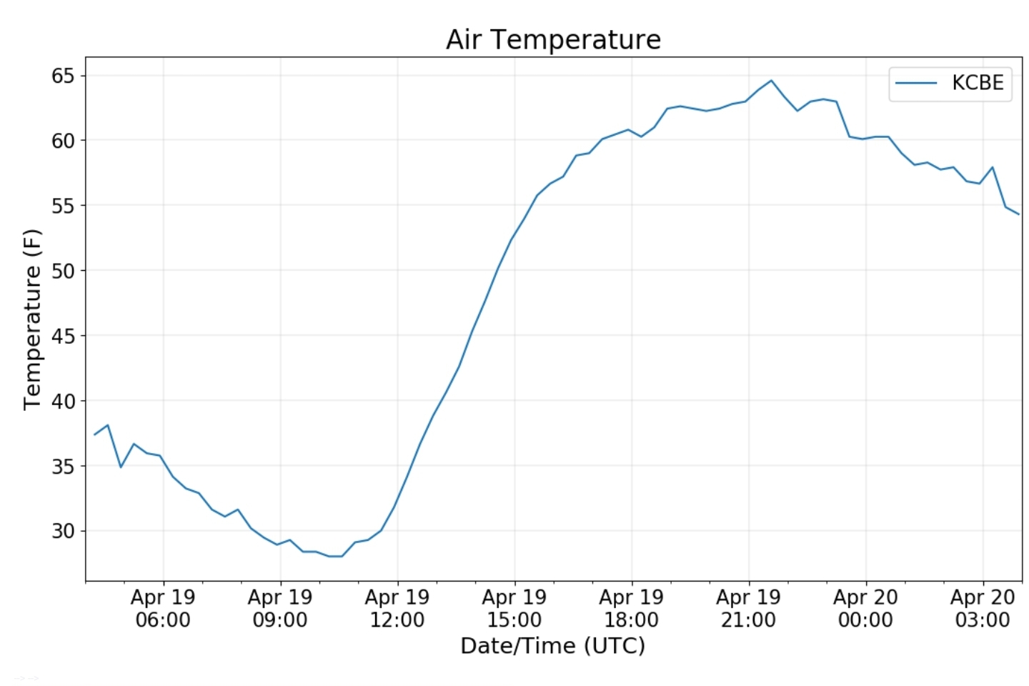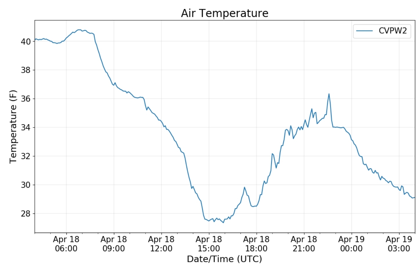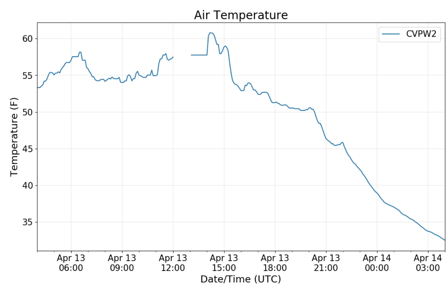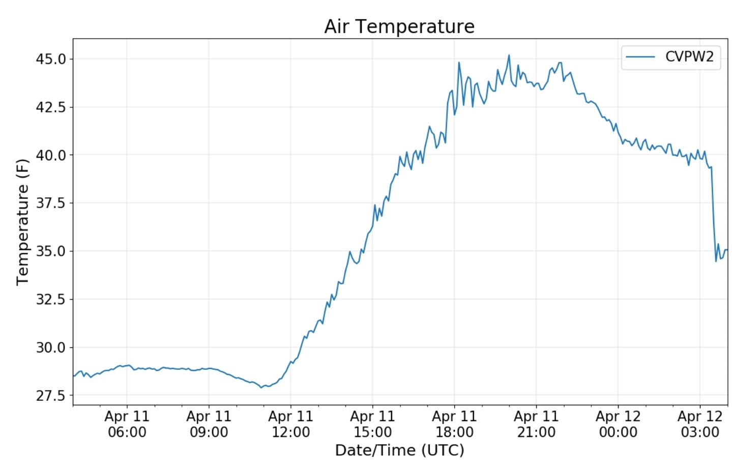 Mostly cloudy, cold, dry air in place, snow began early afternoon despite temps near 40°. Ground covered by evening .