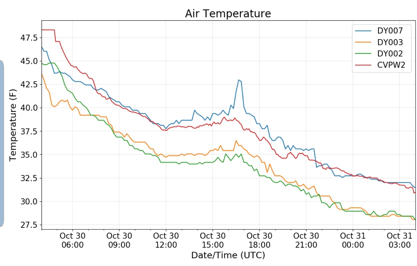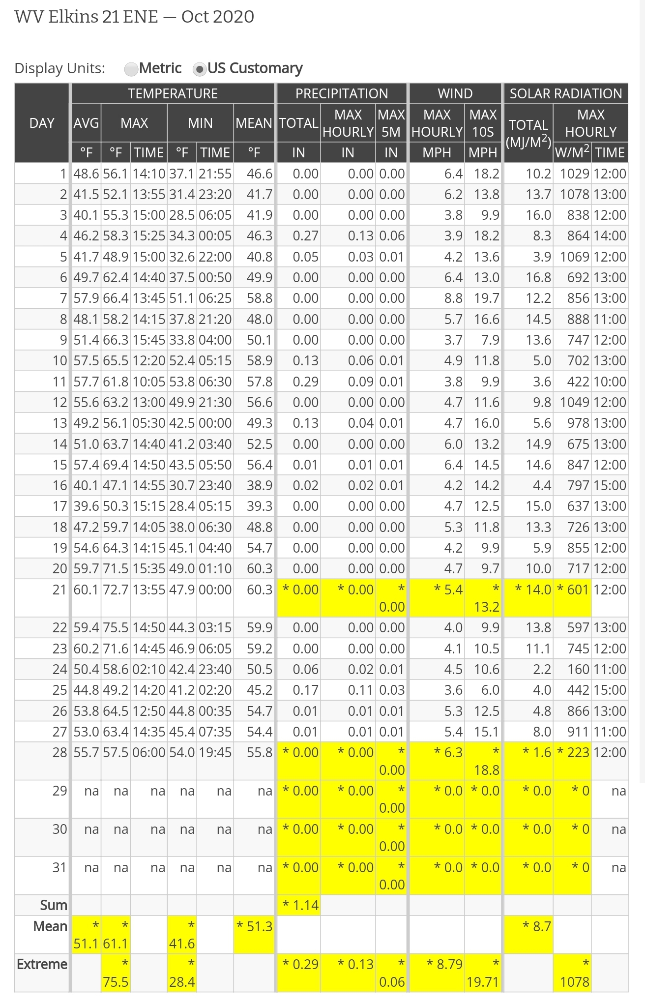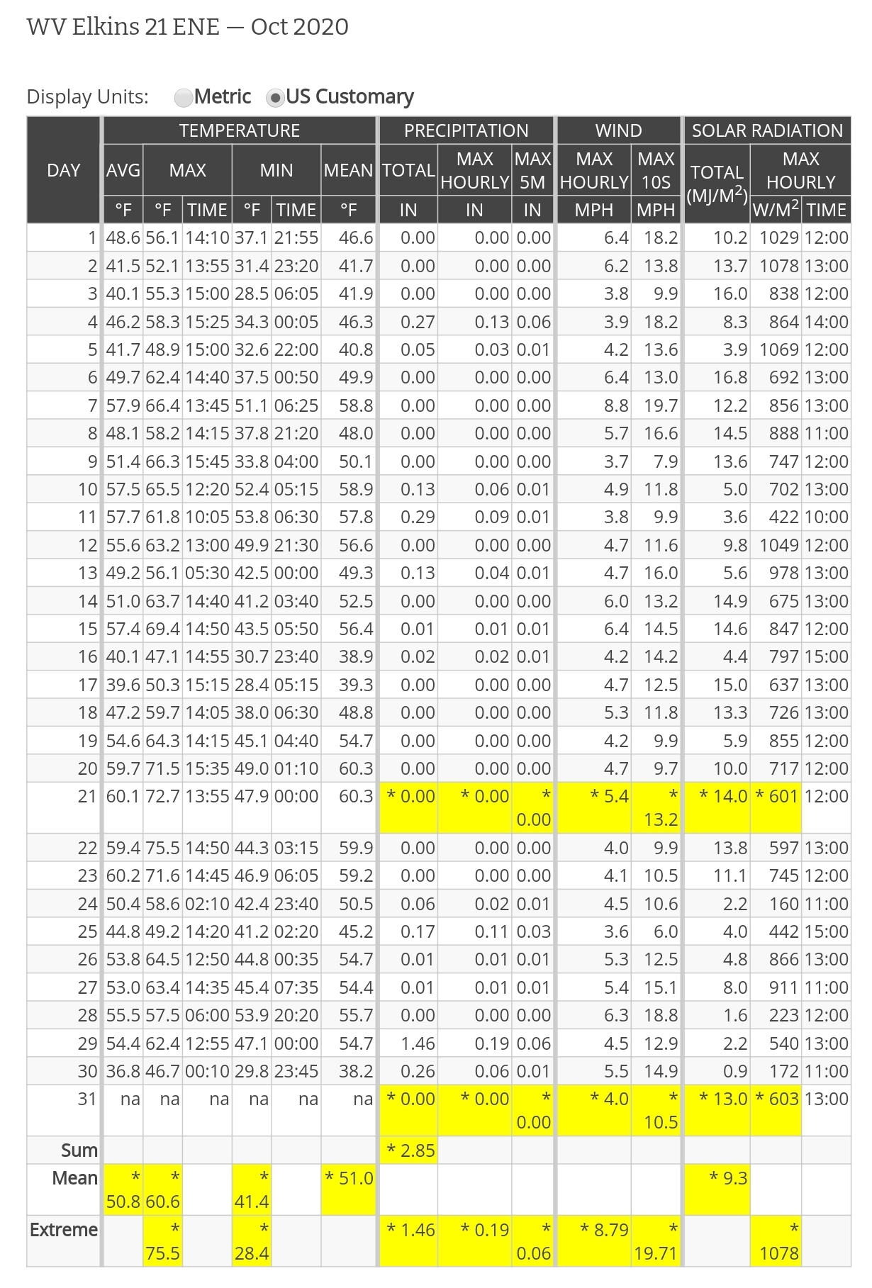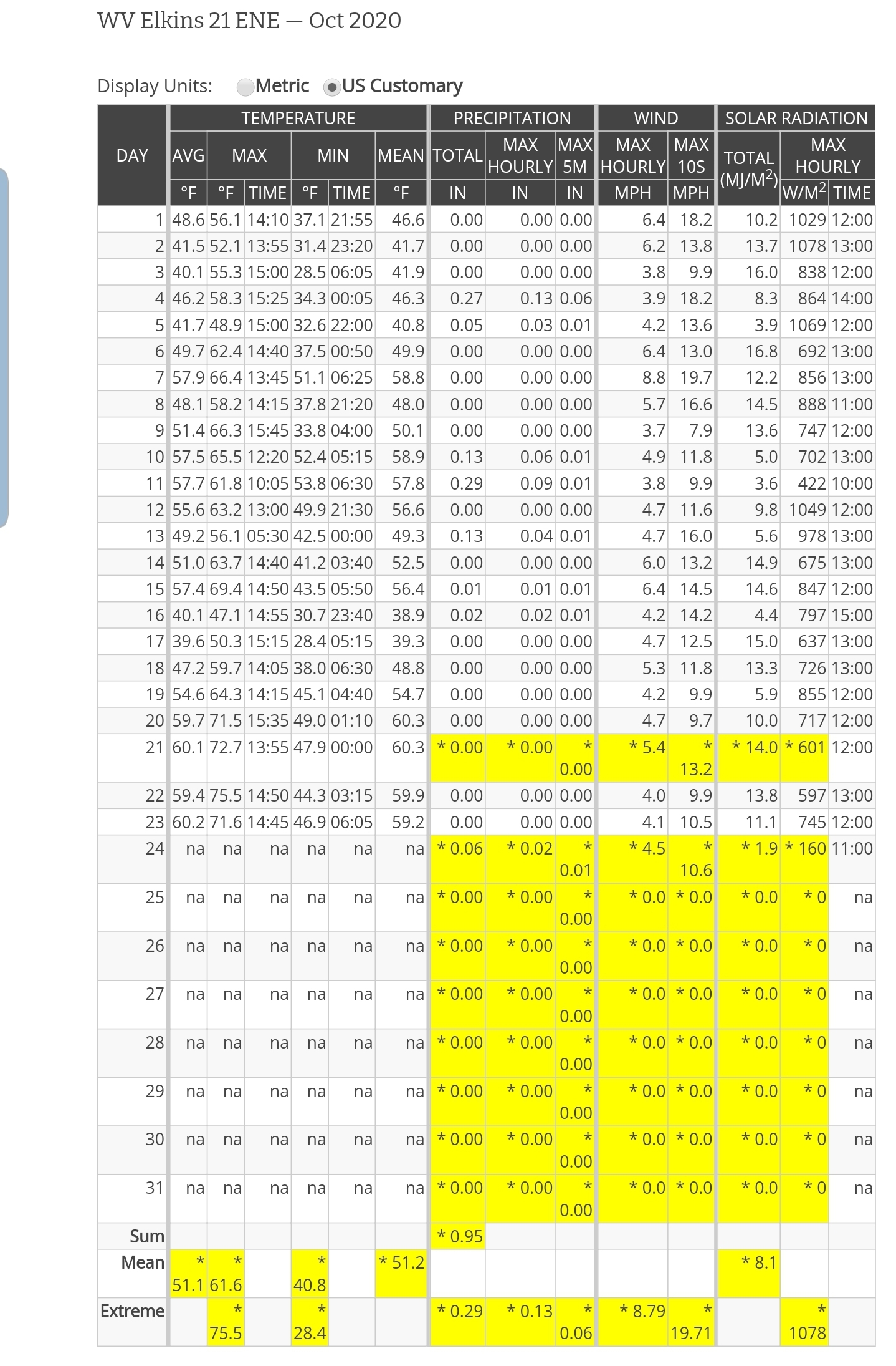 Dy007-Canaan Valley Refuge 3150′, Dy002-Cabin Mt at Bald Knob 4350′, Dy003-Cabin Mt/Sods 4035′, Dy004-Spruce Knob 4820′, Cvpw2-Climate Reference Network Canaan 3479′, KW99-Petersburg Grant County Airport 961′