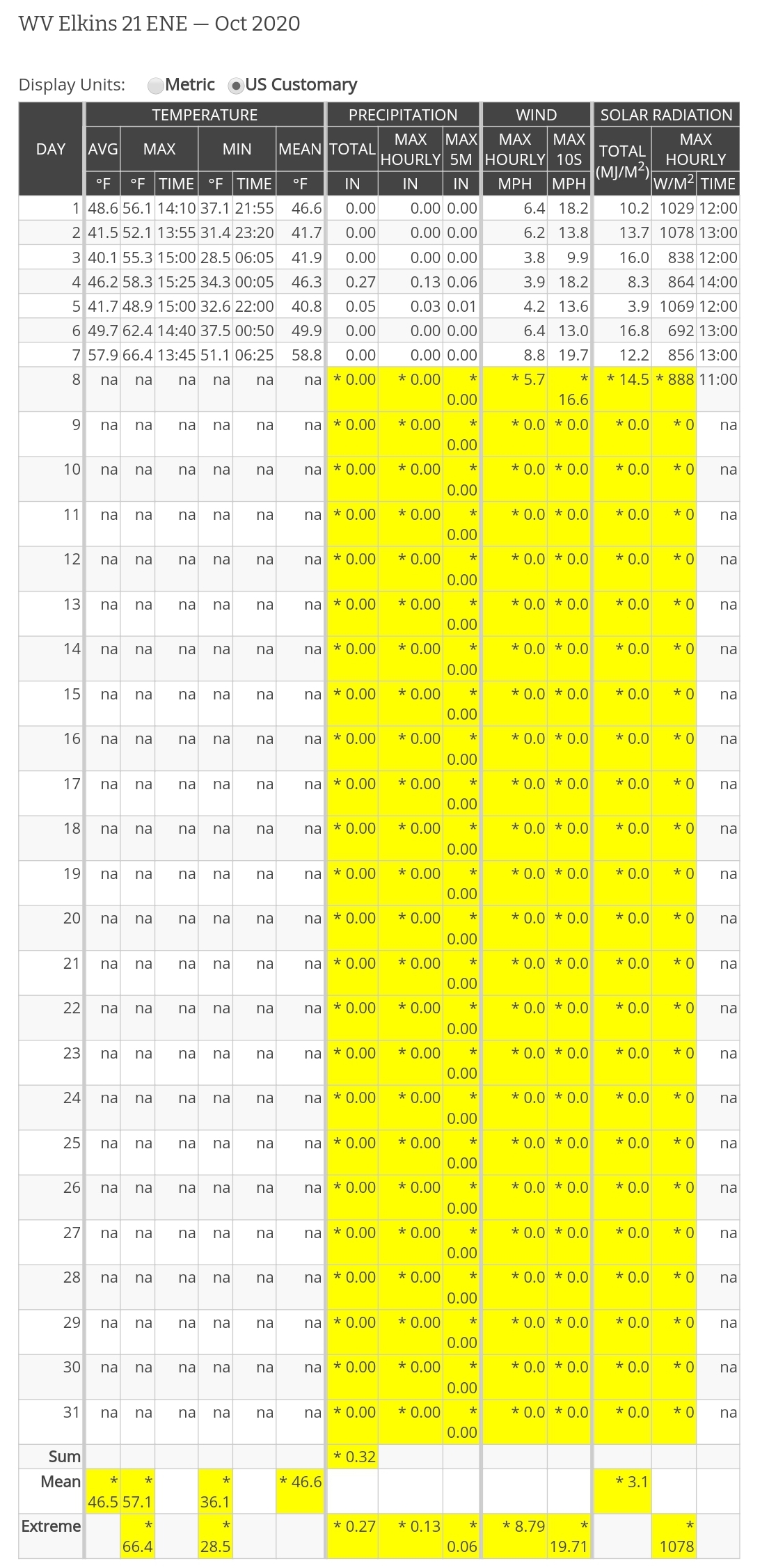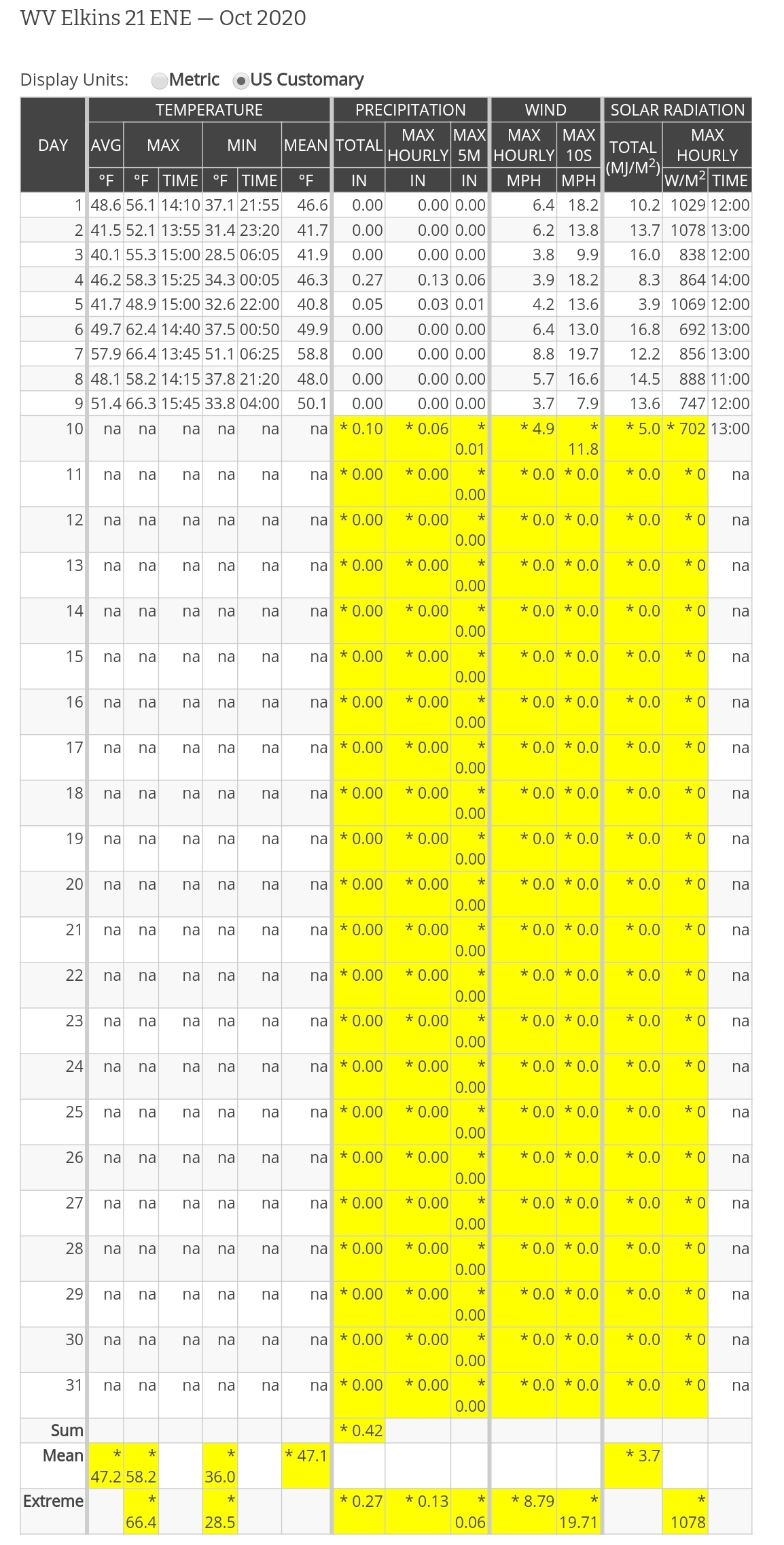 A sharp-eyed reader pointed out that the first 32F temperature on Oct 3 this fall means that the 2020 growing season was only 124 days, the shortest in all 22 years that data have been collect here. Of course, that very short period was due to the unusually late freezing temperature that occurred on June 1 this past spring. Table 10 has now been updated to reflect all growing seasons since 1999. Thanks Alex.