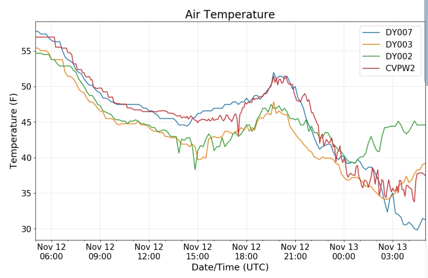 Dy007-Canaan Valley Refuge 3150′, Dy002-Cabin Mt at Bald Knob 4350′, Dy003-Cabin Mt/Sods 4035′, Dy004-Spruce Knob 4820′, Cvpw2-Climate Reference Network Canaan 3479′, KW99-Petersburg Grant County Airport 961′