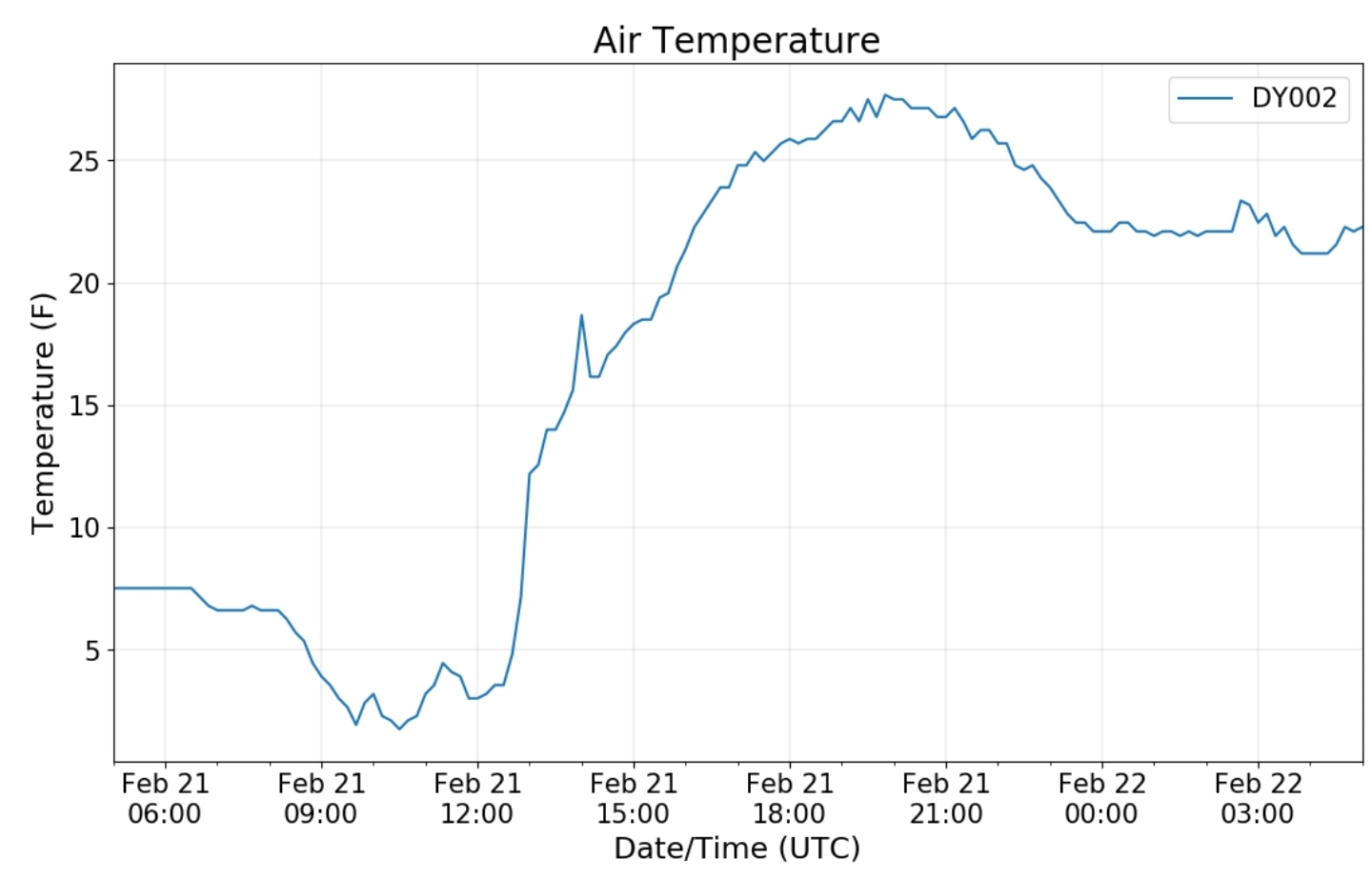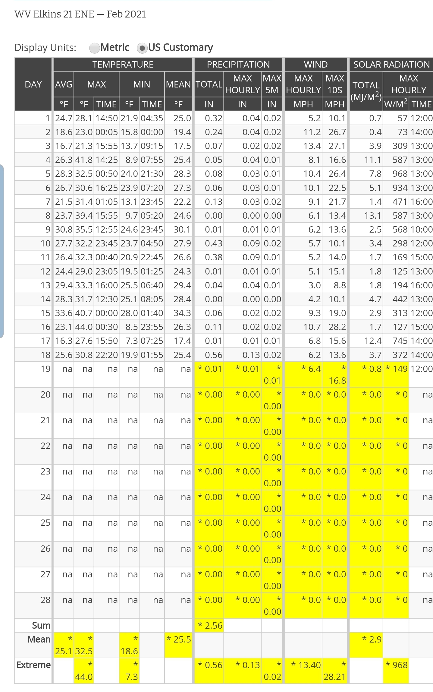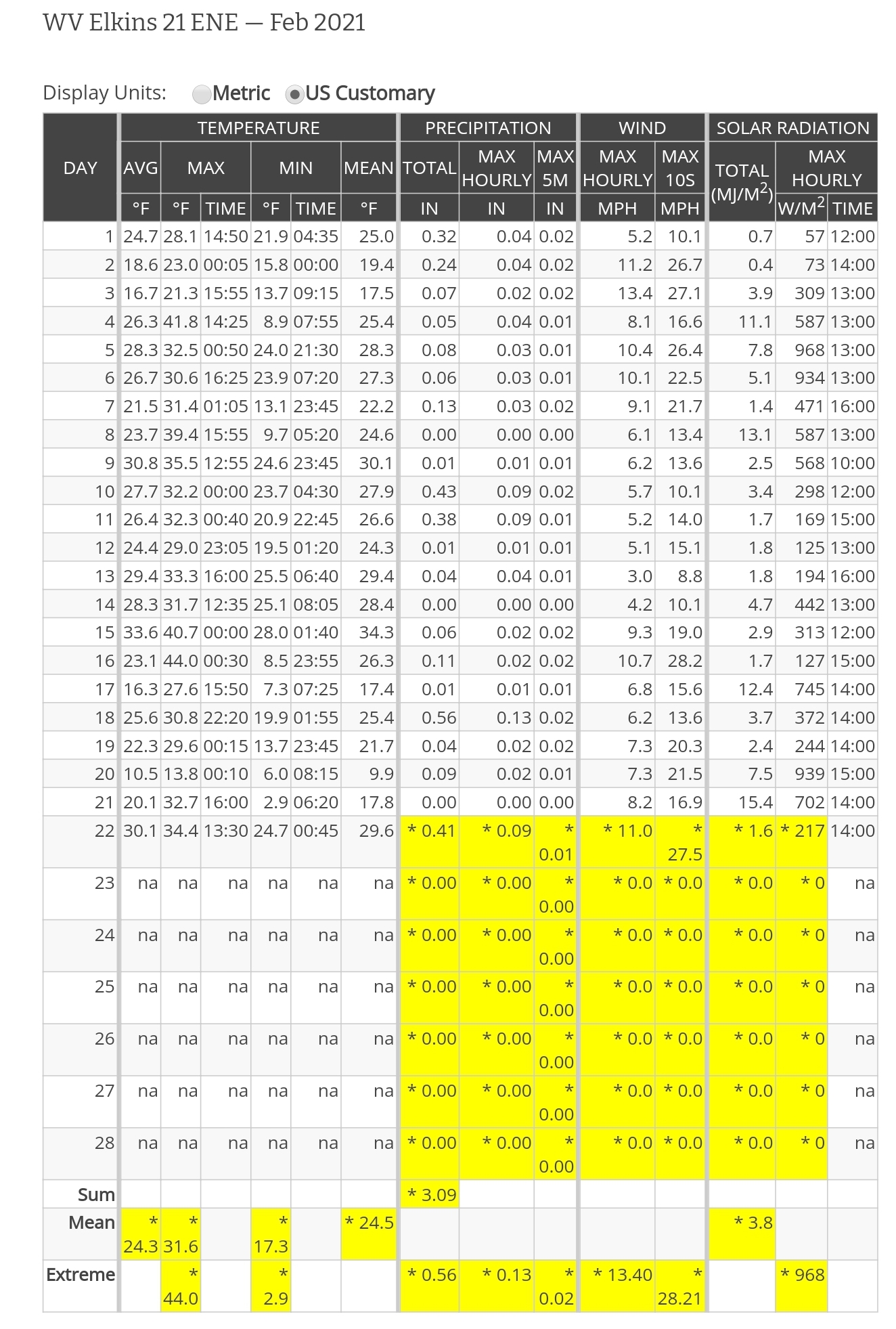 Dy007-Canaan Valley Refuge 3150′, Dy002-Cabin Mt at Bald Knob 4350′,,Dy003-Cabin Western/Sods 4035′, Dy004-Spruce Knob 4820′, Cvpw2-Climate Reference Network Canaan 3479′, KW99-Petersburg Grant County Airport 3479′