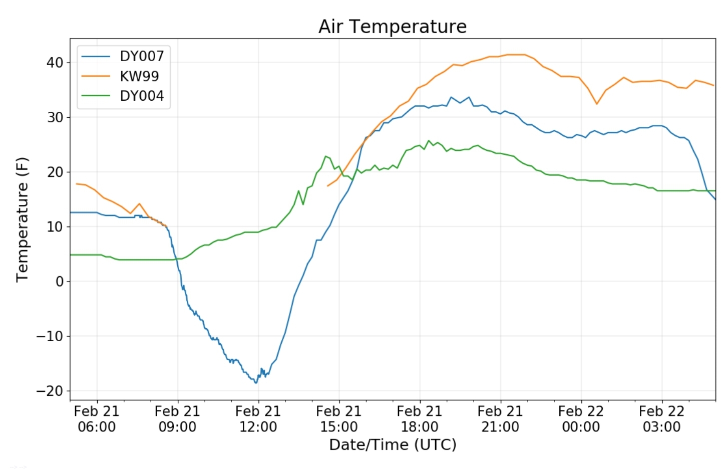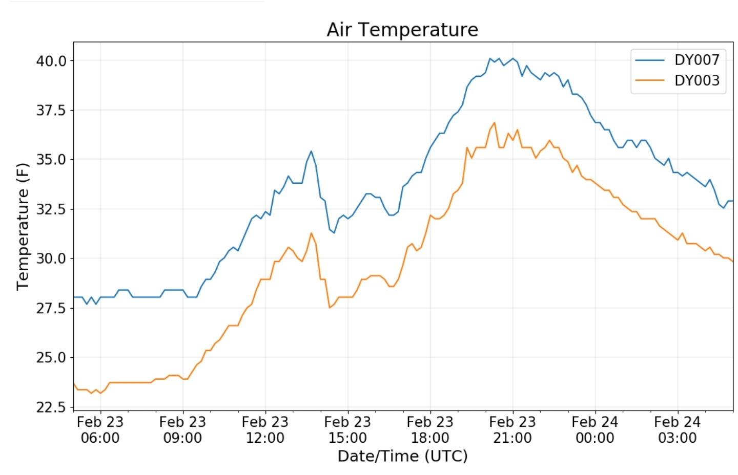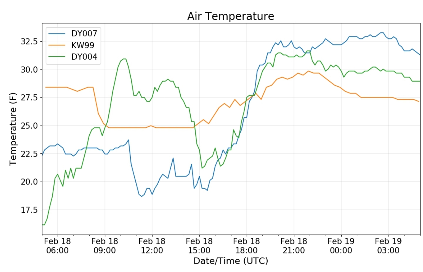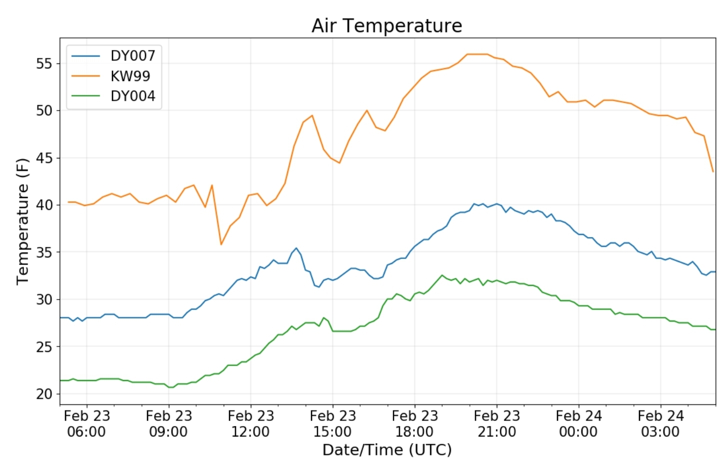 Dy007-Canaan Valley Refuge 3150′, Dy002-Cabin Mt at Bald Knob 4350′, Dy003-Cabin Mt/Sods 4035′, Dy004-Spruce Knob 4820′, Cvpw2-Climate Reference Network Canaan 3479′ , KW99-Petersburg Grant County Airport 961′