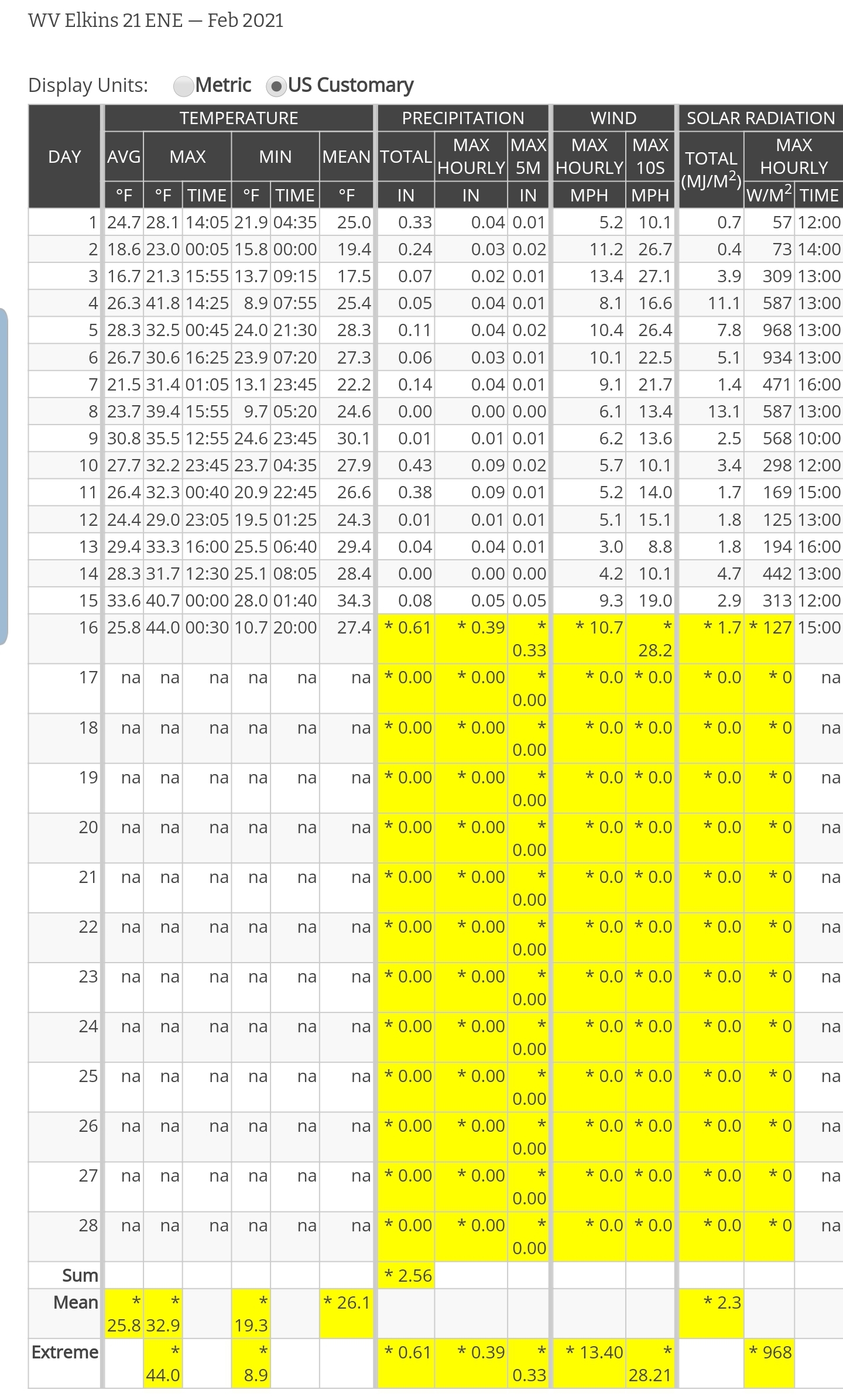 Dy007-Canaan Valley Refuge 3150′, Dy002-Cabin Mt at Bald Knob 4350′, Dy003-Cabin Mt/Sods 4035′,,Dy004-Spruce Knob 4820′, Cvpw2-Climate Reference Network Canaan 3479′, KW99-Petersburg Grant County Airport 961′