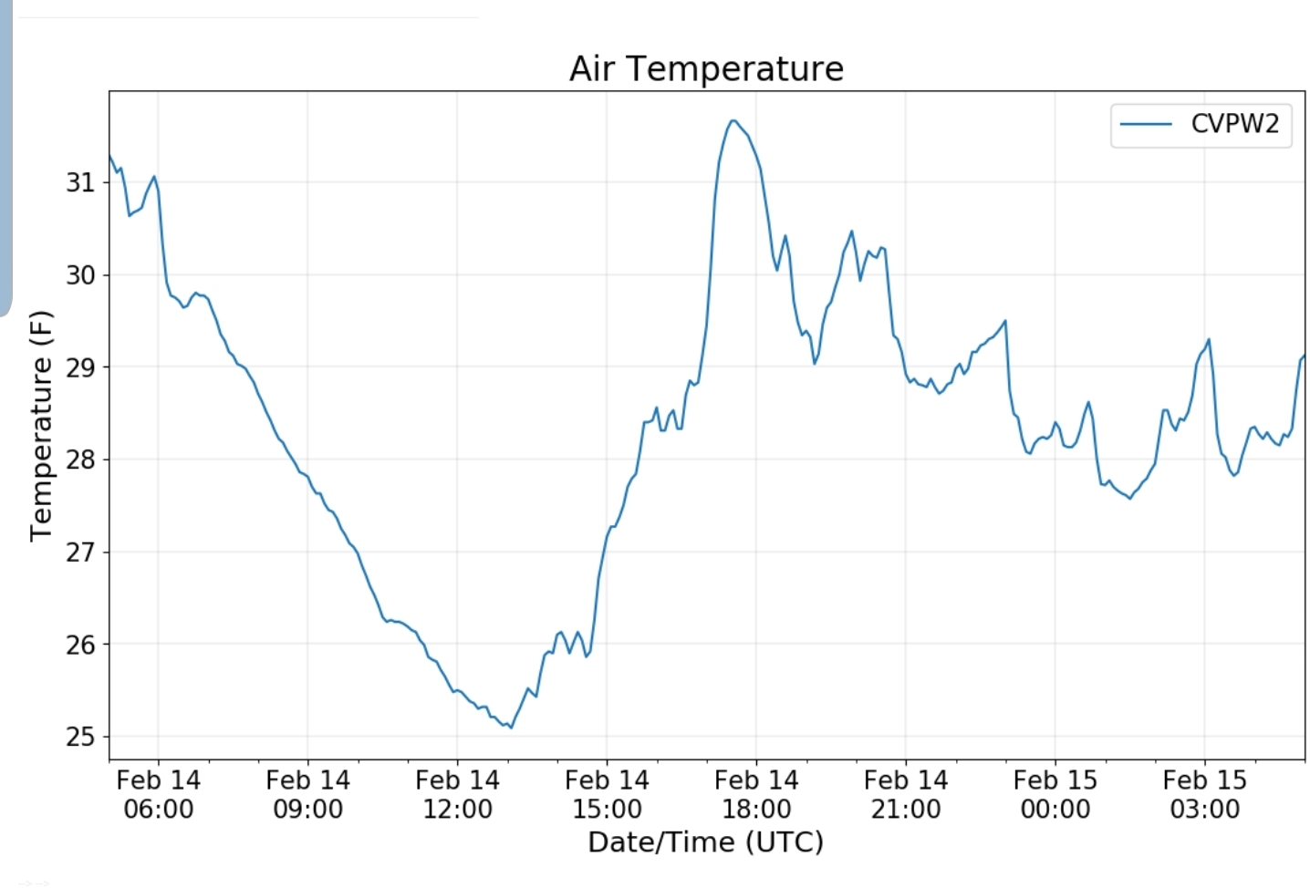 Cloudy overnight, temperatures hanging in the mid to high 20s, gradually warming to the low 30s in the afternoon with a few periods of light freezing rain then light rain.