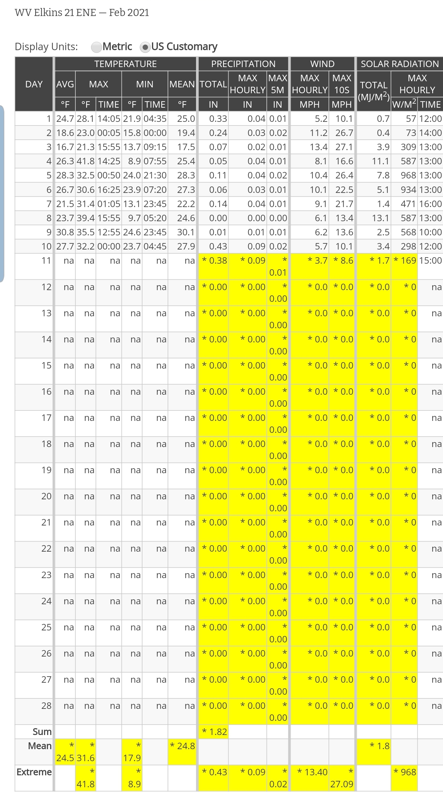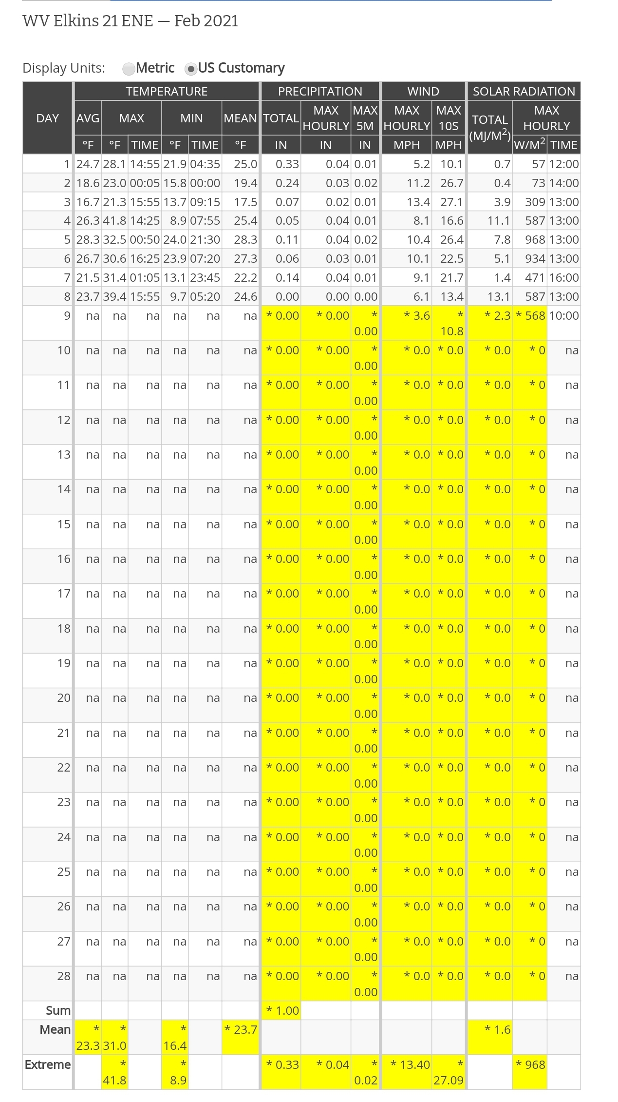 Dy007-Canaan Valley Refuge 3150′, Dy002-Cabin Mt at Bald Knob 4350′, Dy003-Cabin Mt/Sods 4035′, Dy004-Spruce Knob 4820′, Cvpw2-Climate Reference Network Canaan 3479, Kw99-Petersburg Grant County Airport 961′,