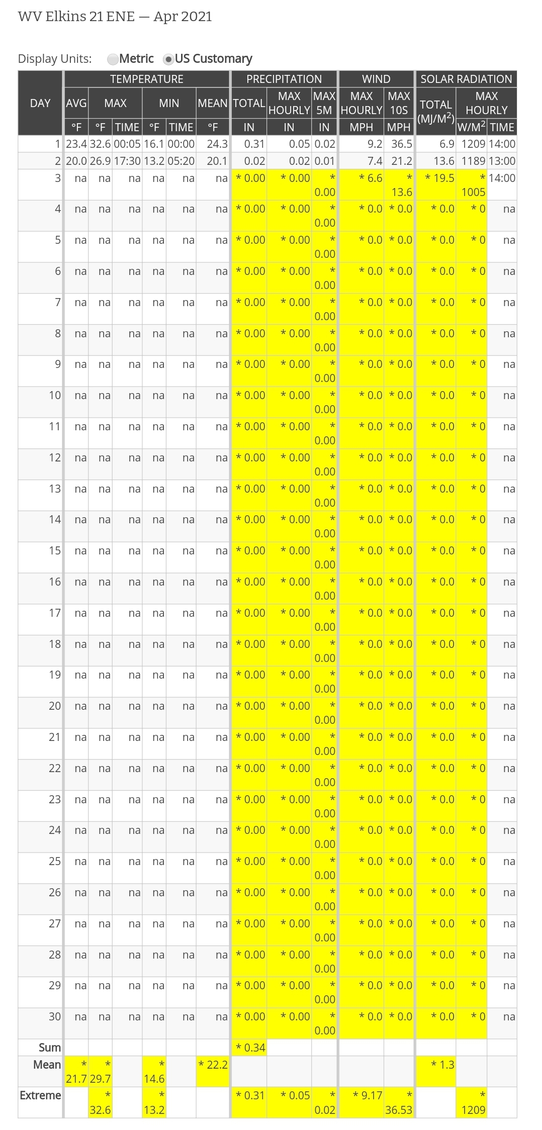 Dy007-Canaan Valley Refuge 3150′, Dy002-Cabin Mt at Bald Knob 4350′,,Dy003-Cabin Mt/Sods 4035′, Dy004-Spruce Knob 4820′, Cvpw2-Climate Reference Network Canaan 3479′, KW99-Petersburg Grant County Airport 961′