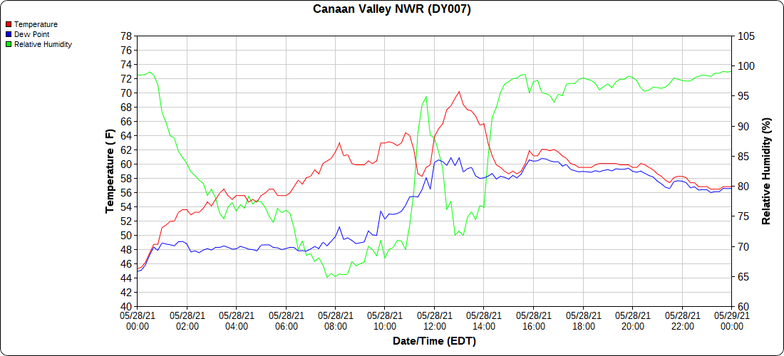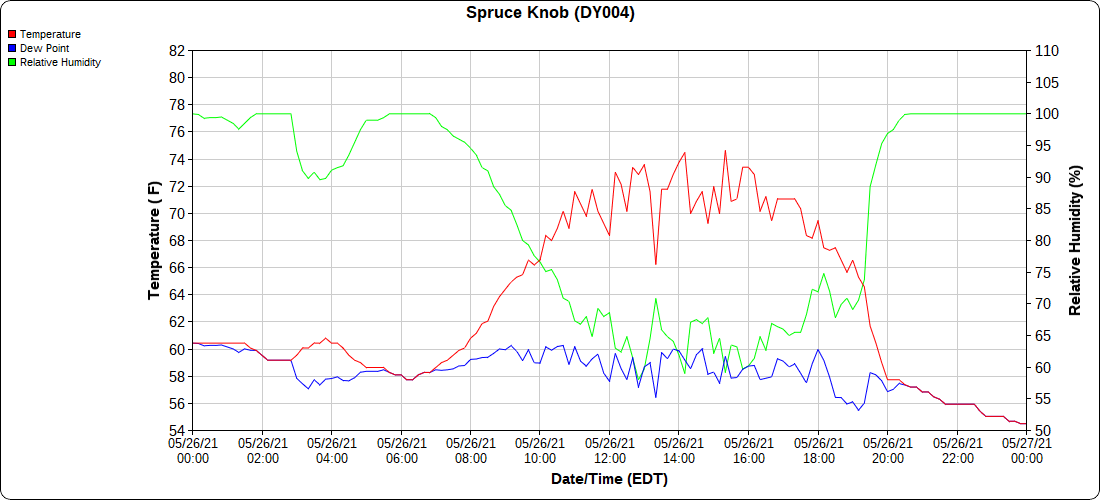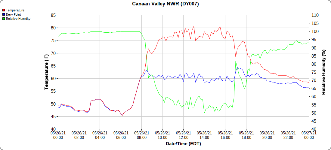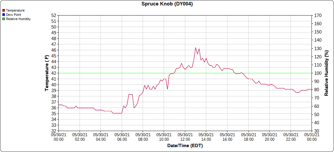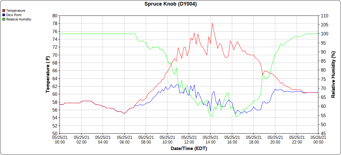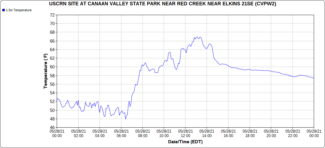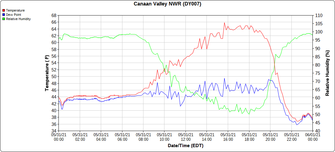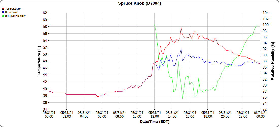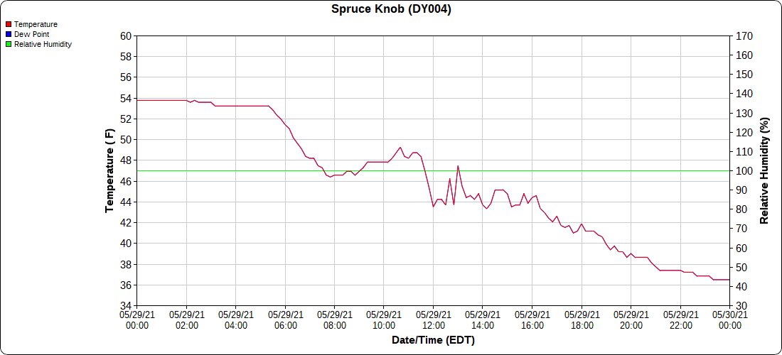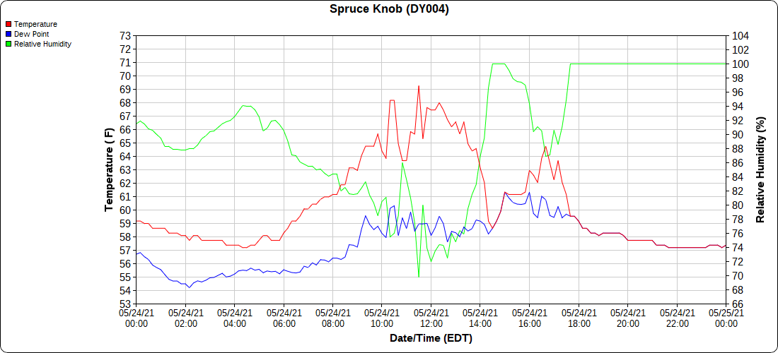 Dy007-Canaan Valley Refuge 3150′, Dy002-Cabin Mt at Bald Knob 4350′, Dy003-4035′, Dy004-Spruce Knob 4820′, Cvpw2-Climate Reference Network Canaan 3479′, KW99-Petersburg Grant County Airport 962′
