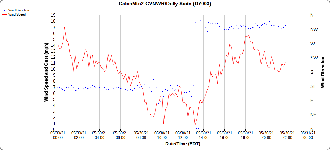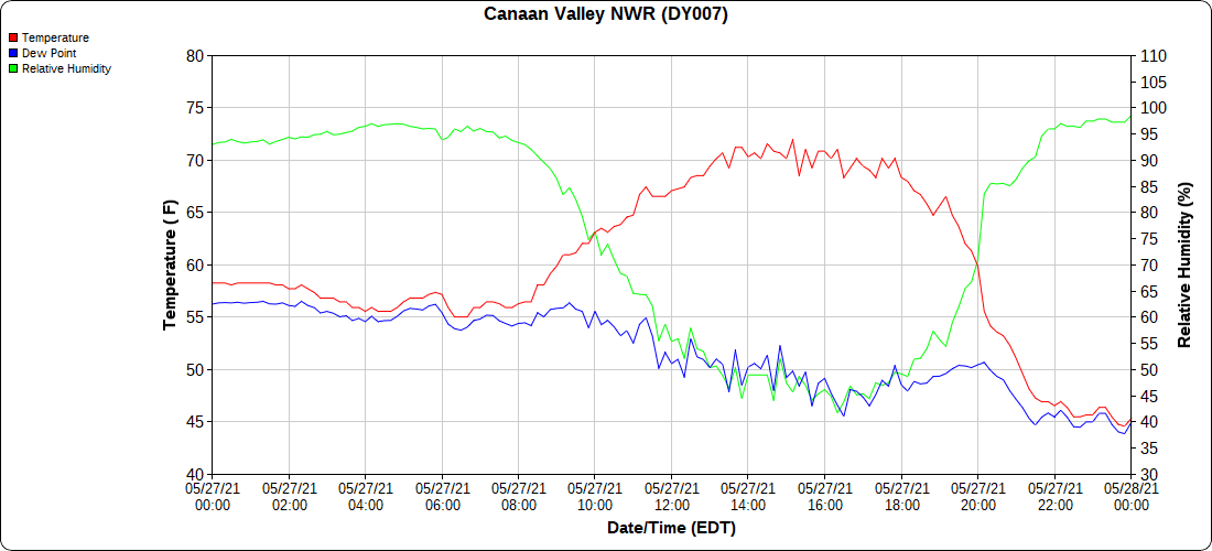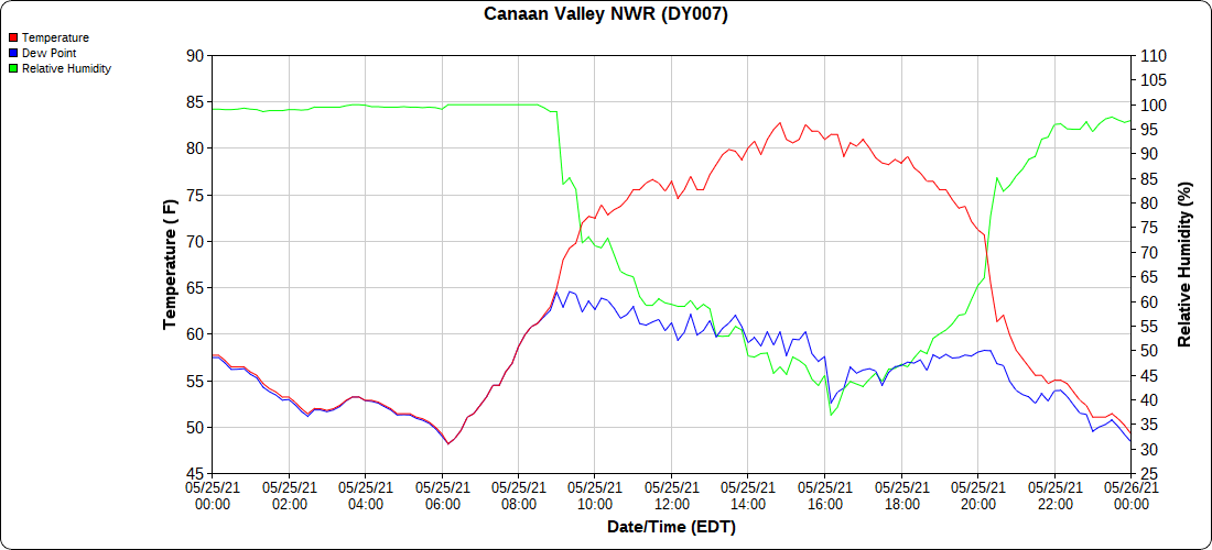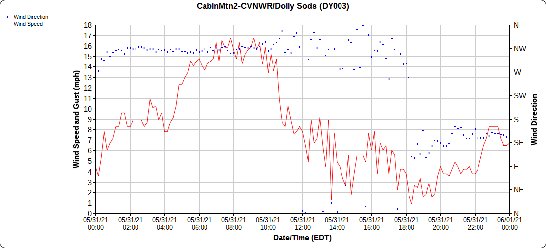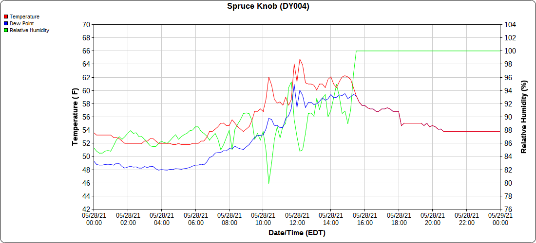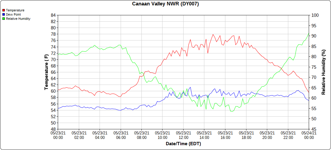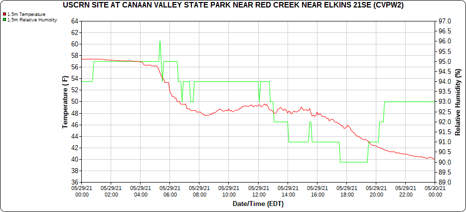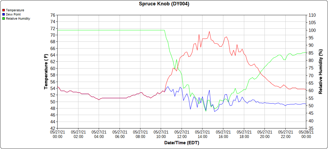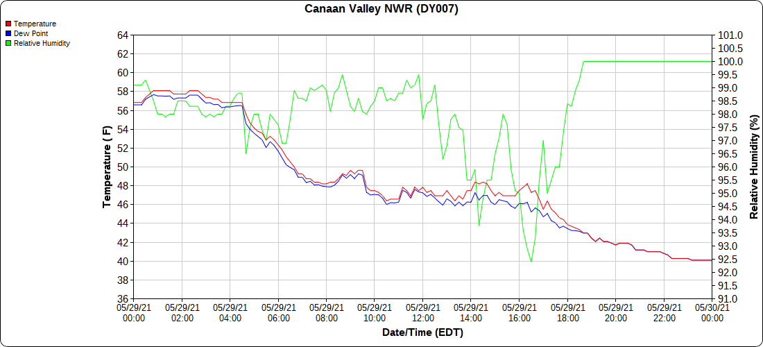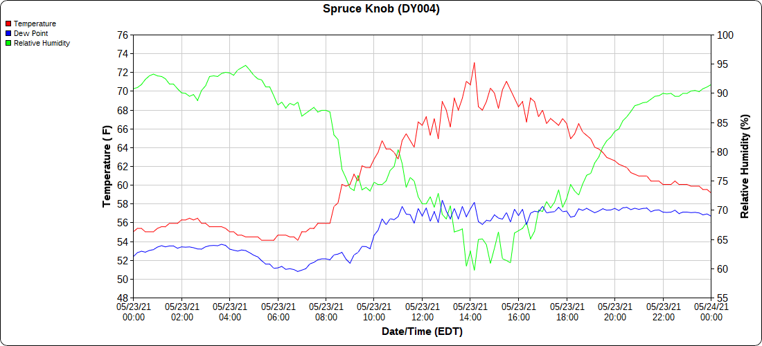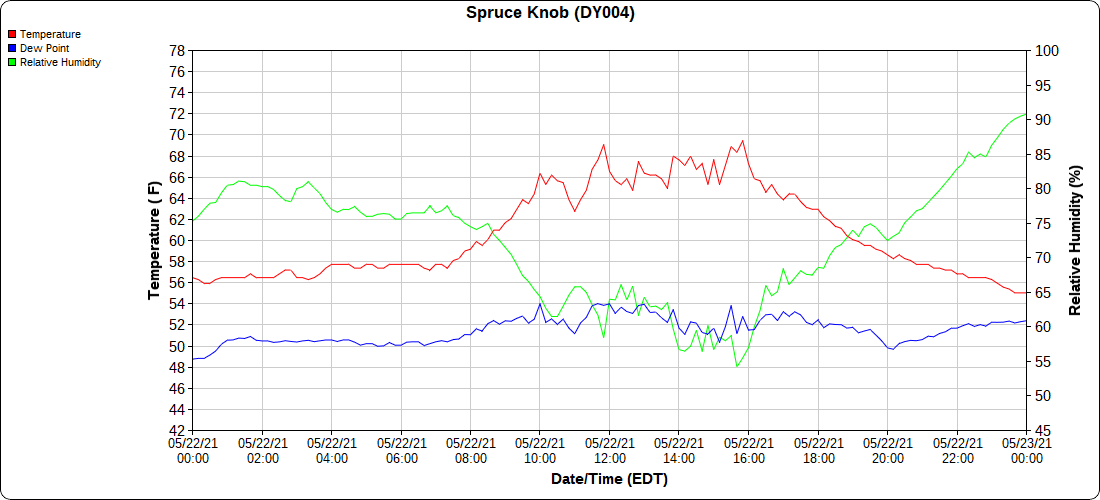 Dy007-Canaan Valley Refuge 3150′, Dy002-Cabin Mt at Bald Knob 4350′, Dy003-4035′, Dy004-Spruce Knob 4820′, Cvpw2-Climate Reference Network Canaan 3479′, KW99-Petersburg Grant County Airport 962′