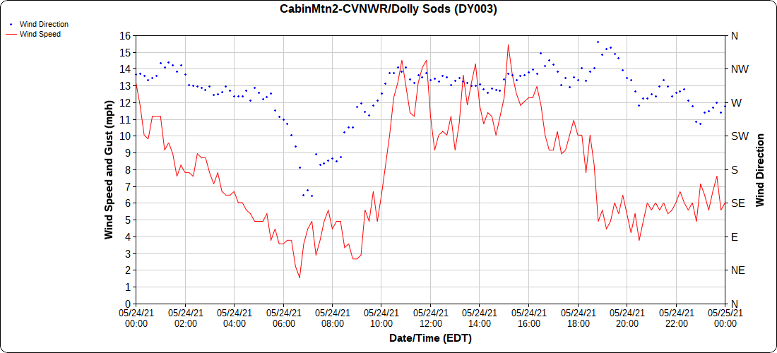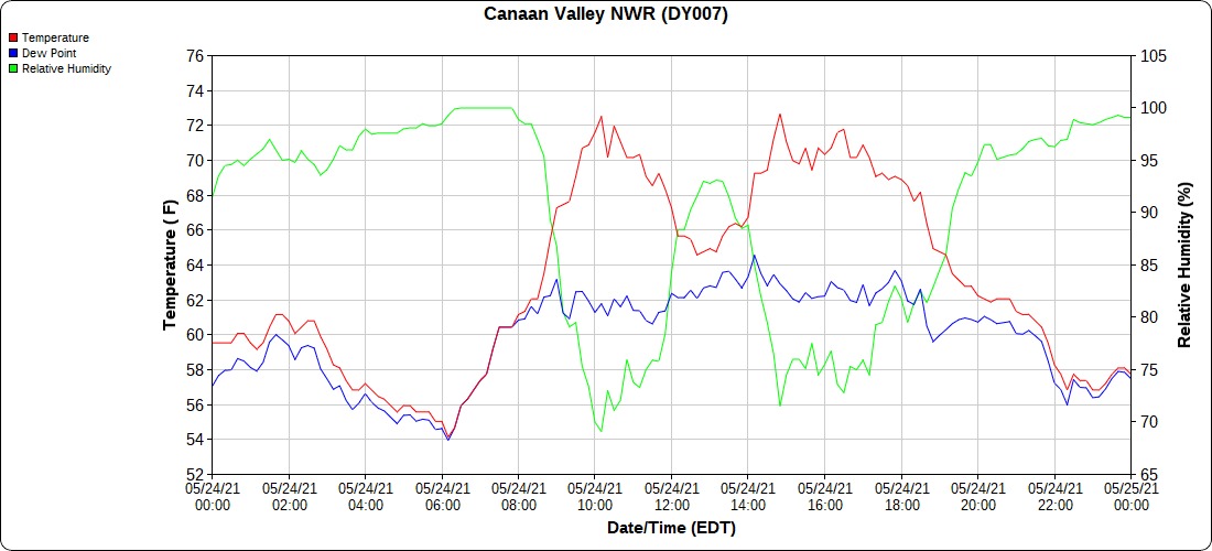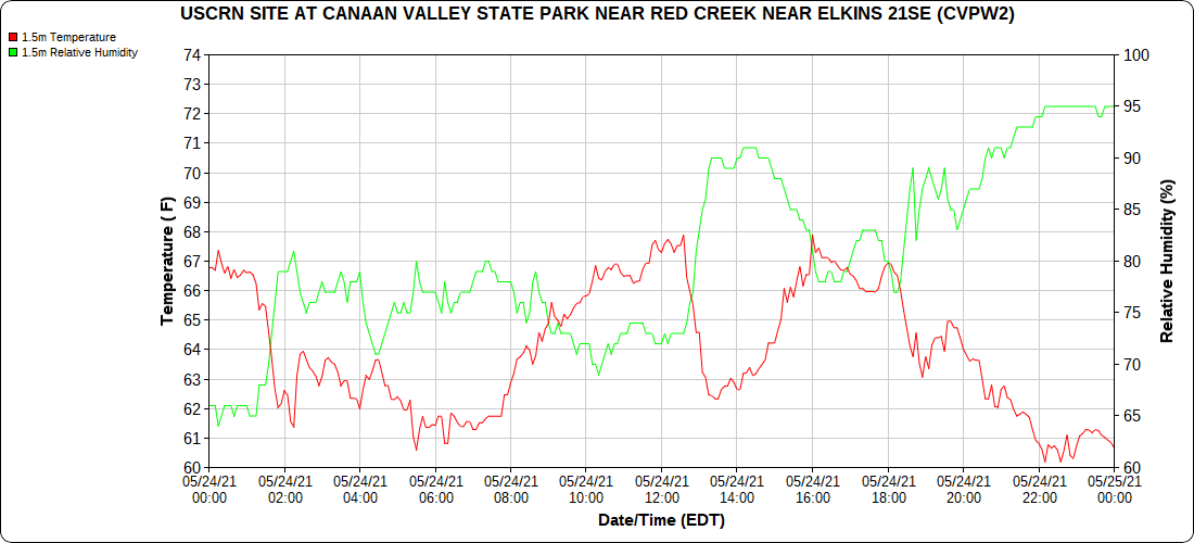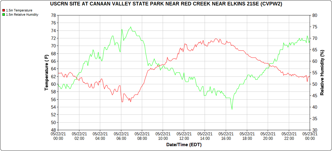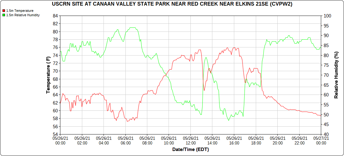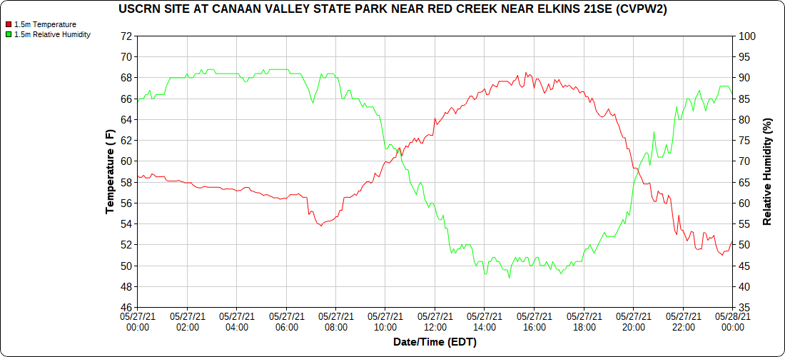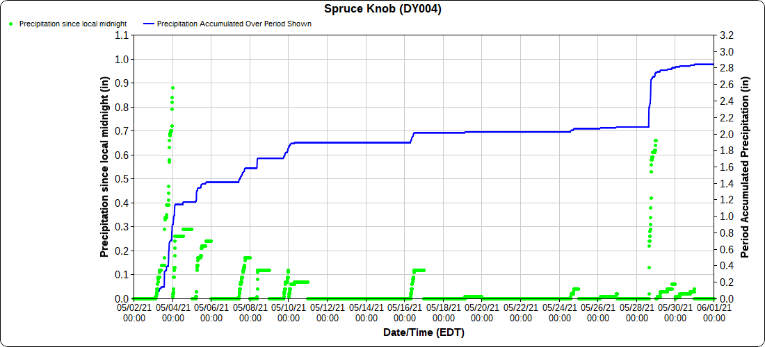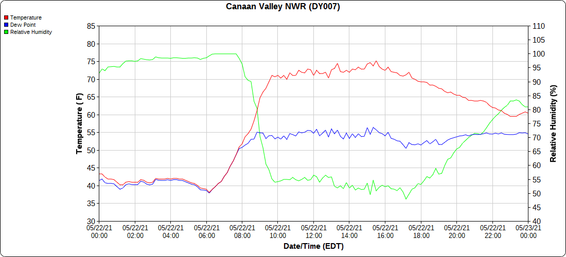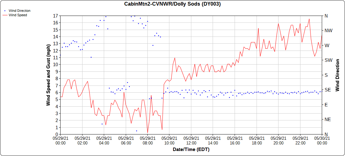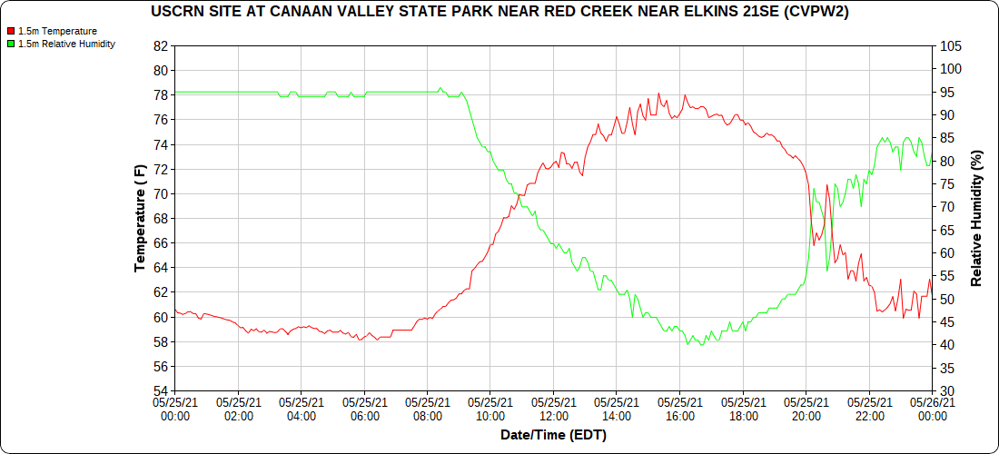 Dy007-Canaan Valley Refuge 3150′, Dy002-Cabin Mt at Bald Knob 4350′, Dy003-4035′, Dy004-Spruce Knob 4820′, Cvpw2-Climate Reference Network Canaan 3479′, KW99-Petersburg Grant County Airport 962′
