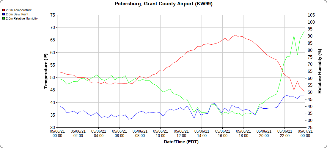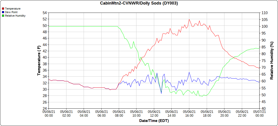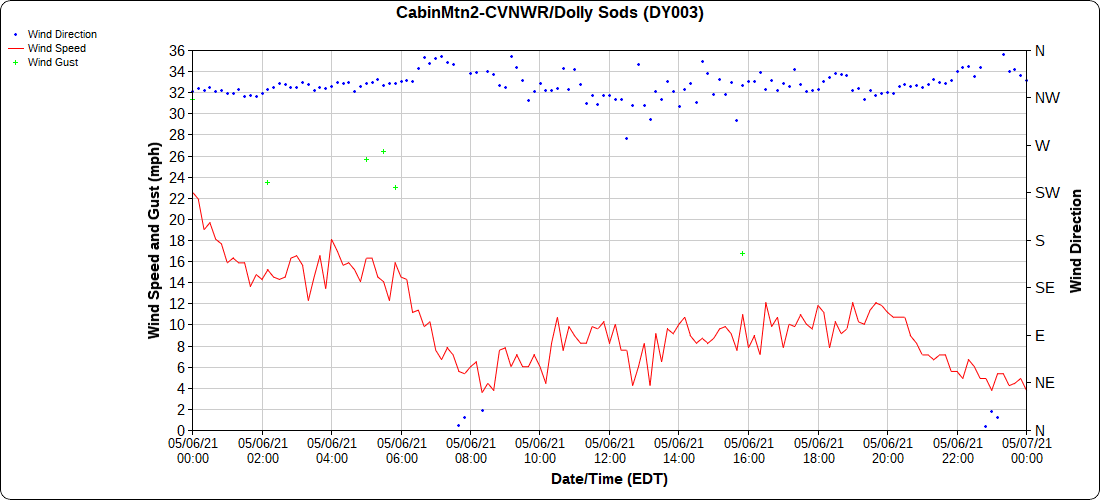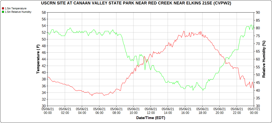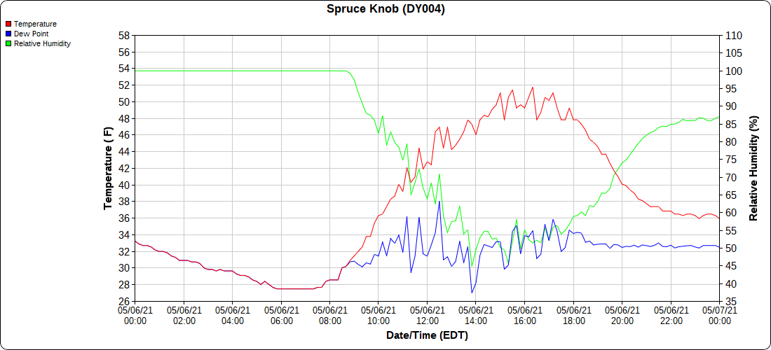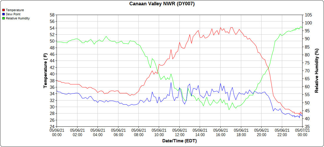 Dy007-Canaan Valley Refuge 3150′, Dy002-Cabin Mt at Bald Knob 4350′, Dy003-Cabin Mt-Western Sods 4035′, Dy004-Spruce Knob 4820, Cvpw2-Climate Reference Network Canaan 3479′, KW99-Petersburg Grant County Airport 961′