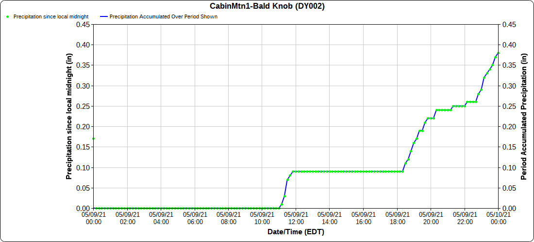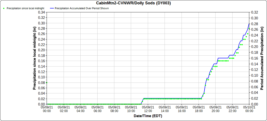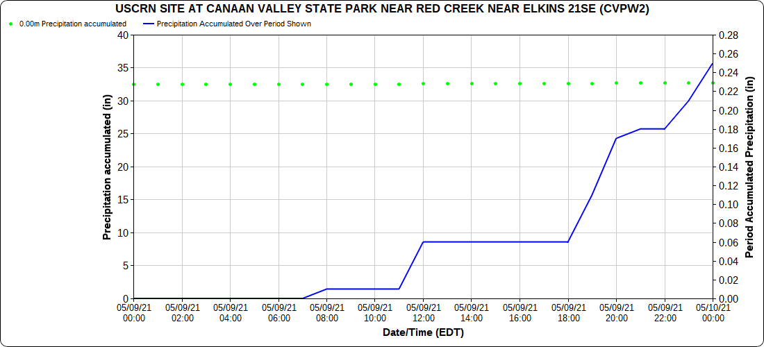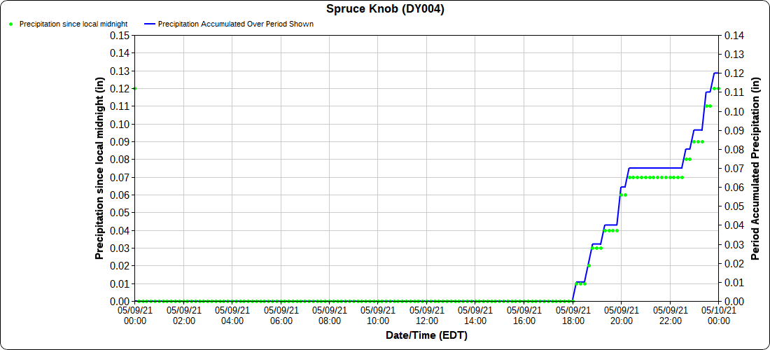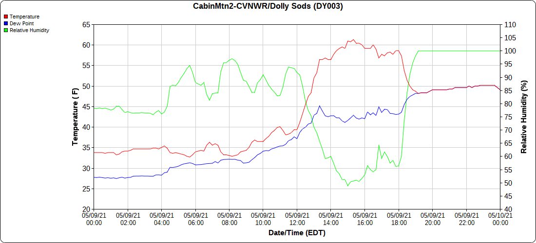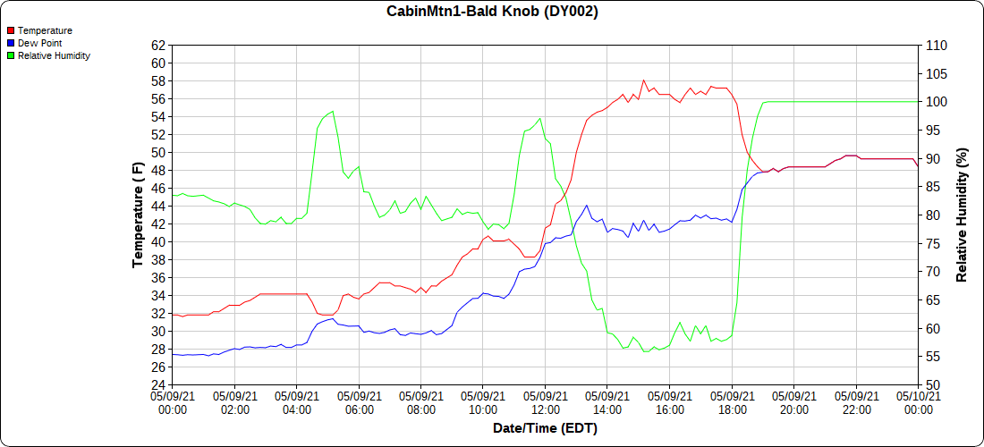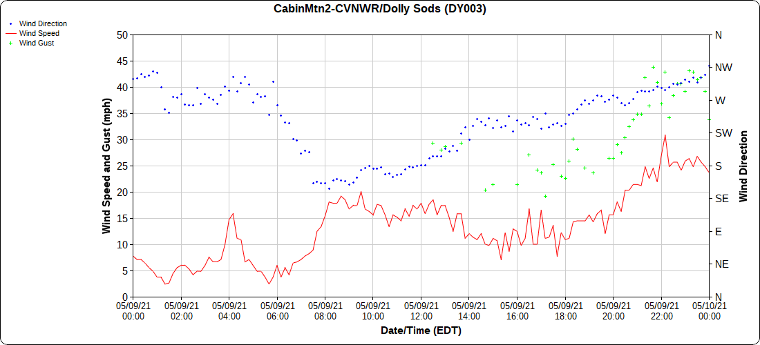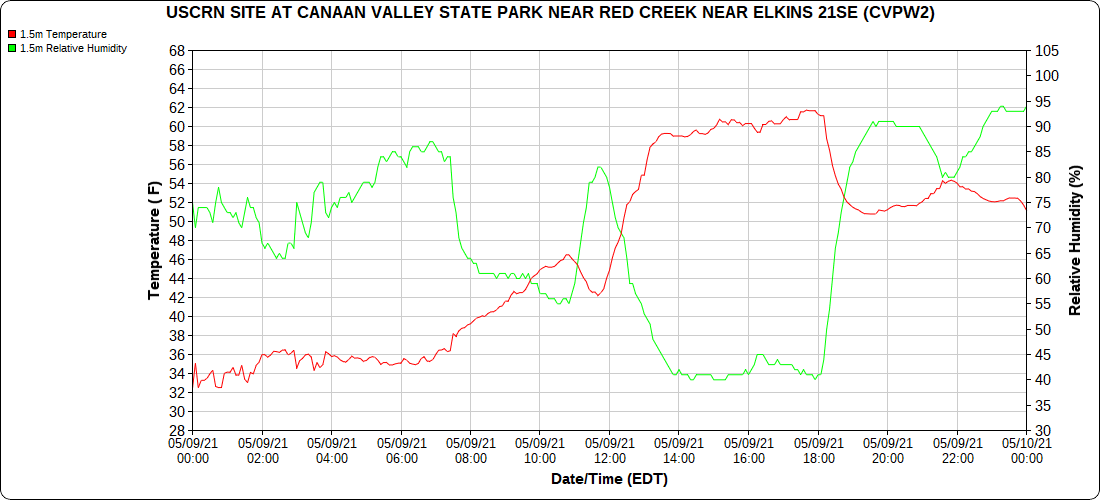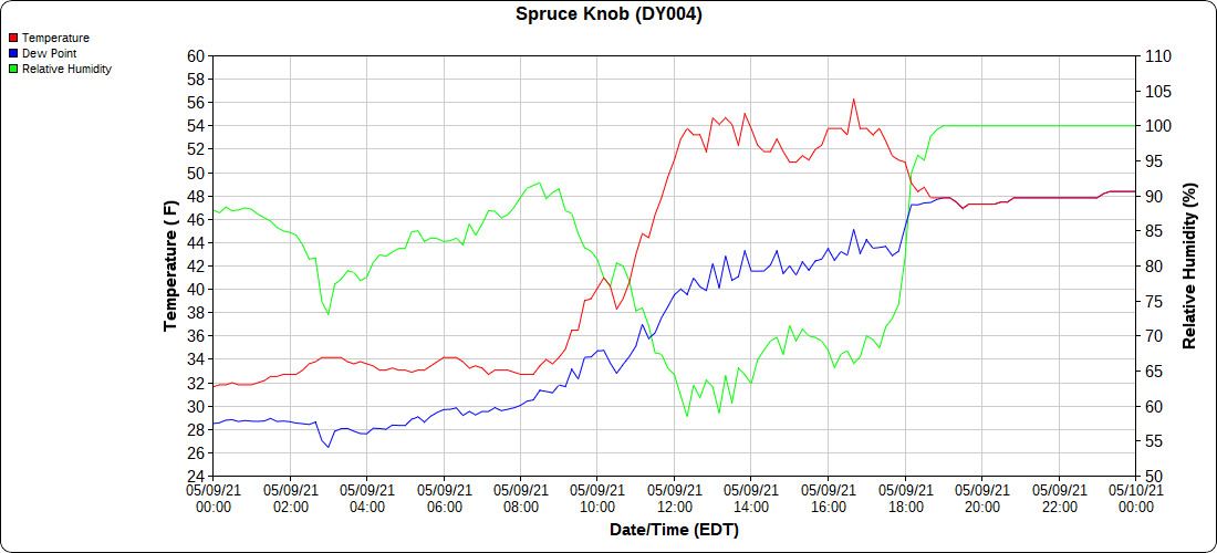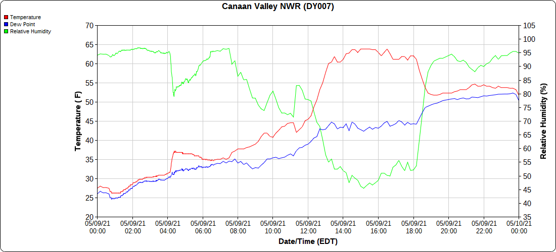 Dy007-Canaan Valley Refuge 3150′, Dy002-Cabin Mt at Bald Knob 4350′, Dy003-Cabin Mt-Western Sods 4035′, Dy004-Spruce Knob 4820′, Cvpw2-Climate Reference Network Canaan 3479′, KW99-Petersburg Grant County Airport 961′