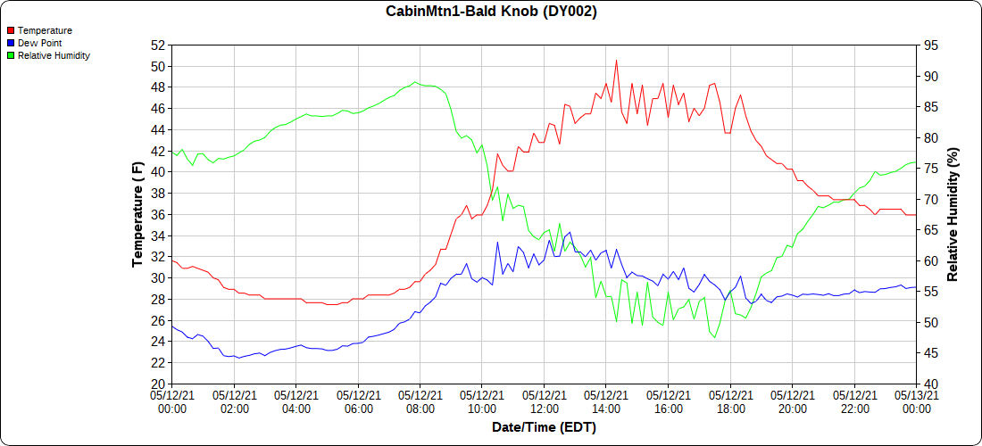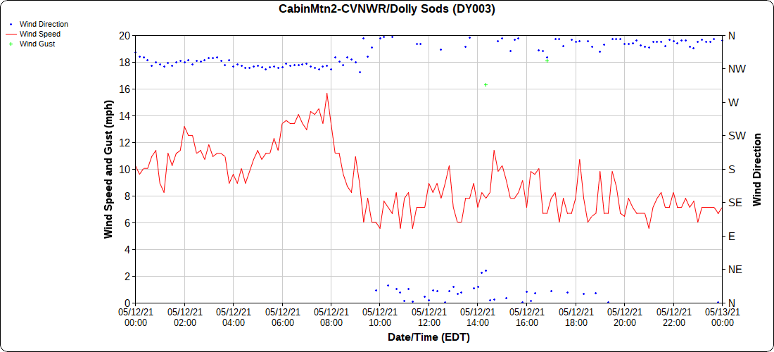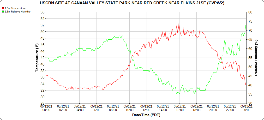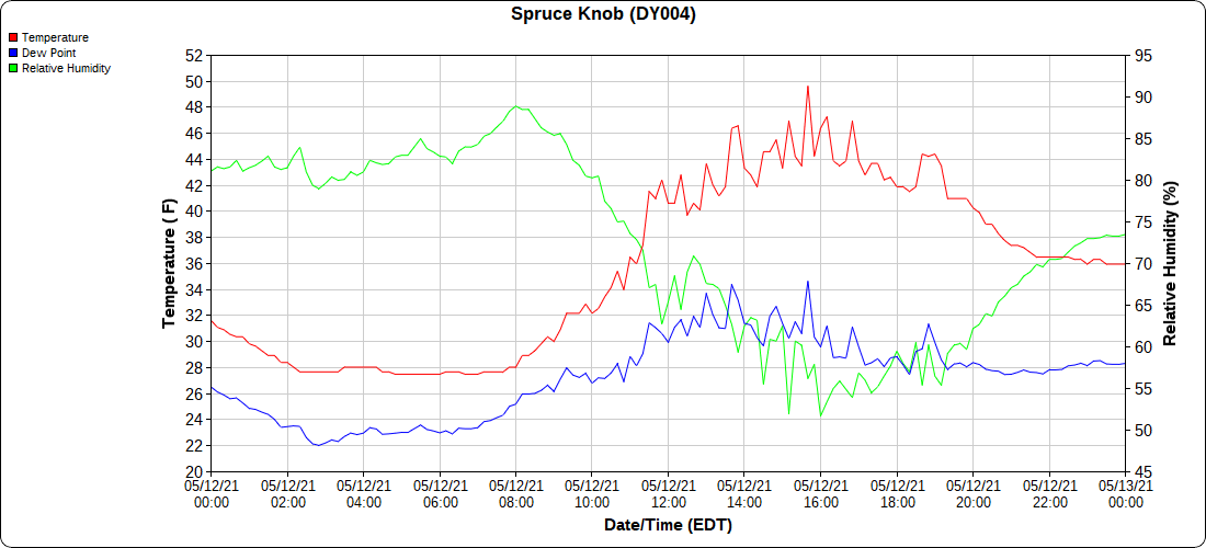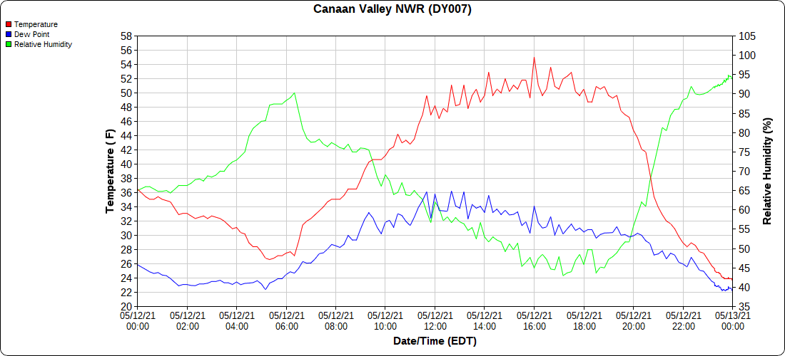 Dy007-Canaan Valley Refuge 3150′, Dy002-Cabin Mt at Bald Knob 4350′, Dy003-Cabin Mt-Western Sods 4035′,,Dy004-Spruce Knob 4820′, Cvpw2-Climate Reference Network Canaan 3479′, KW99-Petersburg Grant County Airport 961′