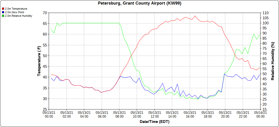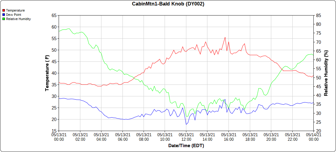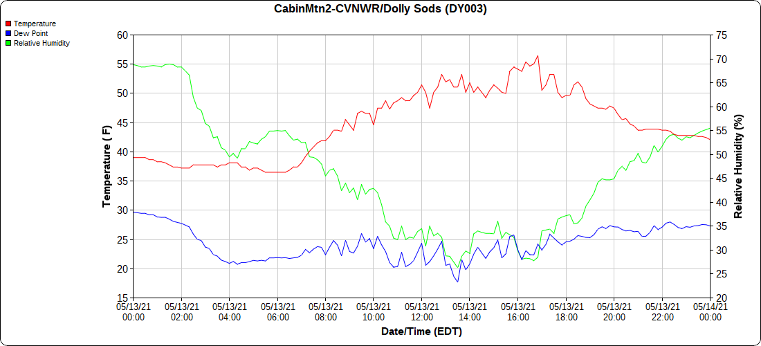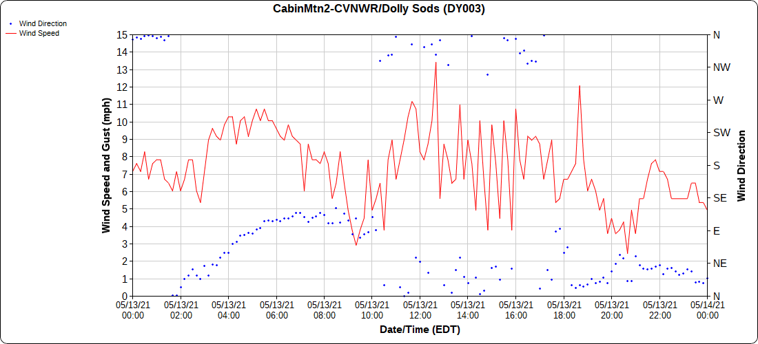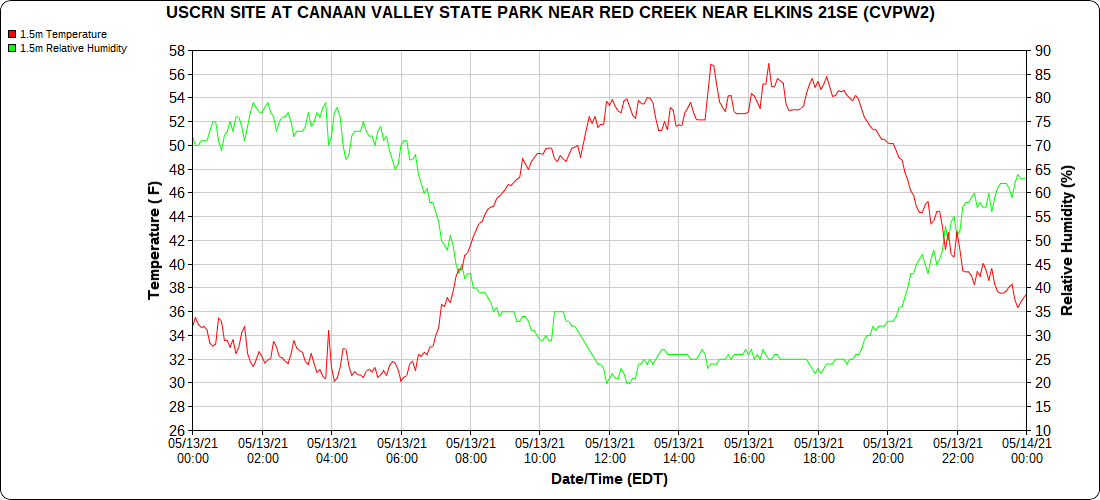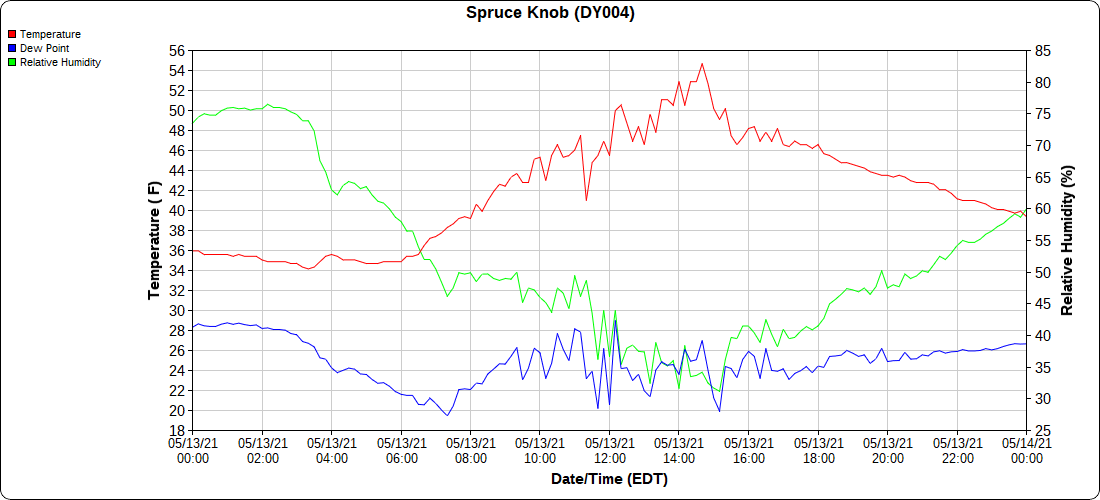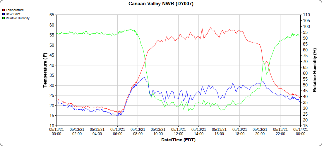 Dy007-Canaan Valley Refuge 3150′, Dy002-Cabin Mt at Bald Knob 4350′, Dy003-Cabin Mt-Western Sods 4035′, Dy004-Spruce Knob 4820′, Cvpw2-Climate Reference Network Canaan 3479′, KW99-Petersburg Grant County Airport 961′