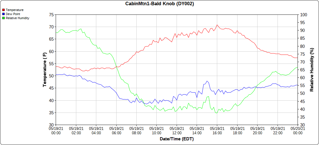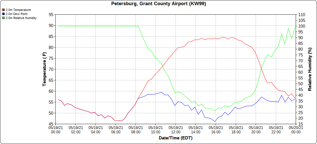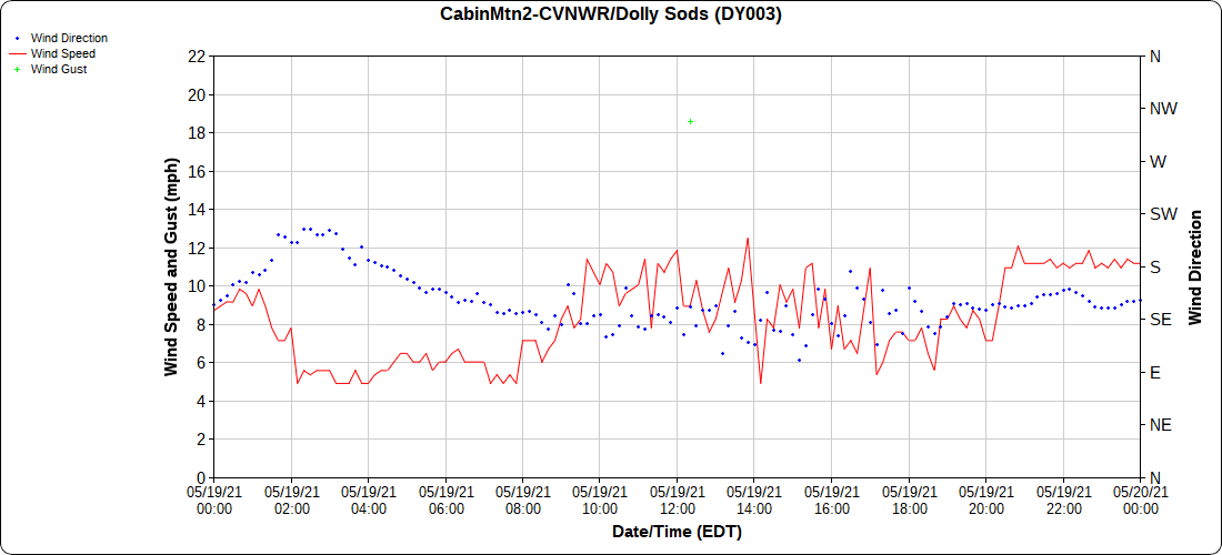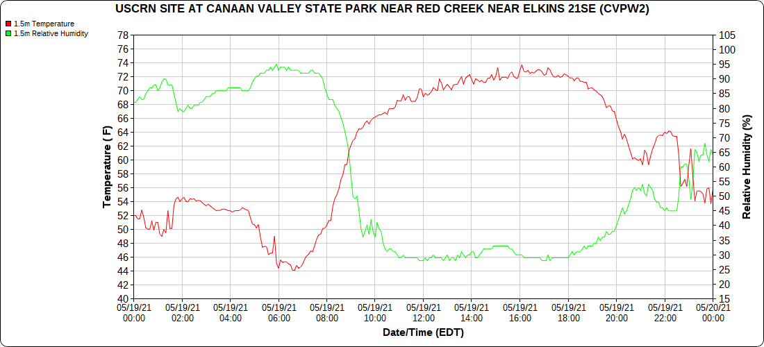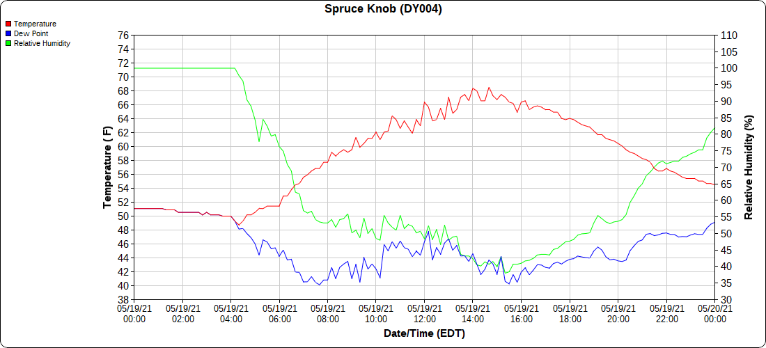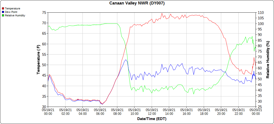 Dy007-Canaan Valley Refuge 3150′, Dy002-Cabin Mt at Bald Knob 4350′, Dy003-Cabin Mt-Western Sods 4035′, Dy004-Spruce Knob 4820′, Cvpw2-Climate Reference Network Canaan 3479′, KW99-Petersburg Grant County Airport 961′