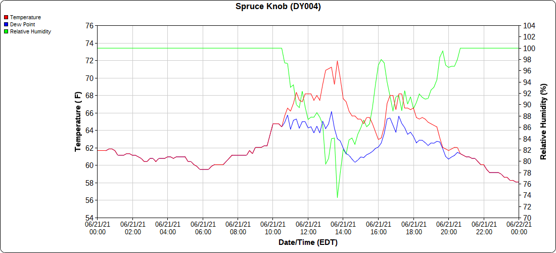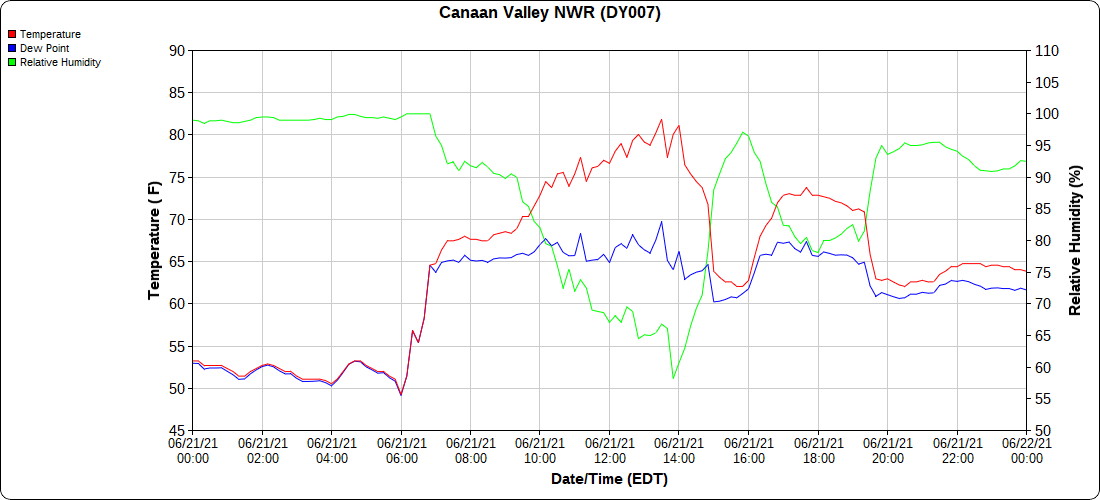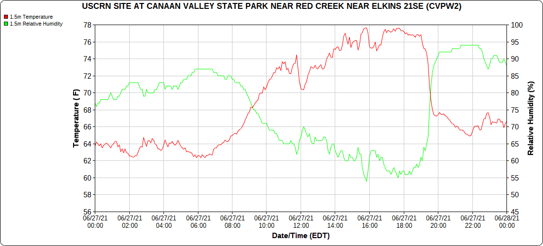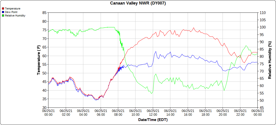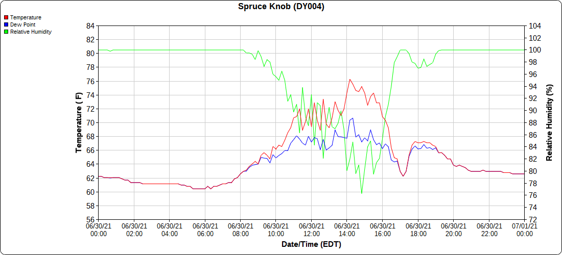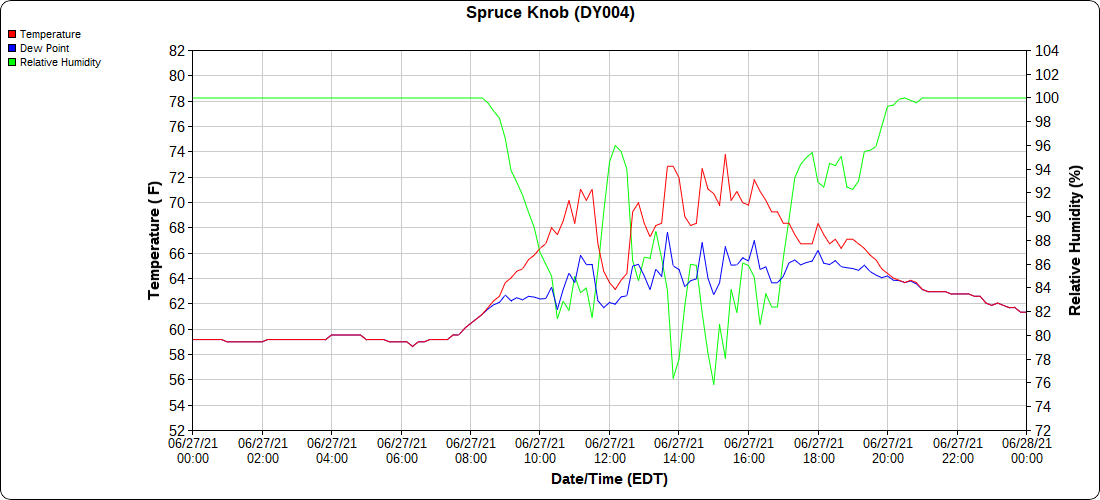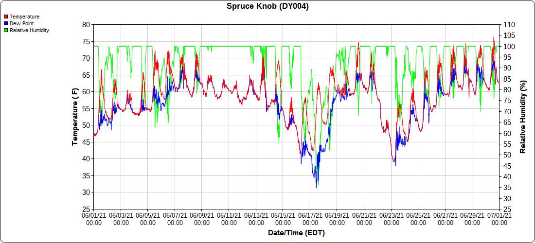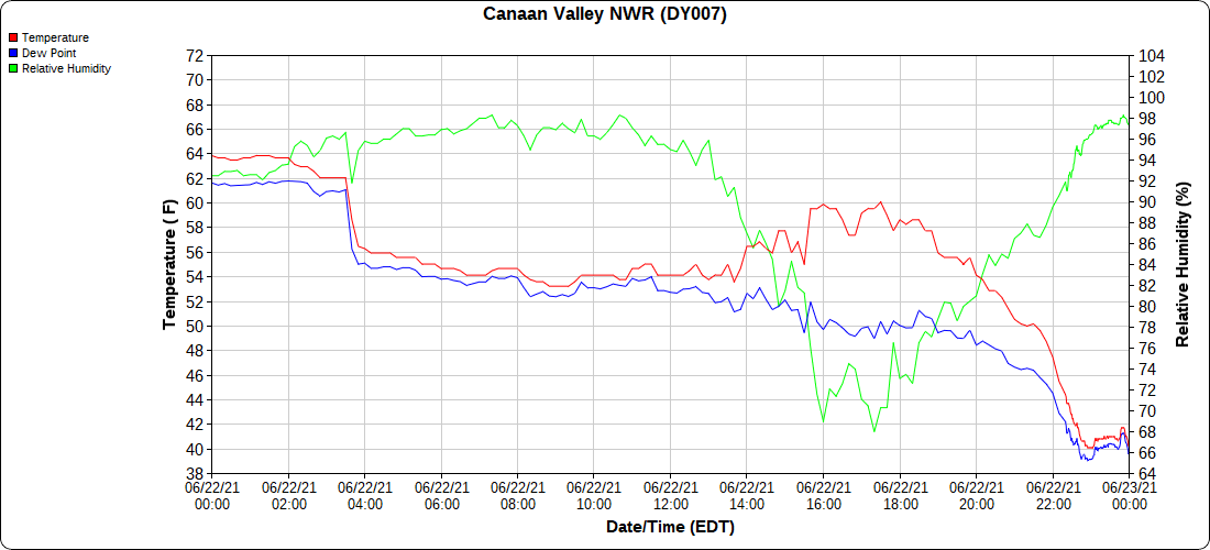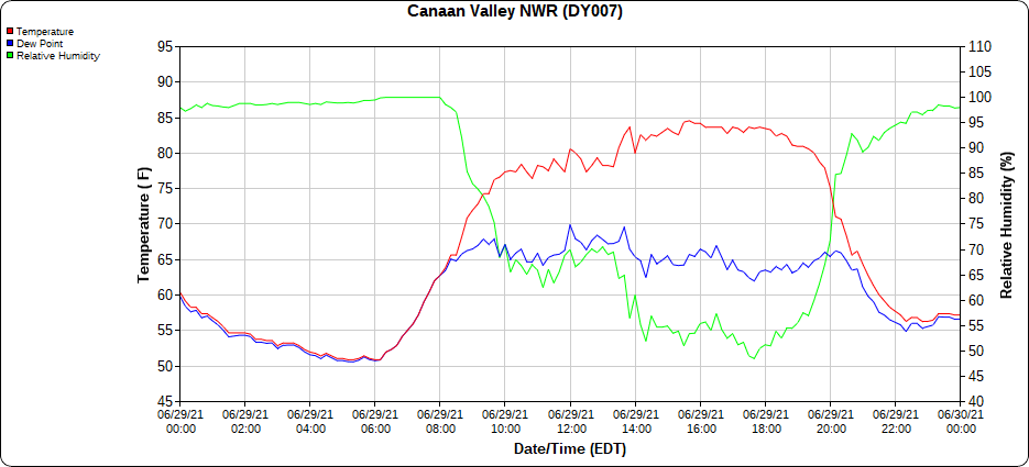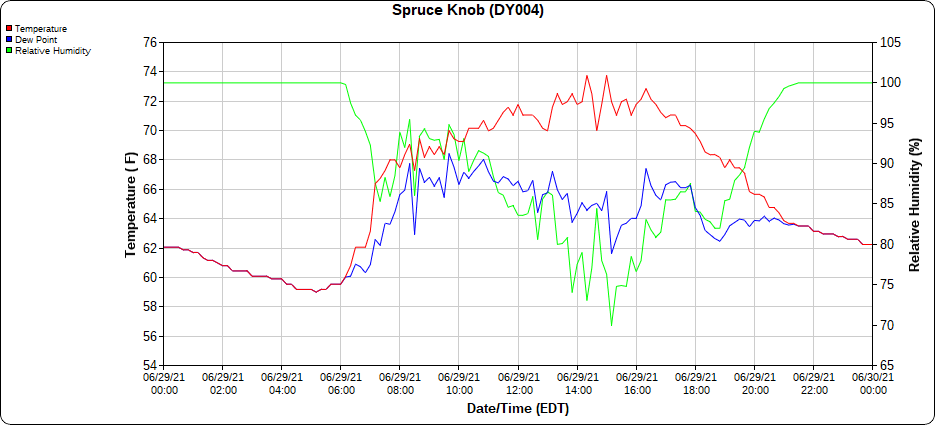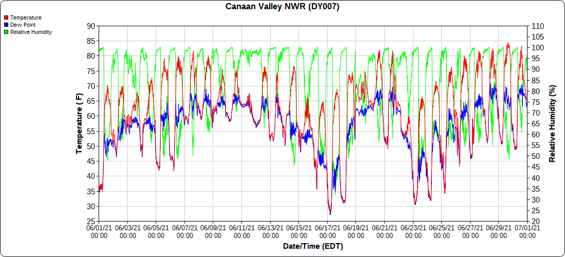 Dy007-Canaan Valley Refuge 3150′, Dy002-Cabin Mt at Bald Knob 4350′, Dy003-Cabin Mt-Western Sods 4035′, Dy004-Spruce Knob 4820′, Cvpw2-Climate Reference Network Canaan 3479′, KW99-Petersburg Grant County Airport 961′
