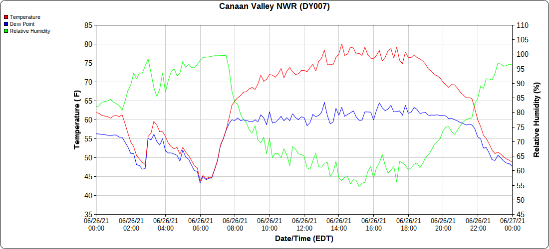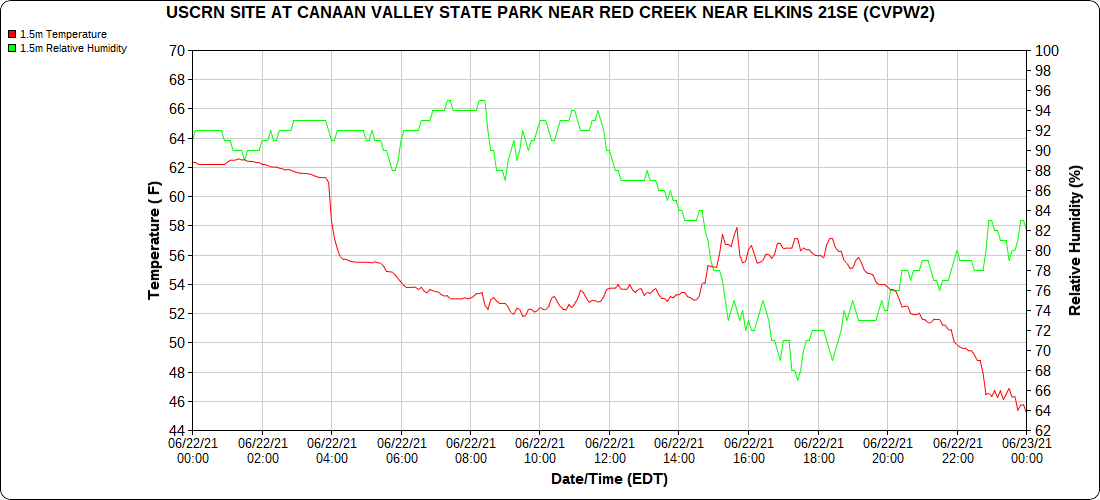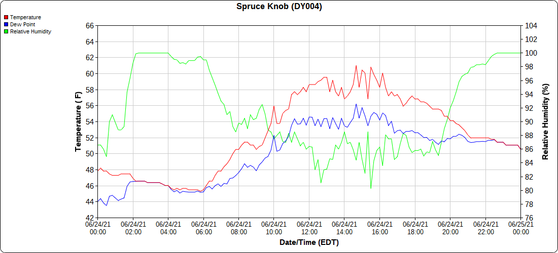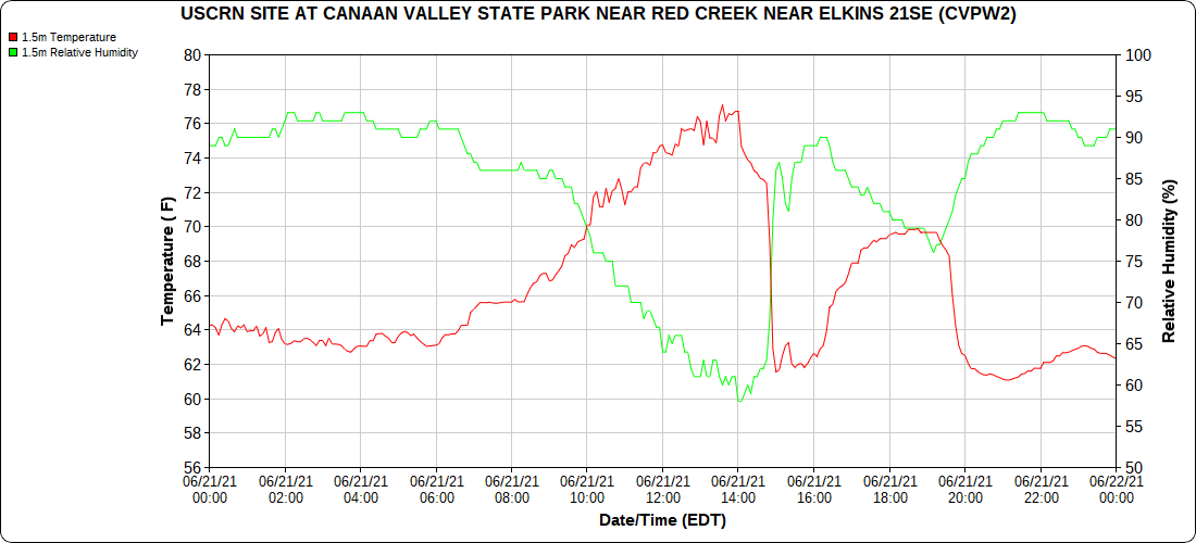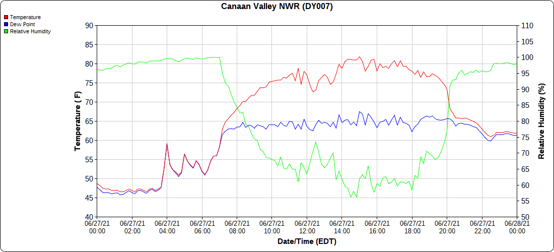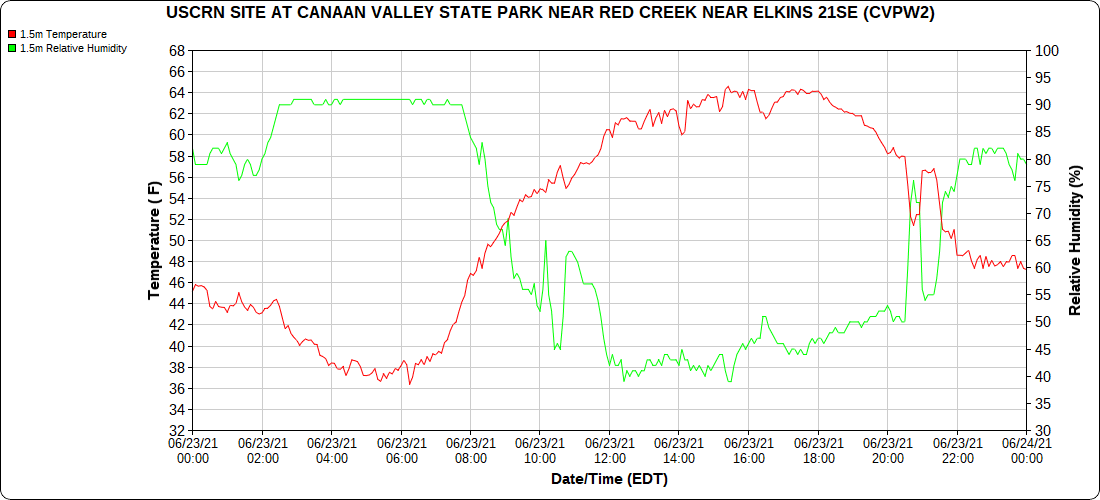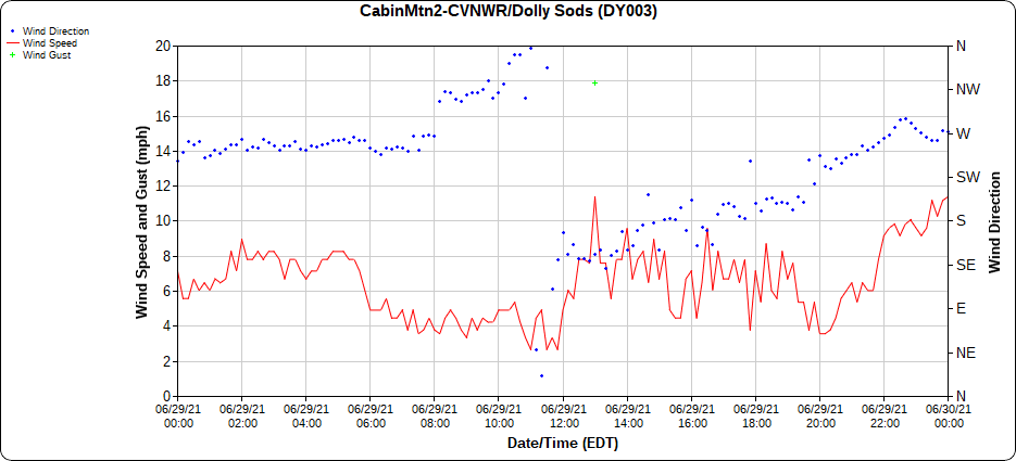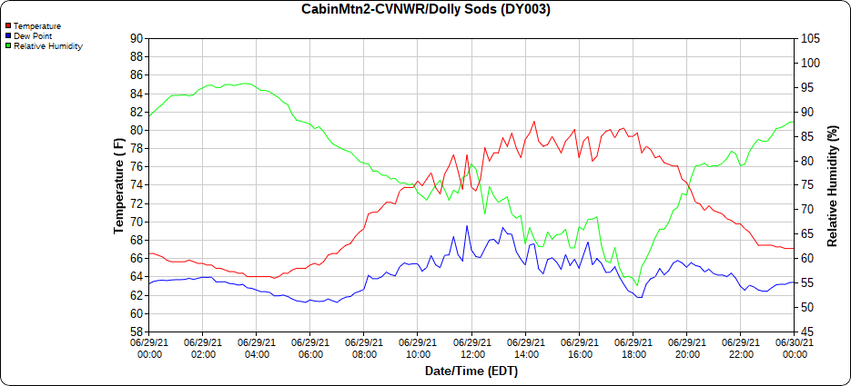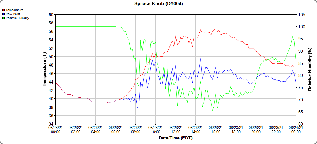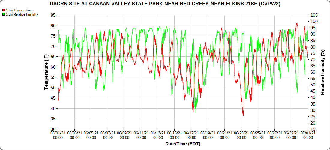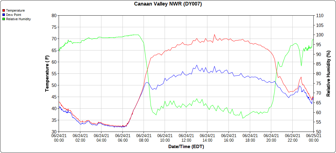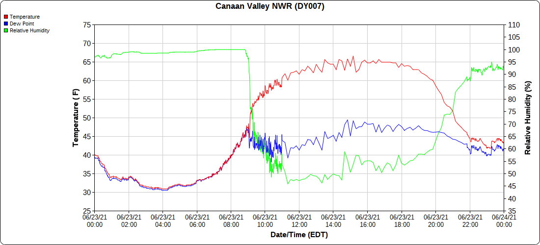 Dy007-Canaan Valley Refuge 3150′, Dy002-Cabin Mt at Bald Knob 4350′, Dy003-Cabin Mt-Western Sods 4035′, Dy004-Spruce Knob 4820′, Cvpw2-Climate Reference Network Canaan 3479′, KW99-Petersburg Grant County Airport 961′