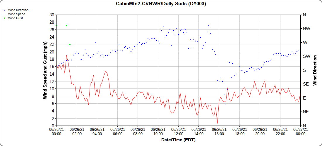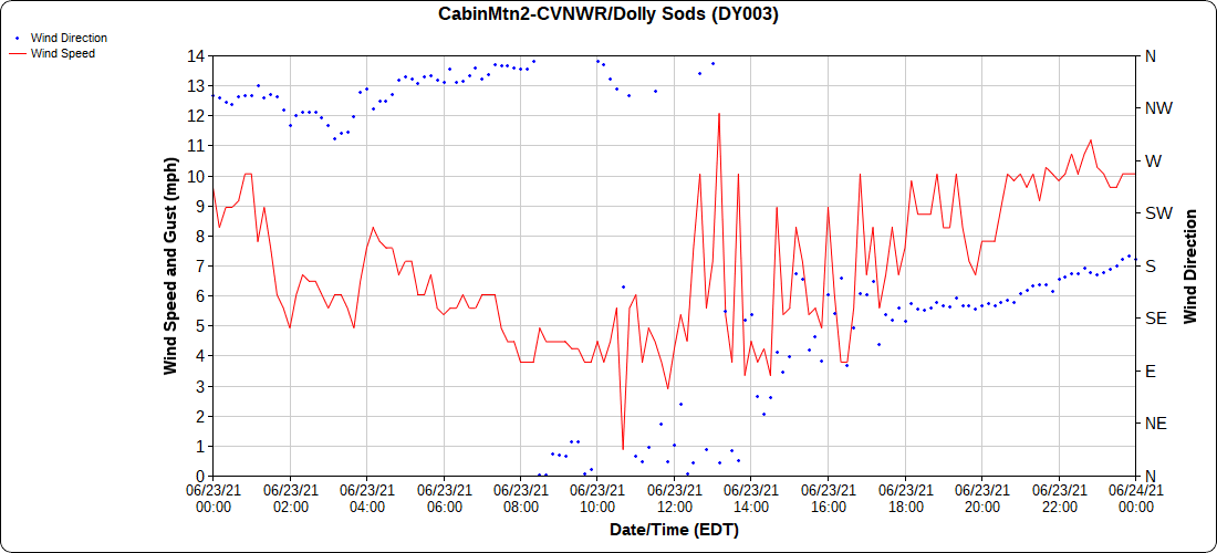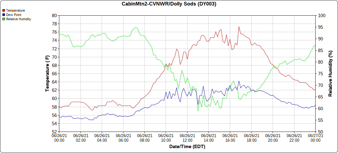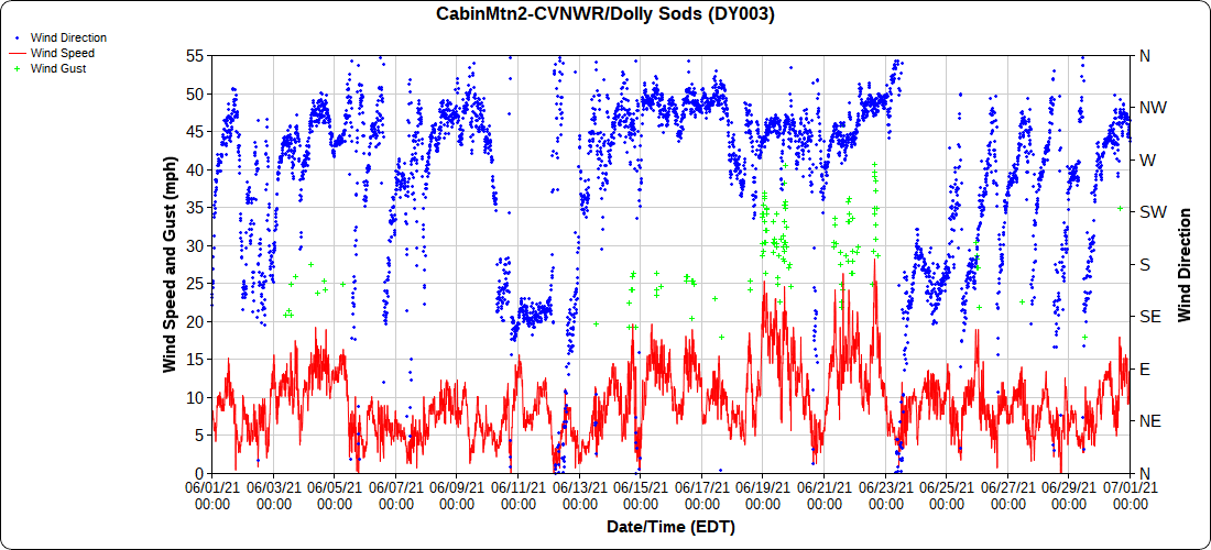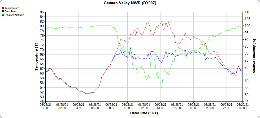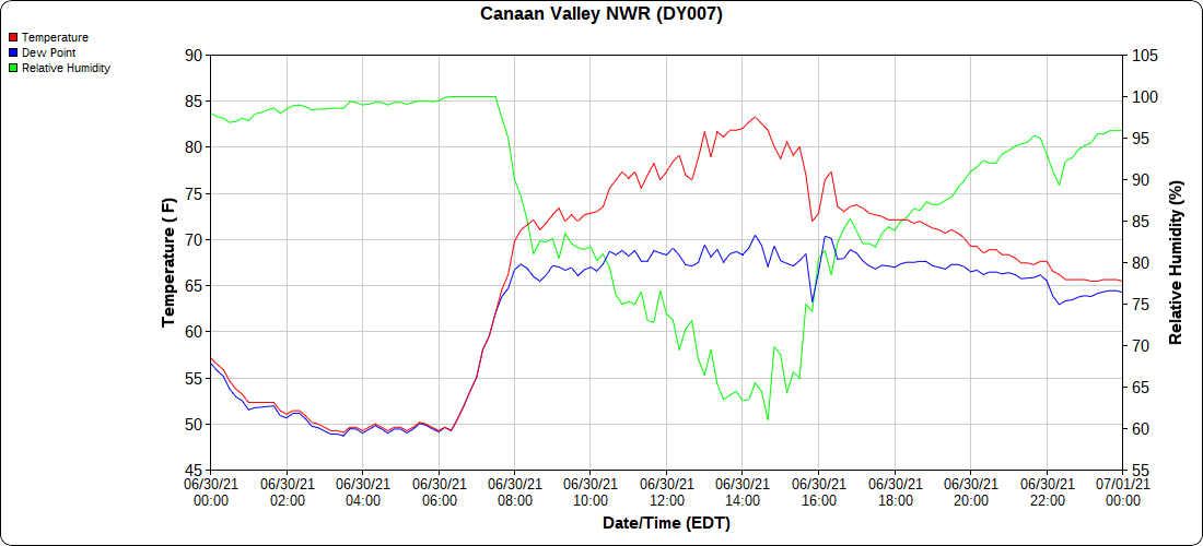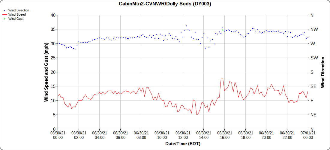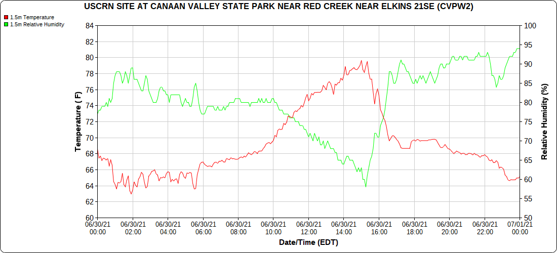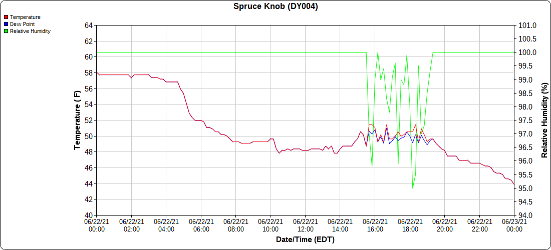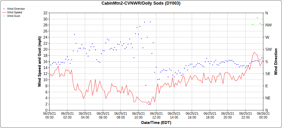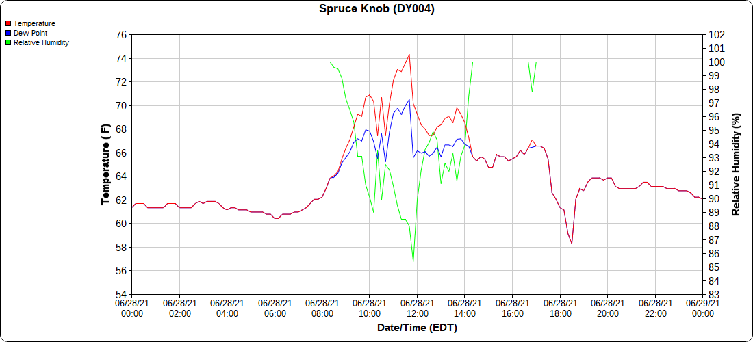 Dy007-Canaan Valley Refuge 3150′, Dy002-Cabin Mt at Bald Knob 4350′, Dy003-Cabin Mt-Western Sods 4035′, Dy004-Spruce Knob 4820′, Cvpw2-Climate Reference Network Canaan 3479′, KW99-Petersburg Grant County Airport 961′