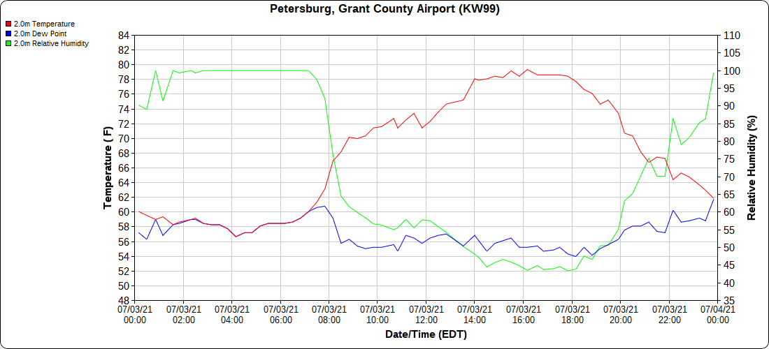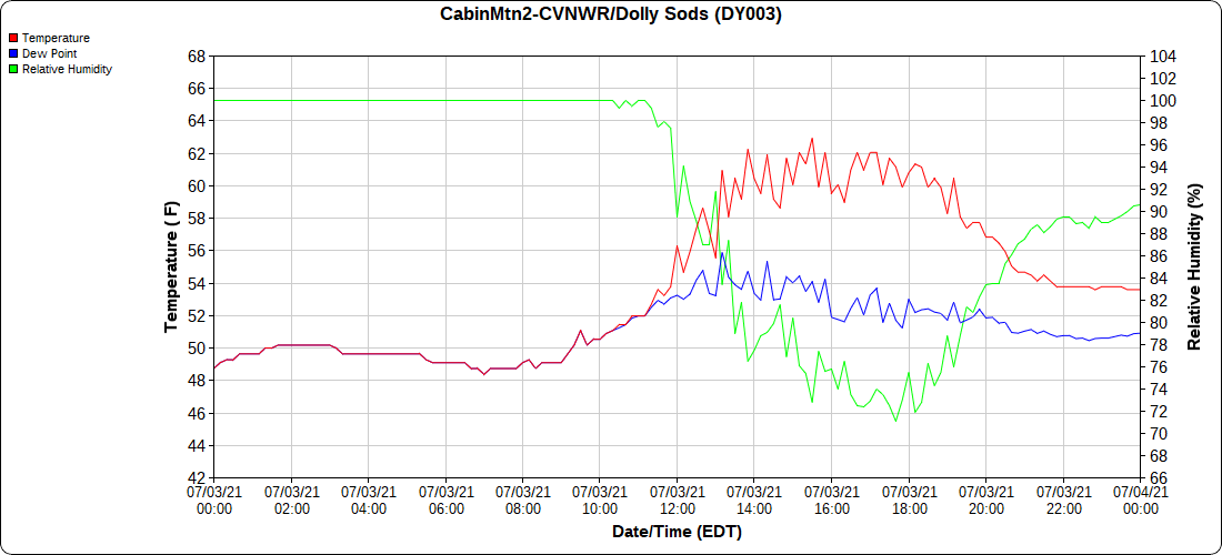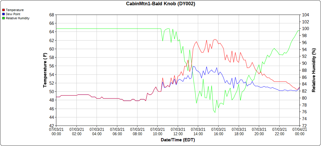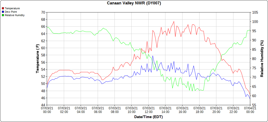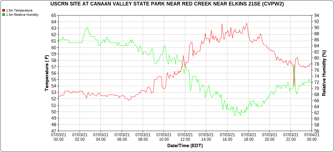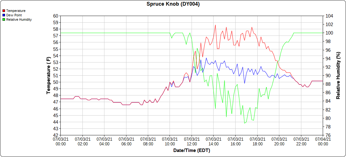Dy007-Canaan Valley Refuge 3150′, Dy002-Cabin Mt at Bald Knob 4350′, Dy003-Cabin Mt-Western Sods 4035′, Dy004-Spruce Knob 4820′, Cvpw2-Climate Reference Network Canaan 3479′, KW99-Petersburg Grant County Airport 961′
