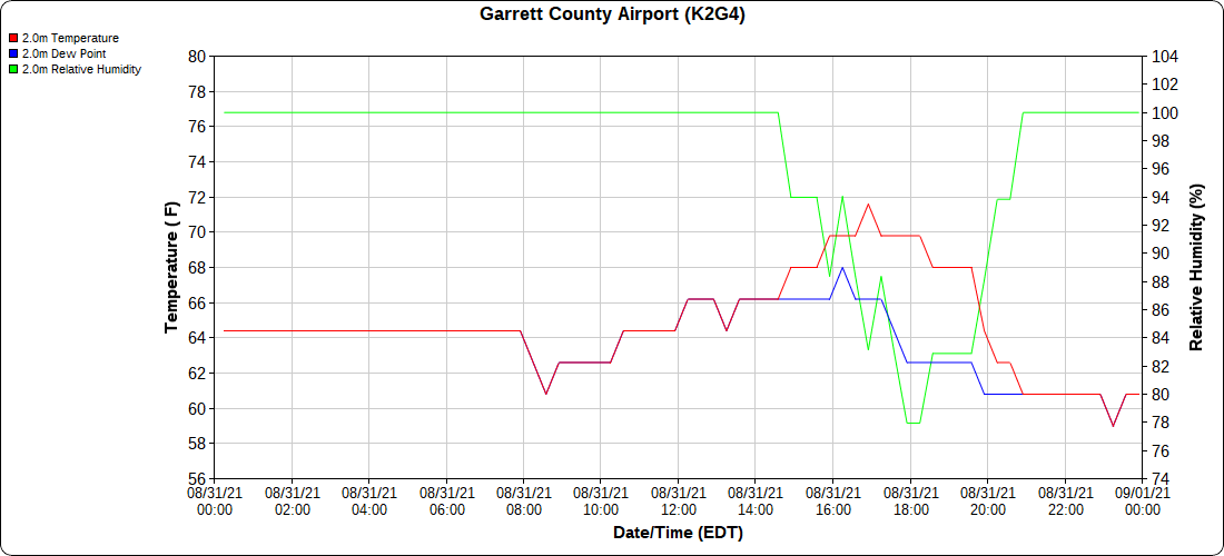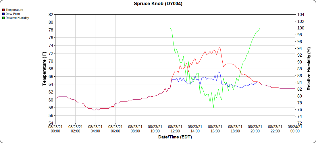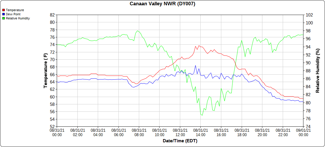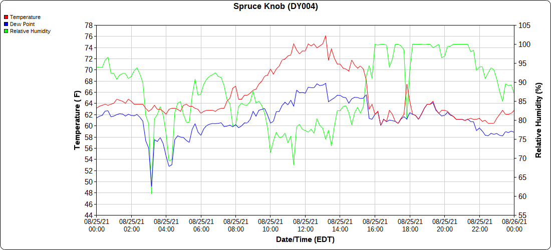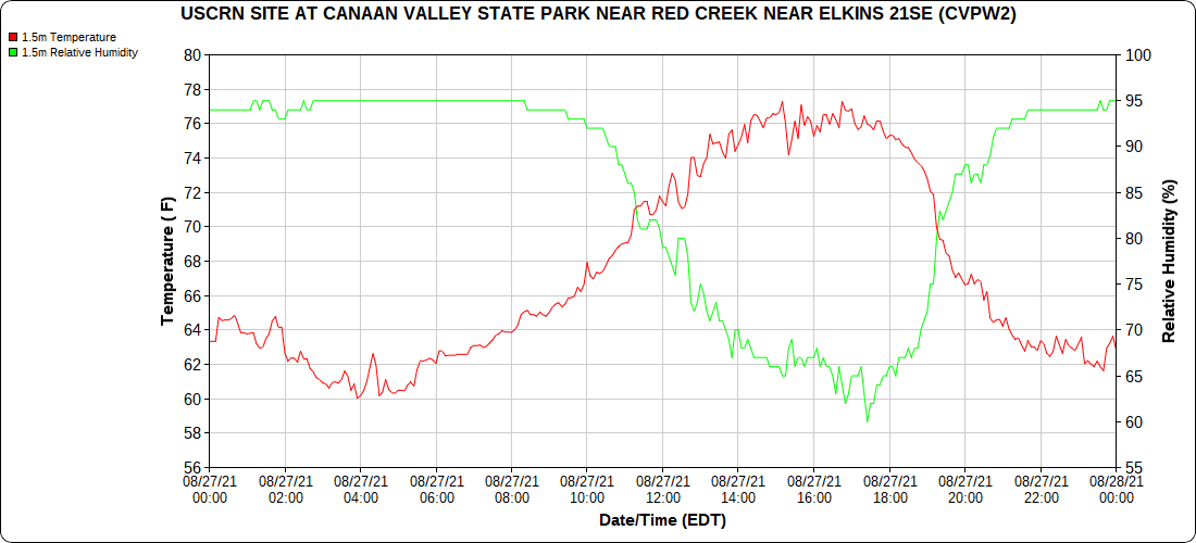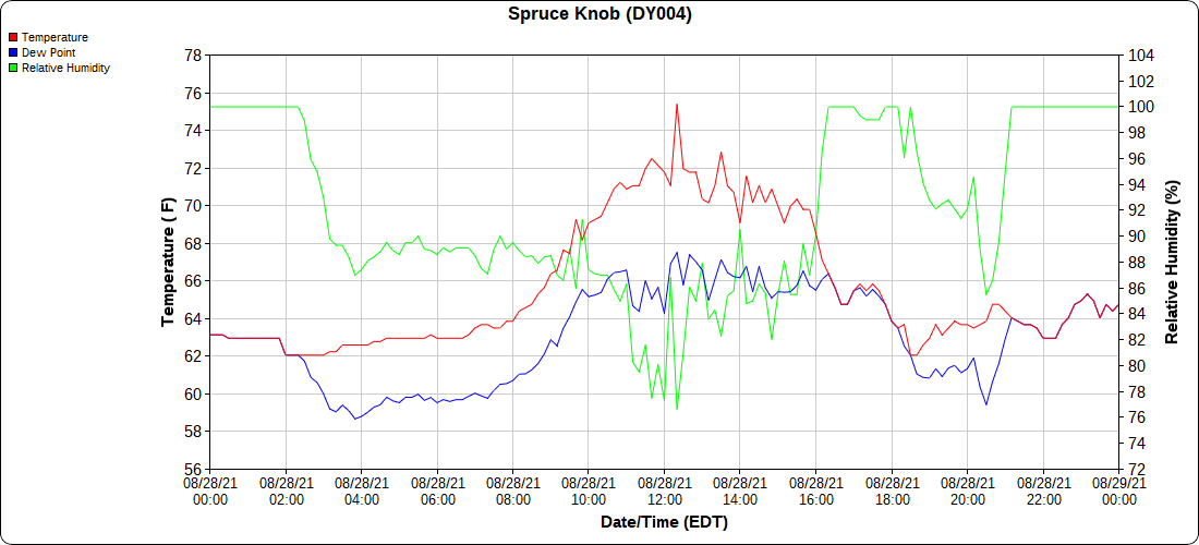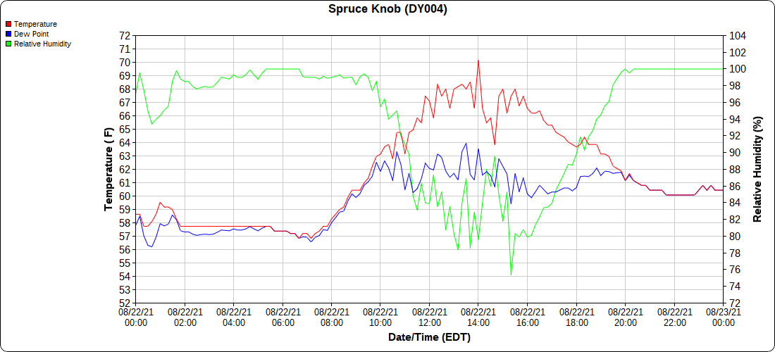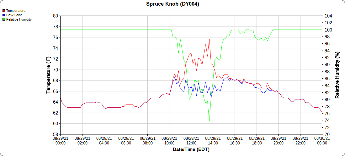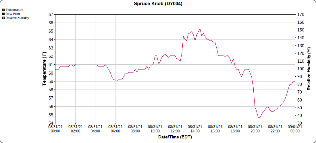 Dy007-Canaan Valley Refuge 3150′, Dy002-Cabin Mt at Bald Knob 4350′, Dy003-Cabin Mt-Western Sods 4035′, Dy004-Spruce Knob 4820′, Cvpw2-Climate Reference Network Canaan 3479′, KW99-Petersburg Grant County Airport 961′, K2G4 Garrett County Airport 2933′, KCBE Cumberland Airport 774′