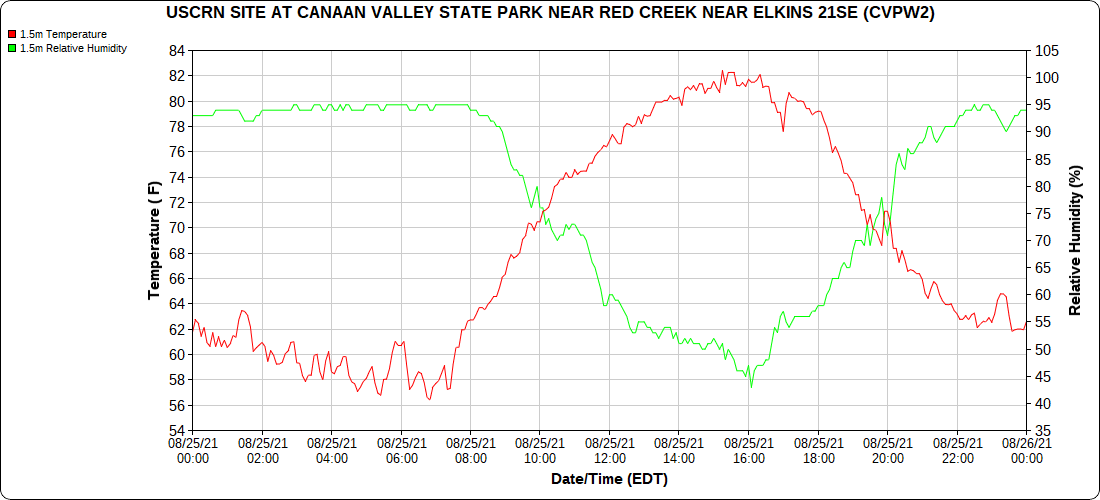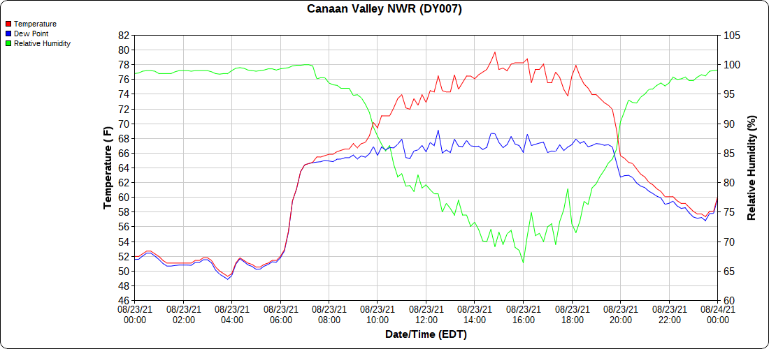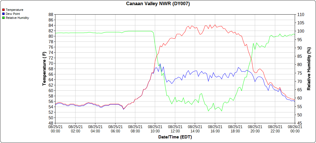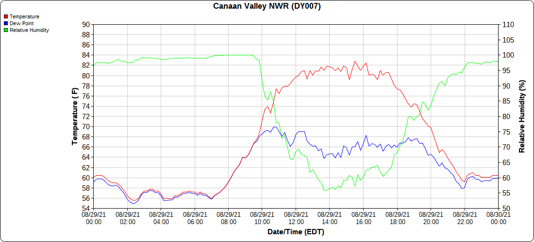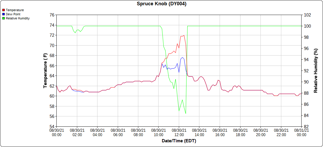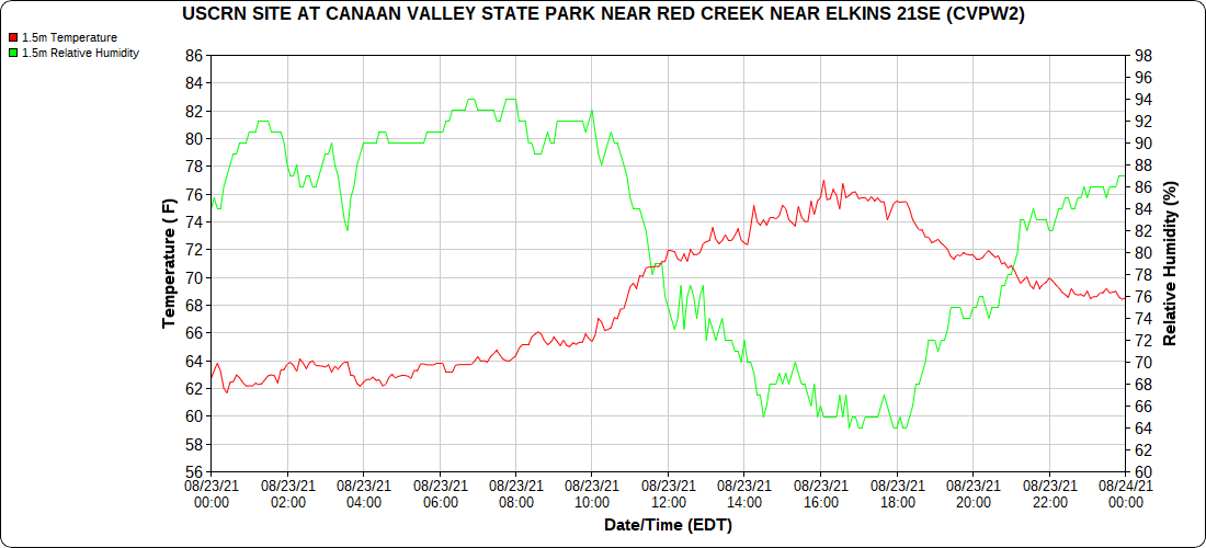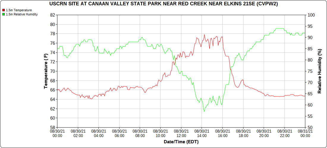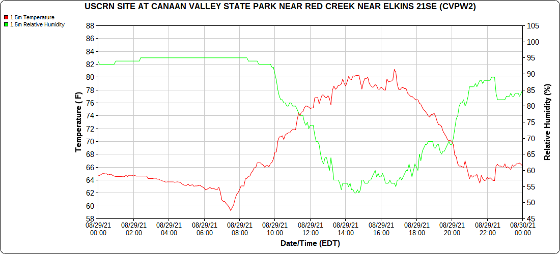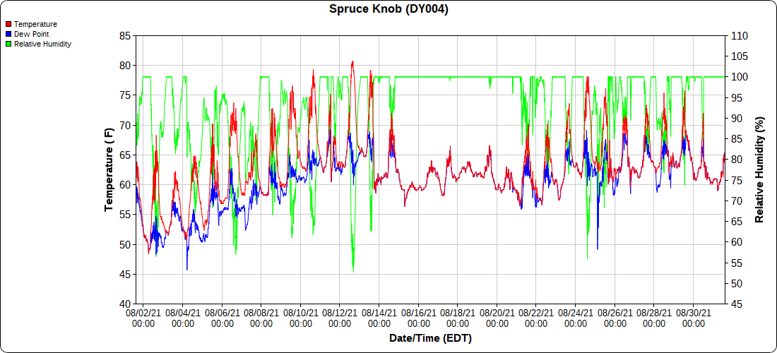 Dy007-Canaan Valley Refuge 3150′, Dy002-Cabin Mt at Bald Knob 4350′, Dy003-Cabin Mt-Western Sods 4035′, Dy004-Spruce Knob 4820′, Cvpw2-Climate Reference Network Canaan 3479′, KW99-Petersburg Grant County Airport 961′, K2G4 Garrett County Airport 2933′, KCBE Cumberland Airport 774′