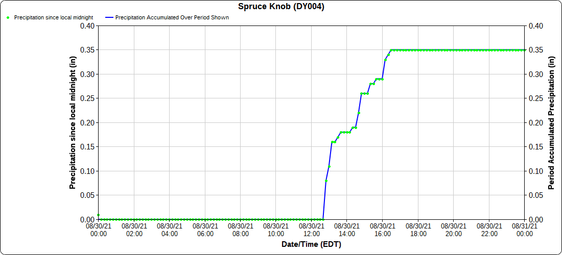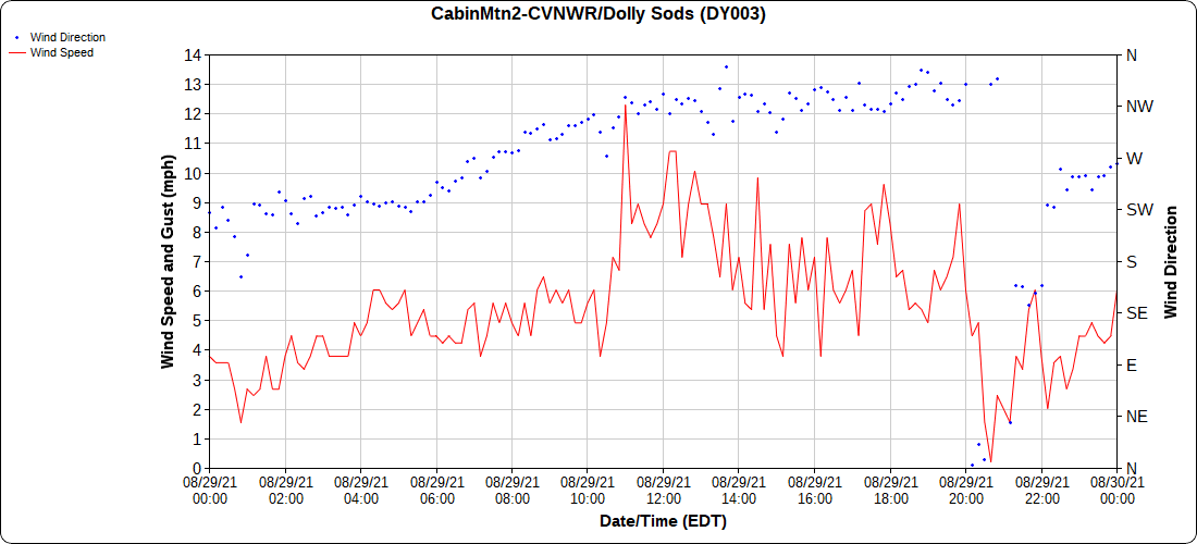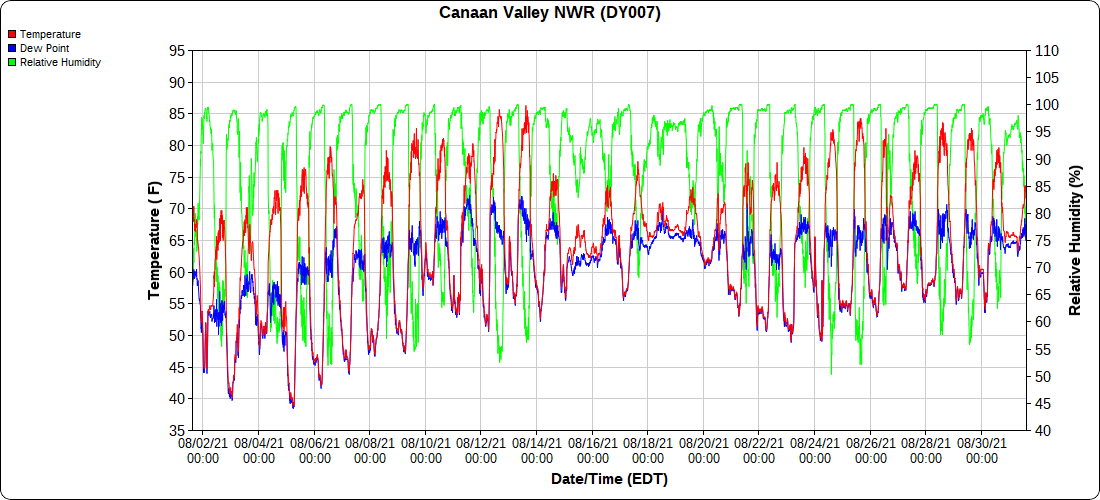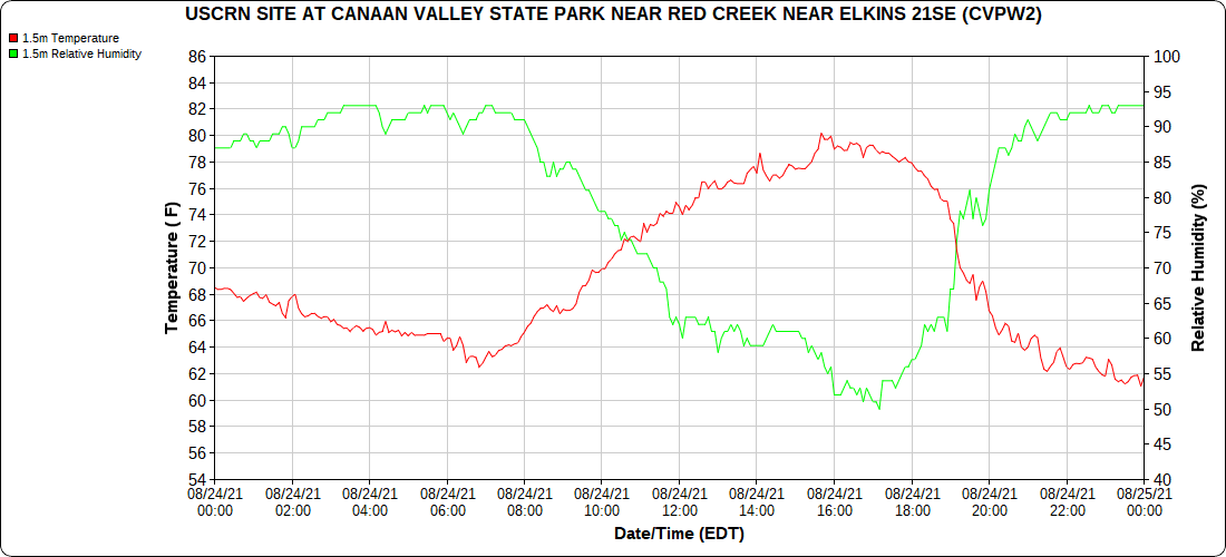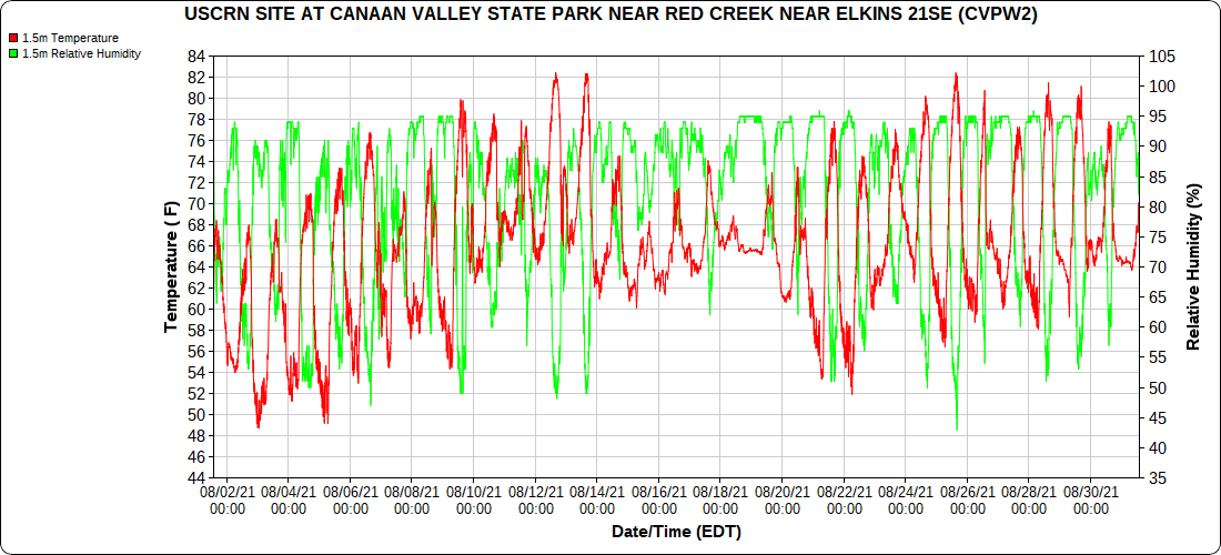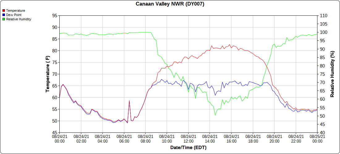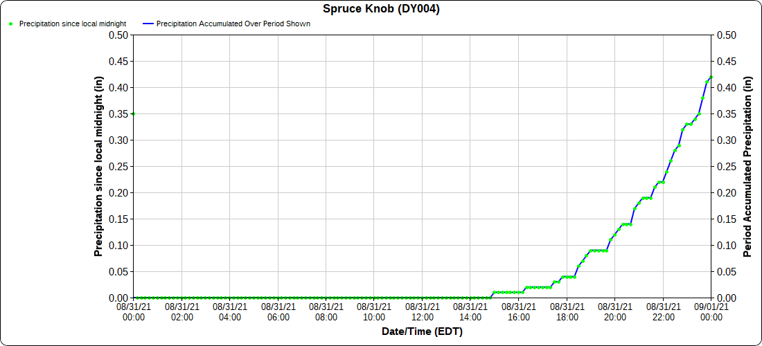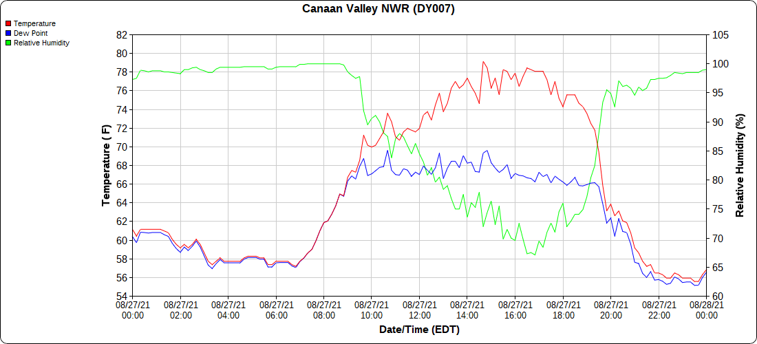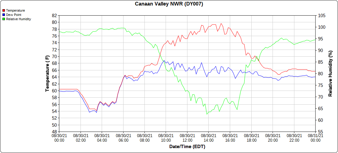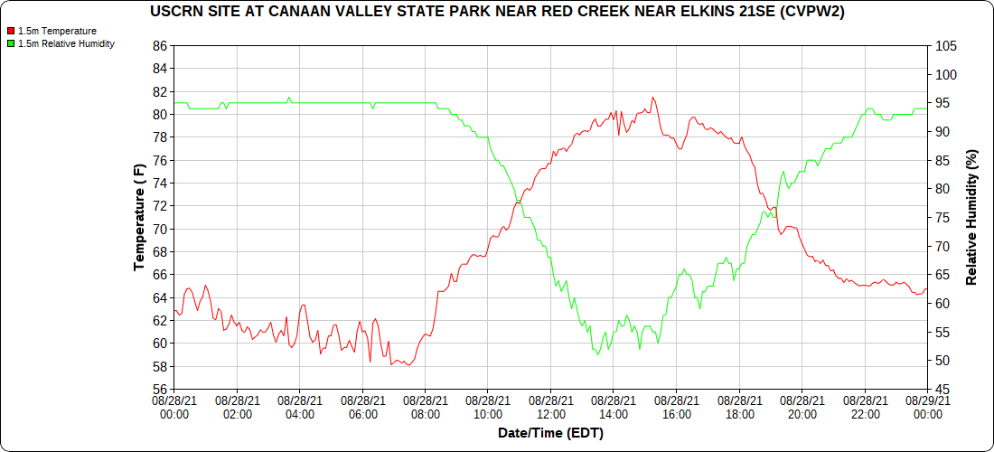Dy007-Canaan Valley Refuge 3150′, Dy002-Cabin Mt at Bald Knob 4350′, Dy003-Cabin Mt-Western Sods 4035′, Dy004-Spruce Knob 4820′, Cvpw2-Climate Reference Network Canaan 3479′, KW99-Petersburg Grant County Airport 961′, K2G4 Garrett County Airport 2933′, KCBE Cumberland Airport 774′