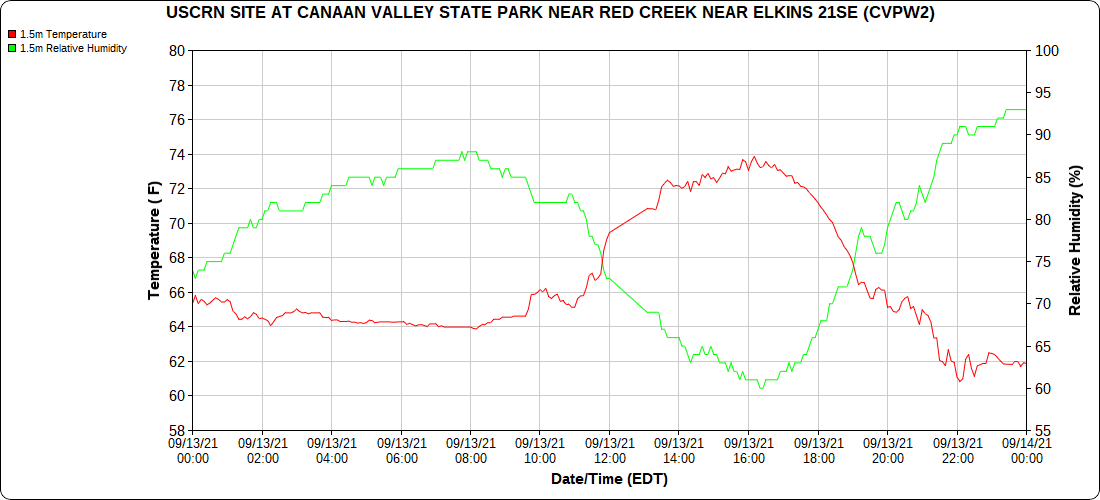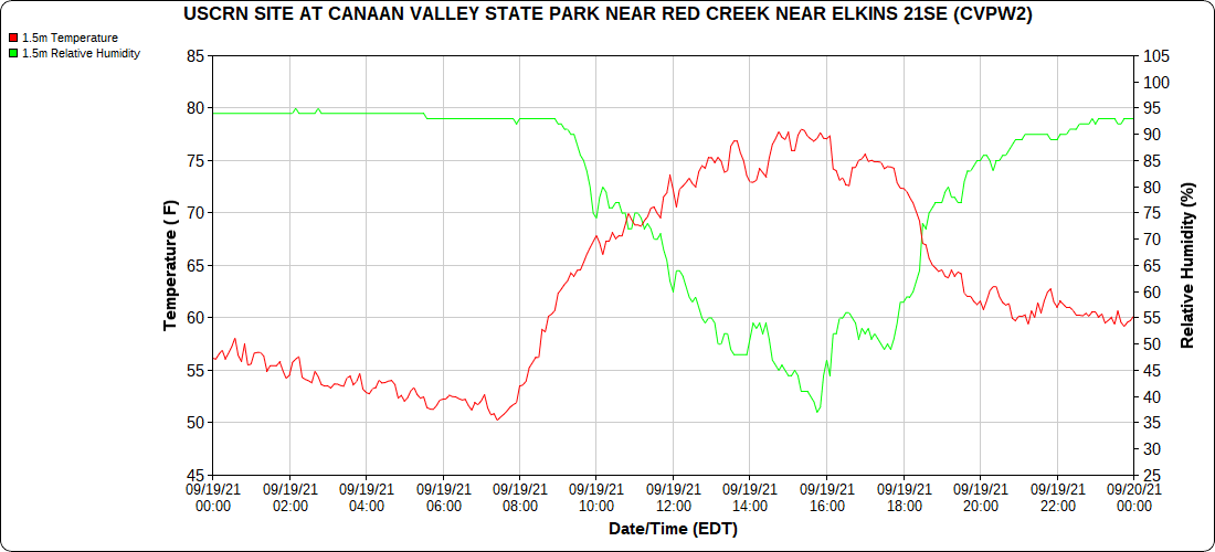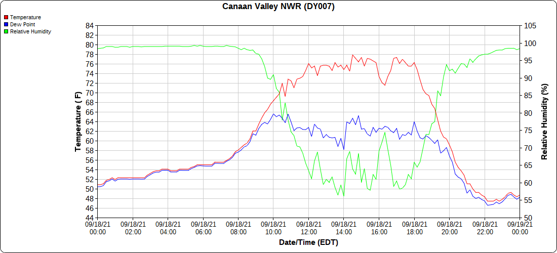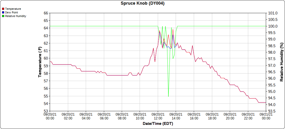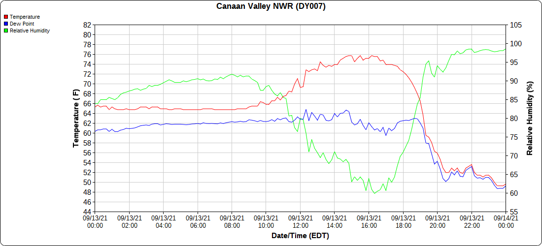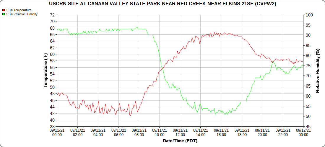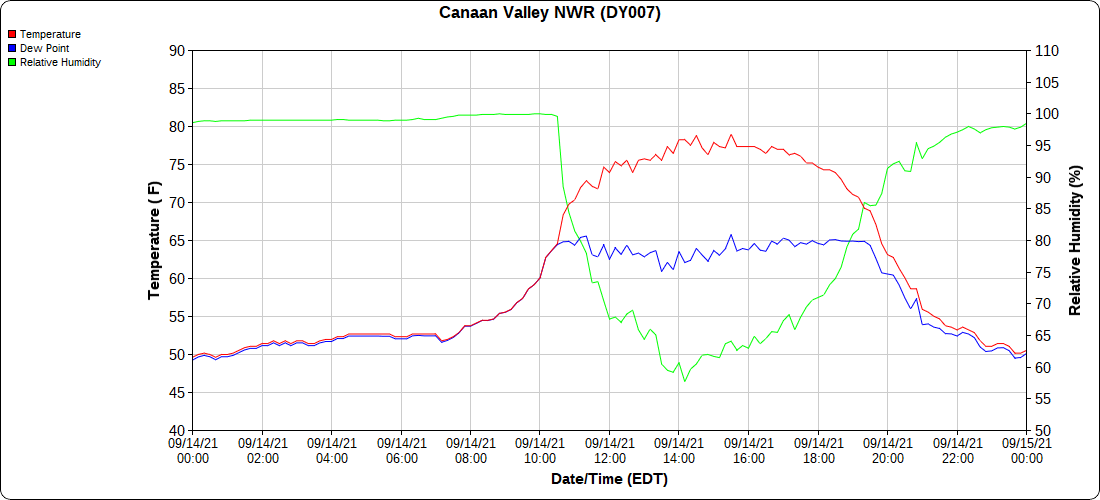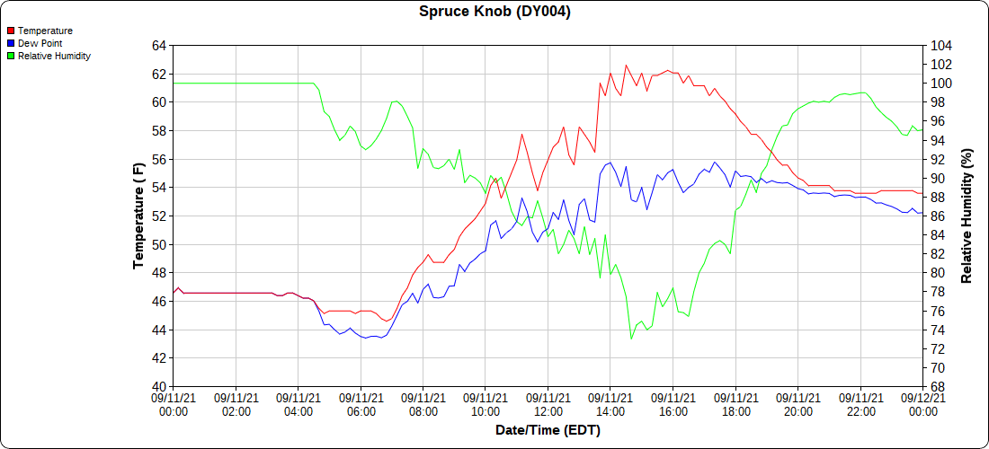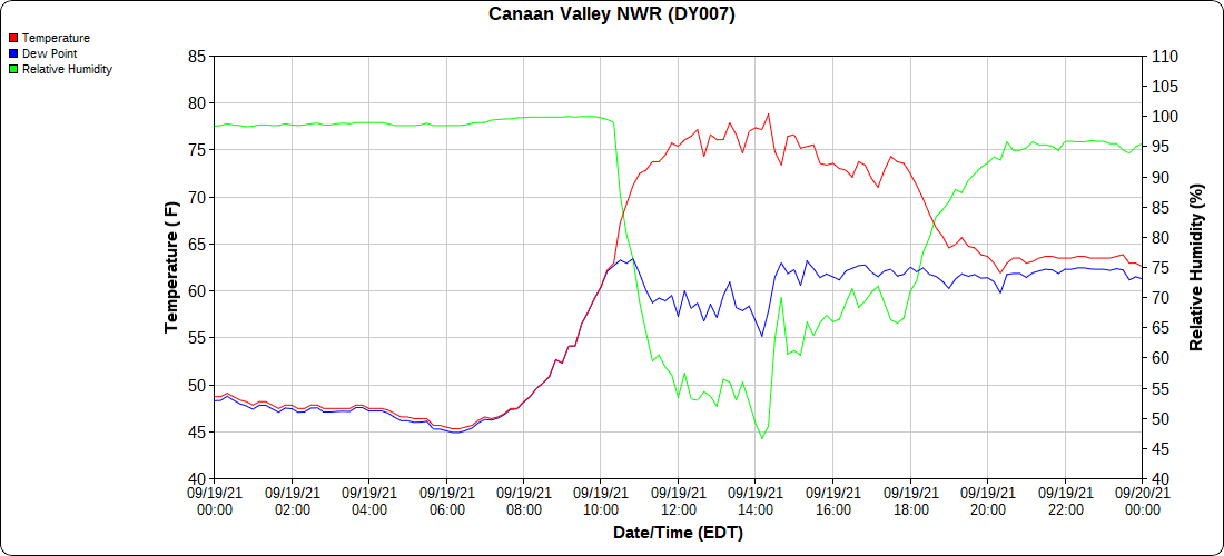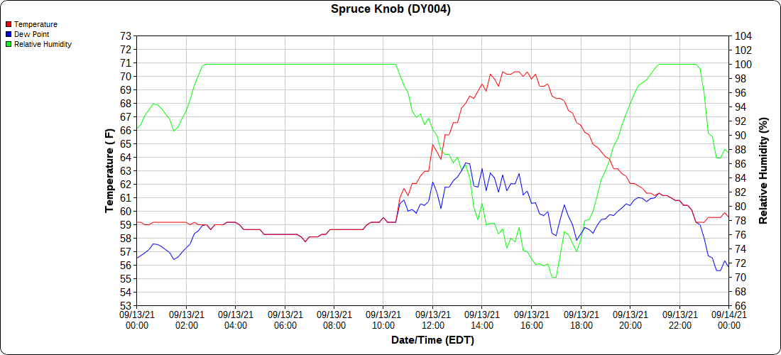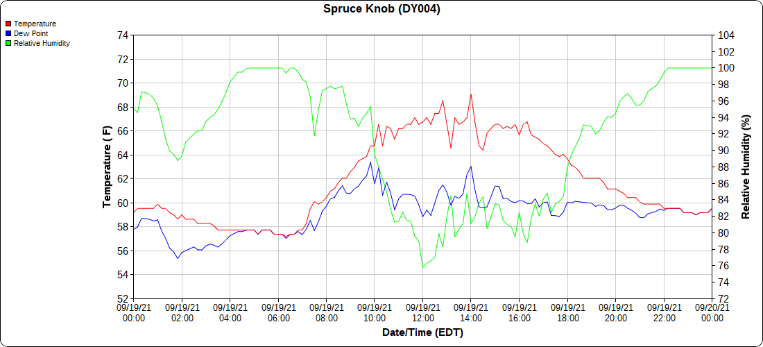 Dy007-Canaan Valley Refuge 3150′, Dy002-Cabin Mt at Bald Knob 4350′, Dy003-Cabin Mt-Western Sods 4035′, Dy004-Spruce Knob 4820′, Cvpw2-Climate Reference Network Canaan 3479′, KW99-Petersburg Grant County Airport 961′, K2G4 Garrett County Airport 2933′, KCBE Cumberland Airport 774′