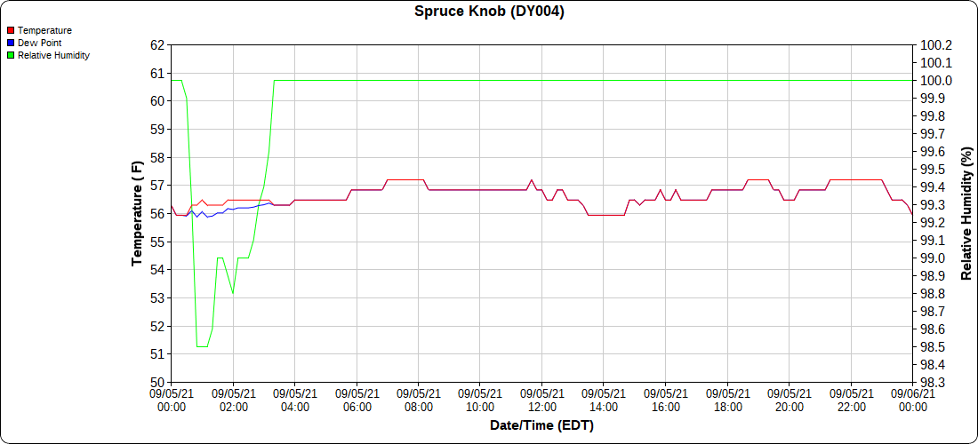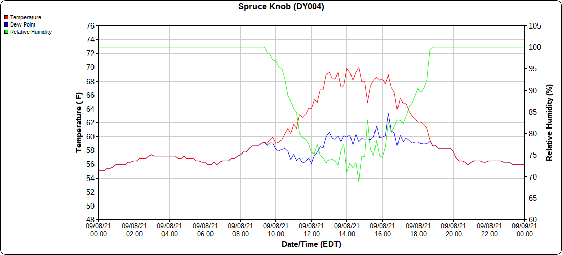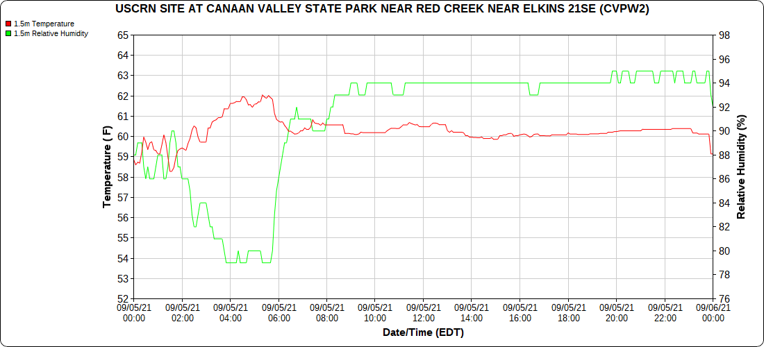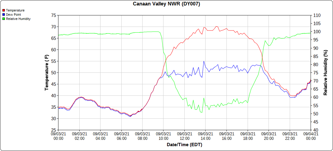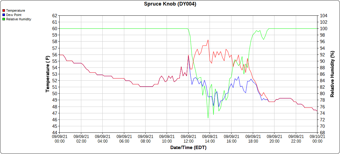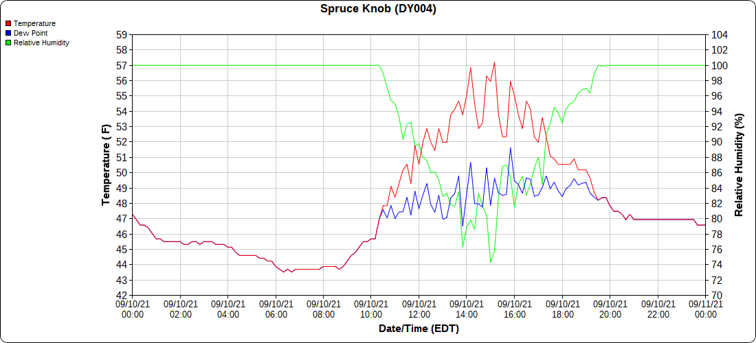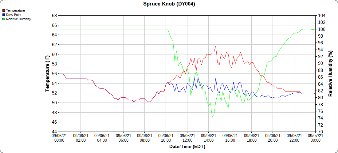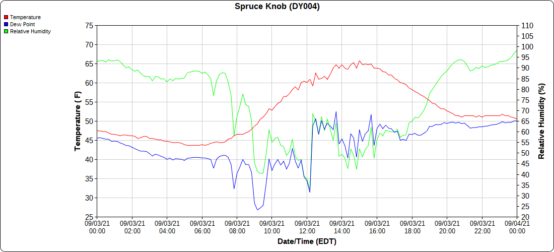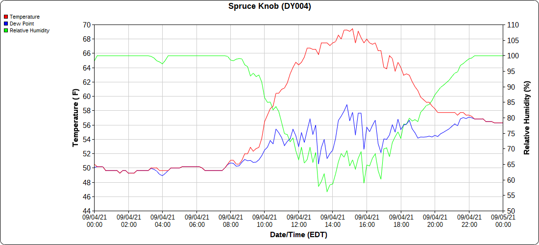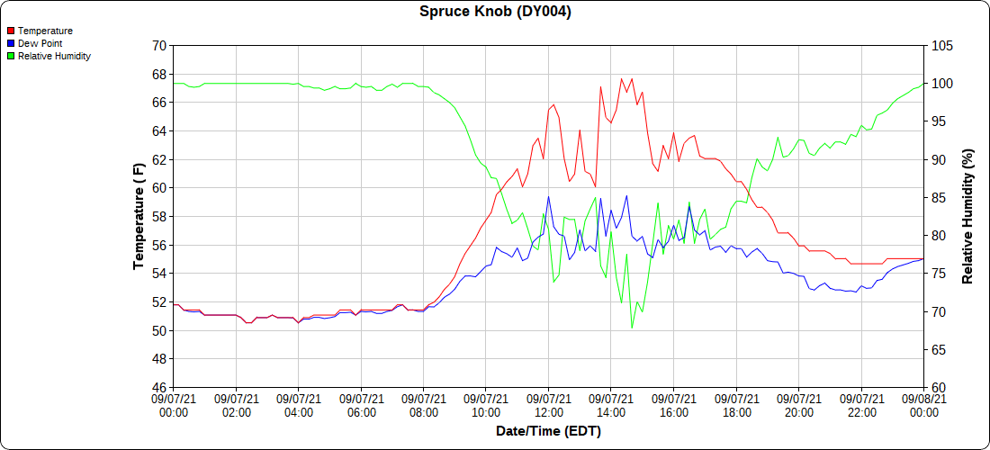 Dy007-Canaan Valley Refuge 3150′, Dy002-Cabin Mt at Bald Knob 4350′, Dy003-Cabin Mt-Western Sods 4035′, Dy004-Spruce Knob 4820′, Cvpw2-Climate Reference Network Canaan 3479′, KW99-Petersburg Grant County Airport 961′, K2G4 Garrett County Airport 2933′, KCBE Cumberland Airport 774′