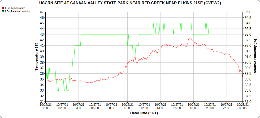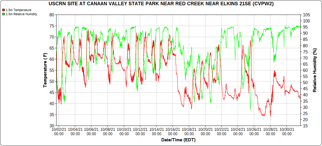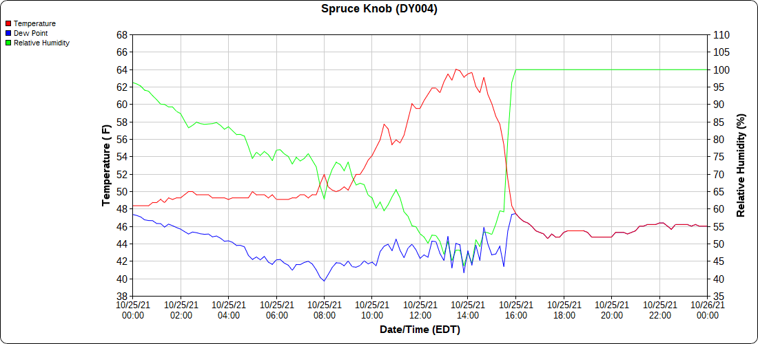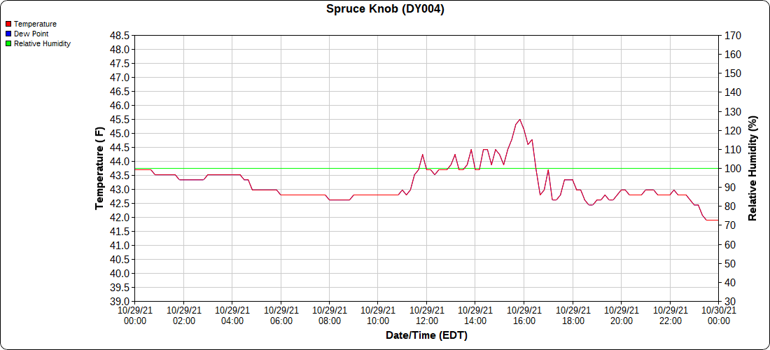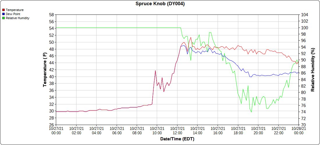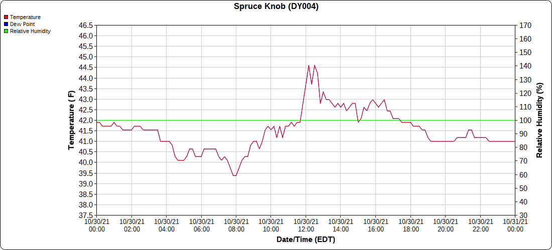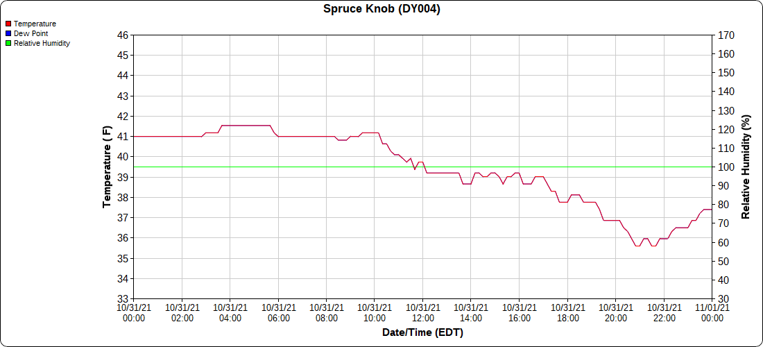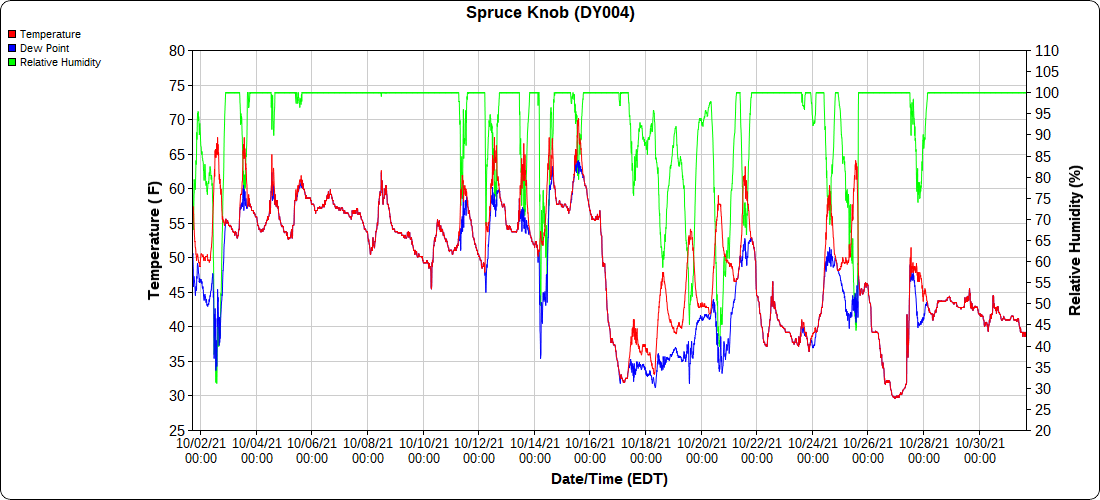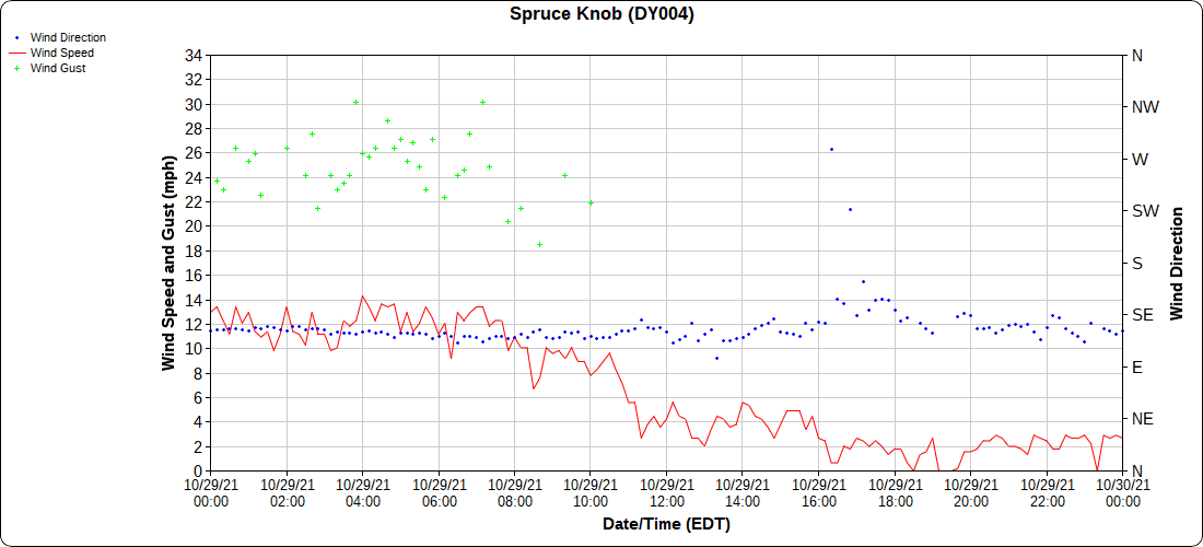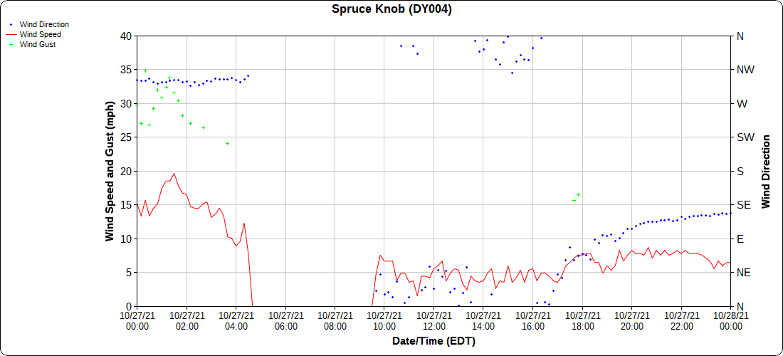 Dy007-Canaan Valley Refuge 3150′, Dy002-Cabin Mt at Bald Knob 4350′, Dy003-Cabin Mt-Western Sods 4035′, Dy004-Spruce Knob 4820′, Cvpw2-Climate Reference Network Canaan 3479′, KW99-Petersburg Grant County Airport 961′, K2G4 Garrett County Airport 2933′, KCBE Cumberland Airport 774′, BDKW2 Bearden Knob