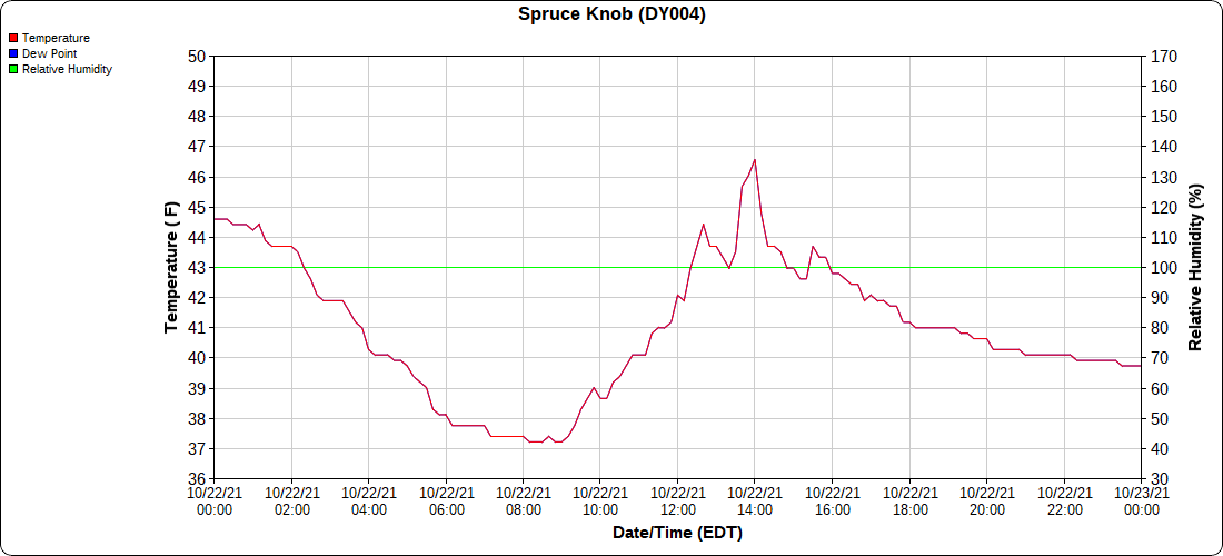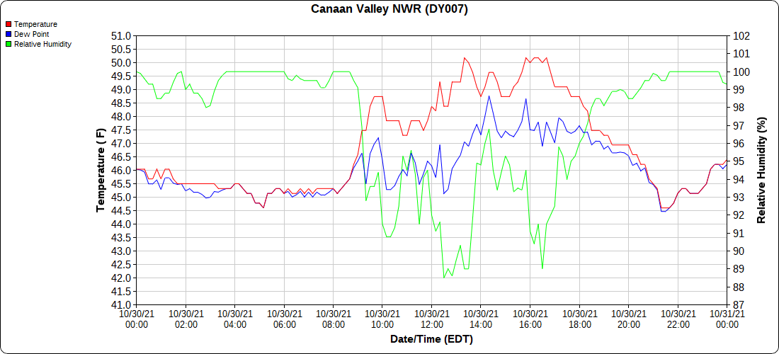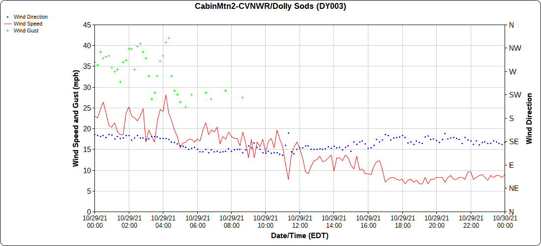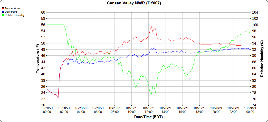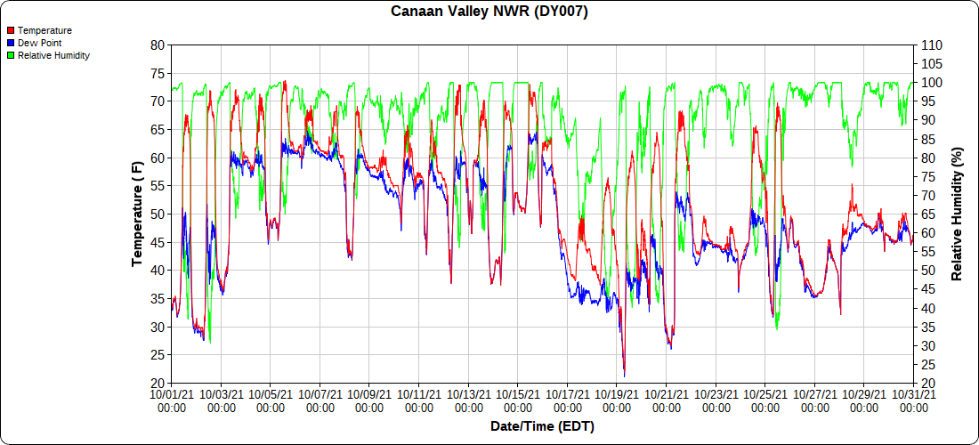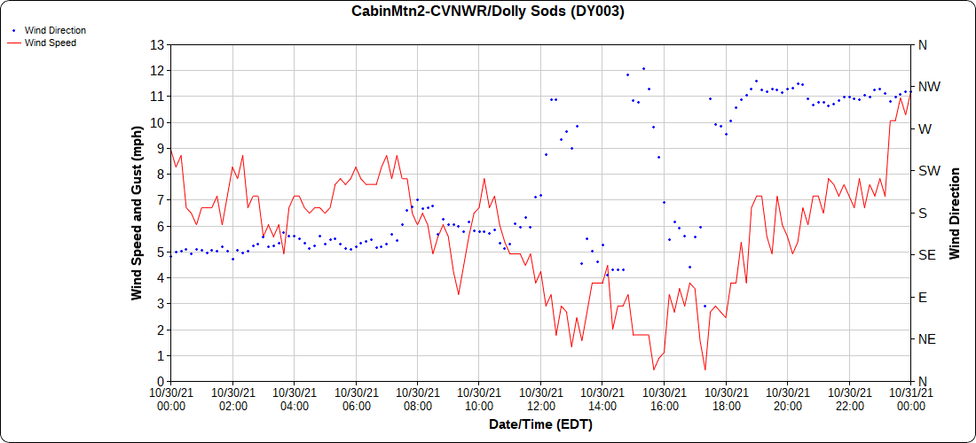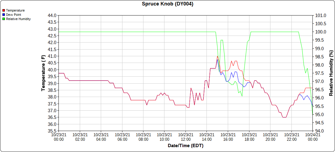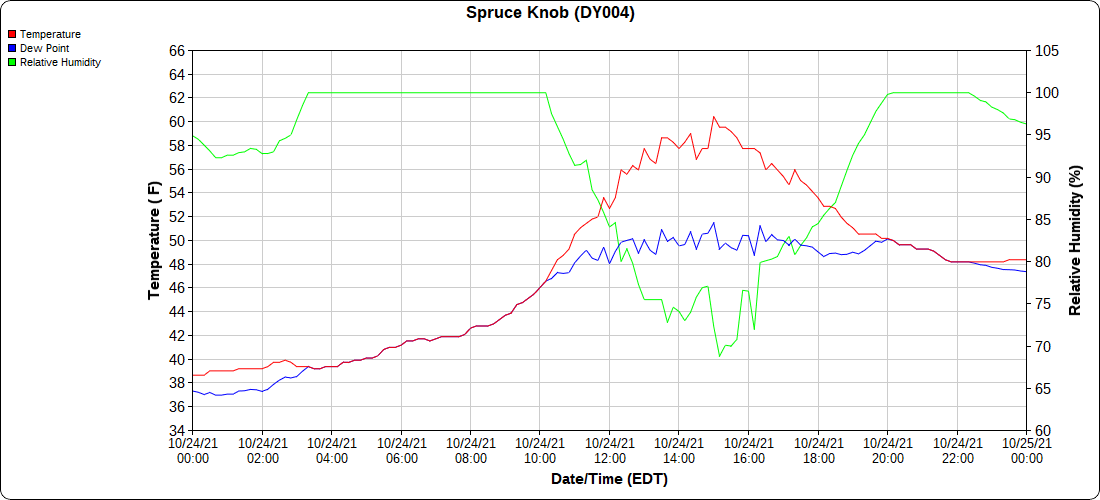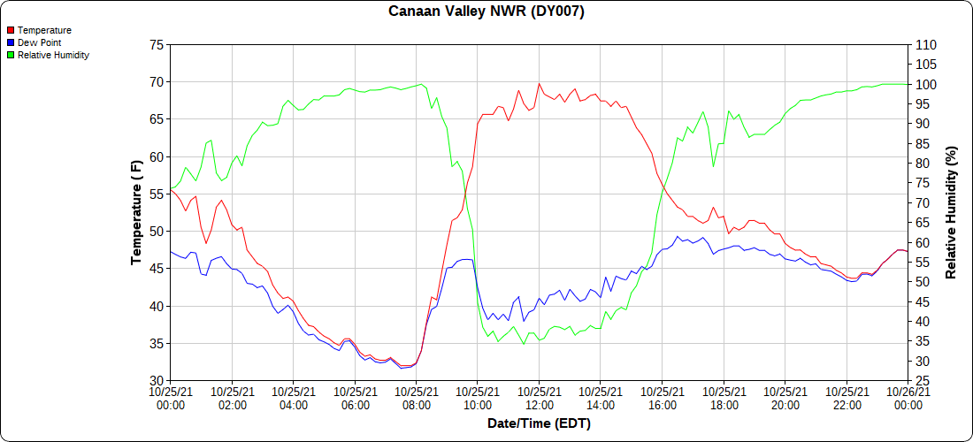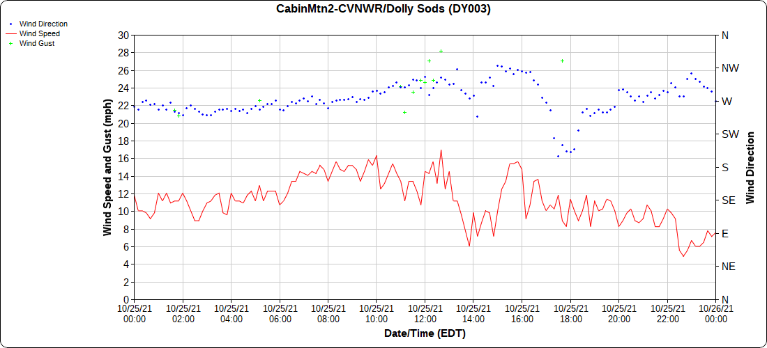 Dy007-Canaan Valley Refuge 3150′, Dy002-Cabin Mt at Bald Knob 4350′, Dy003-Cabin Mt-Western Sods 4035′, Dy004-Spruce Knob 4820′, Cvpw2-Climate Reference Network Canaan 3479′, KW99-Petersburg Grant County Airport 961′, K2G4 Garrett County Airport 2933′, KCBE Cumberland Airport 774′, BDKW2 Bearden Knob