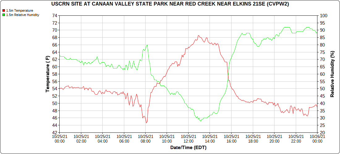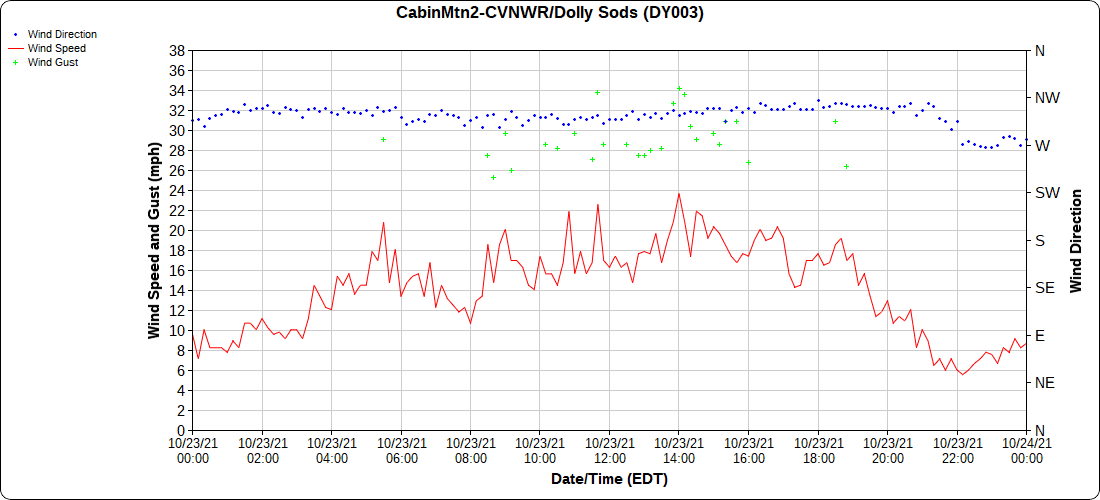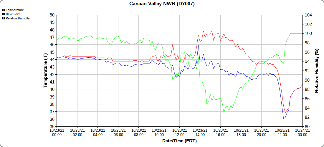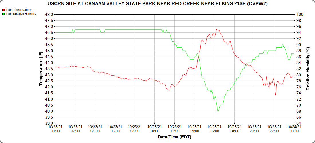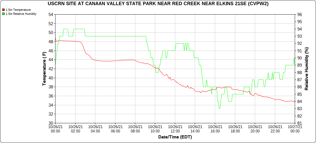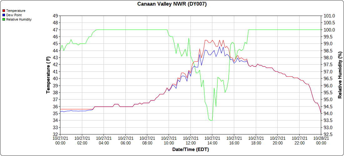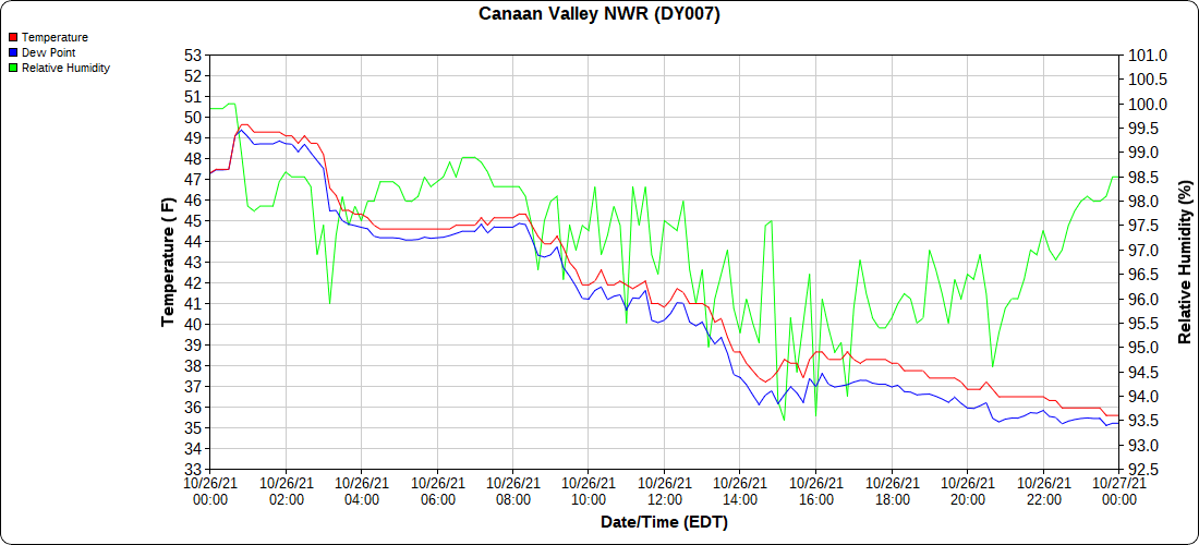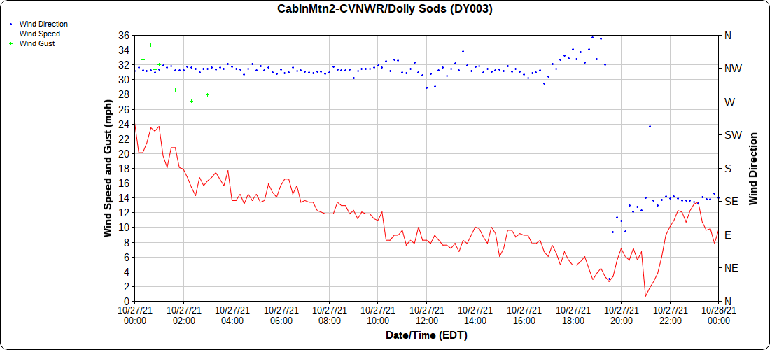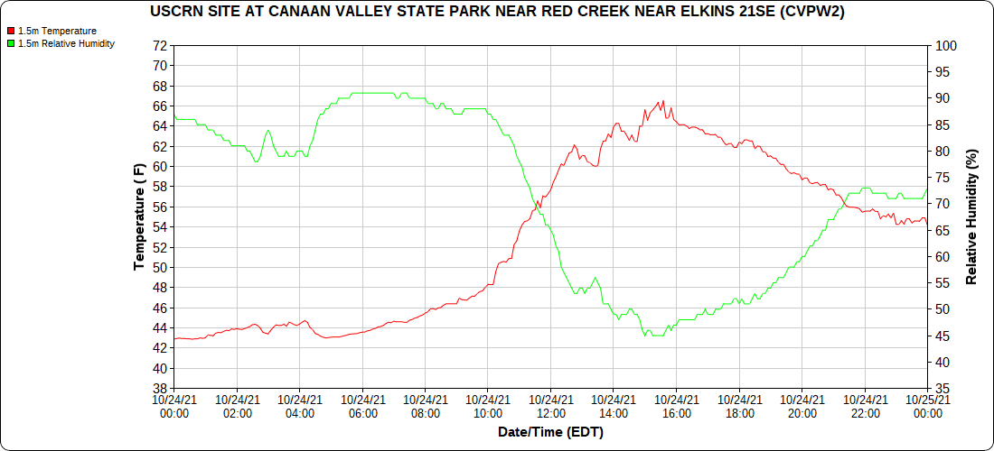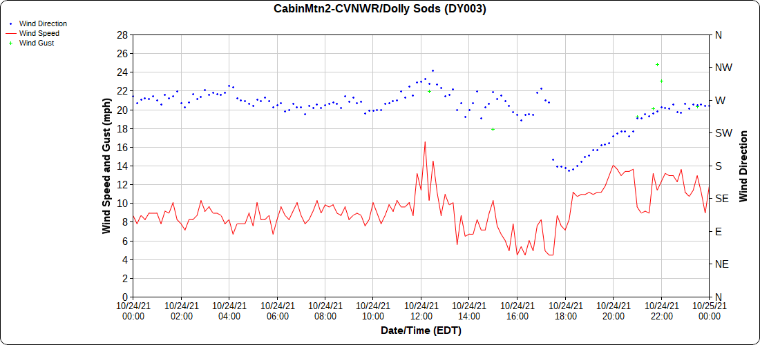 Dy007-Canaan Valley Refuge 3150′, Dy002-Cabin Mt at Bald Knob 4350′, Dy003-Cabin Mt-Western Sods 4035′, Dy004-Spruce Knob 4820′, Cvpw2-Climate Reference Network Canaan 3479′, KW99-Petersburg Grant County Airport 961′, K2G4 Garrett County Airport 2933′, KCBE Cumberland Airport 774′, BDKW2 Bearden Knob
